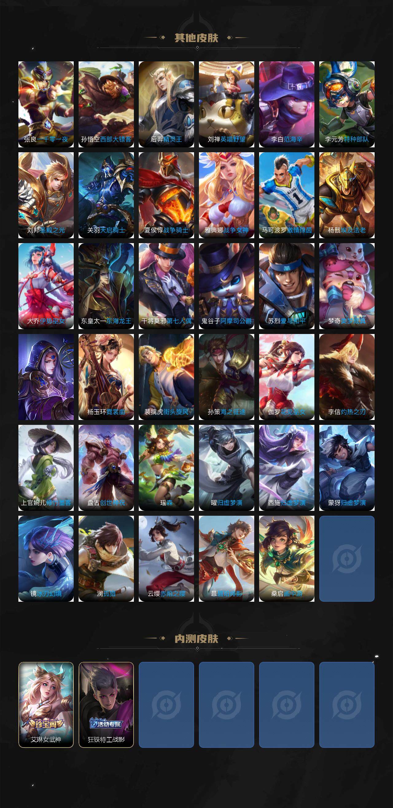 孙膑妖精王,扁鹊炼金王,虞姬凯尔特女王,白起狰,太乙真人饕餮,曹操烛龙,芈月重明,典韦穷奇,狂铁御狮,米莱狄御霄,牛魔御旌,盾山御銮,夏侯惇朔风刀,明世隐疑决卦,老夫子醍醐杖,鬼谷子原初探秘者,狄仁杰万华元夜,程咬金演武夺筹,钟馗驱傩正仪,苏烈千军破阵,吕布猎兽之王,嬴政白昼王子,女娲朔望之晖,钟馗神迹守卫,鲁班七号狮舞东方,沈梦溪星空之诺,李元芳银河之约,马可波罗暗影游猎,弈星混沌棋,达摩沙漠行僧,兰陵王金庭之子,沈梦溪大漠名商,李元芳云中旅人,桑启海盐诗旅,裴擒虎擒涛扼浪,鲁班大师探海日志,张良古海寻踪