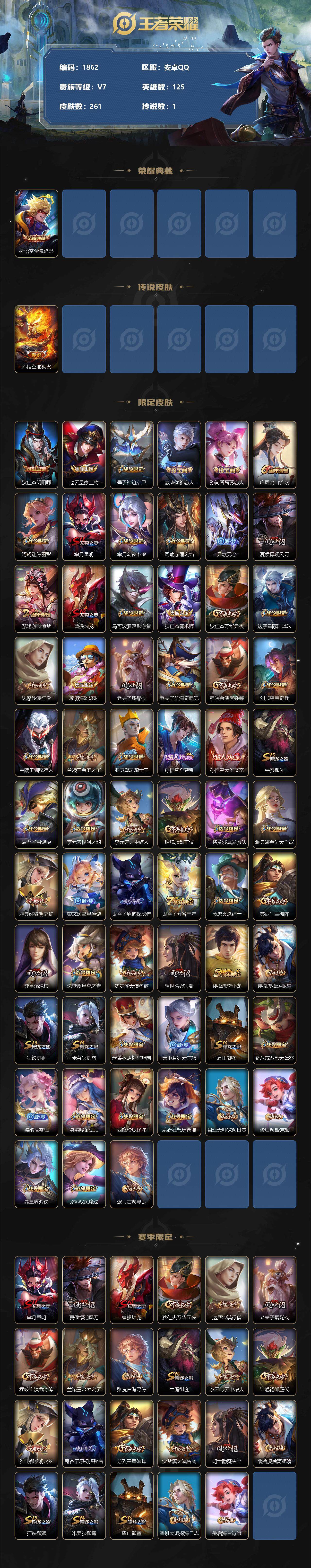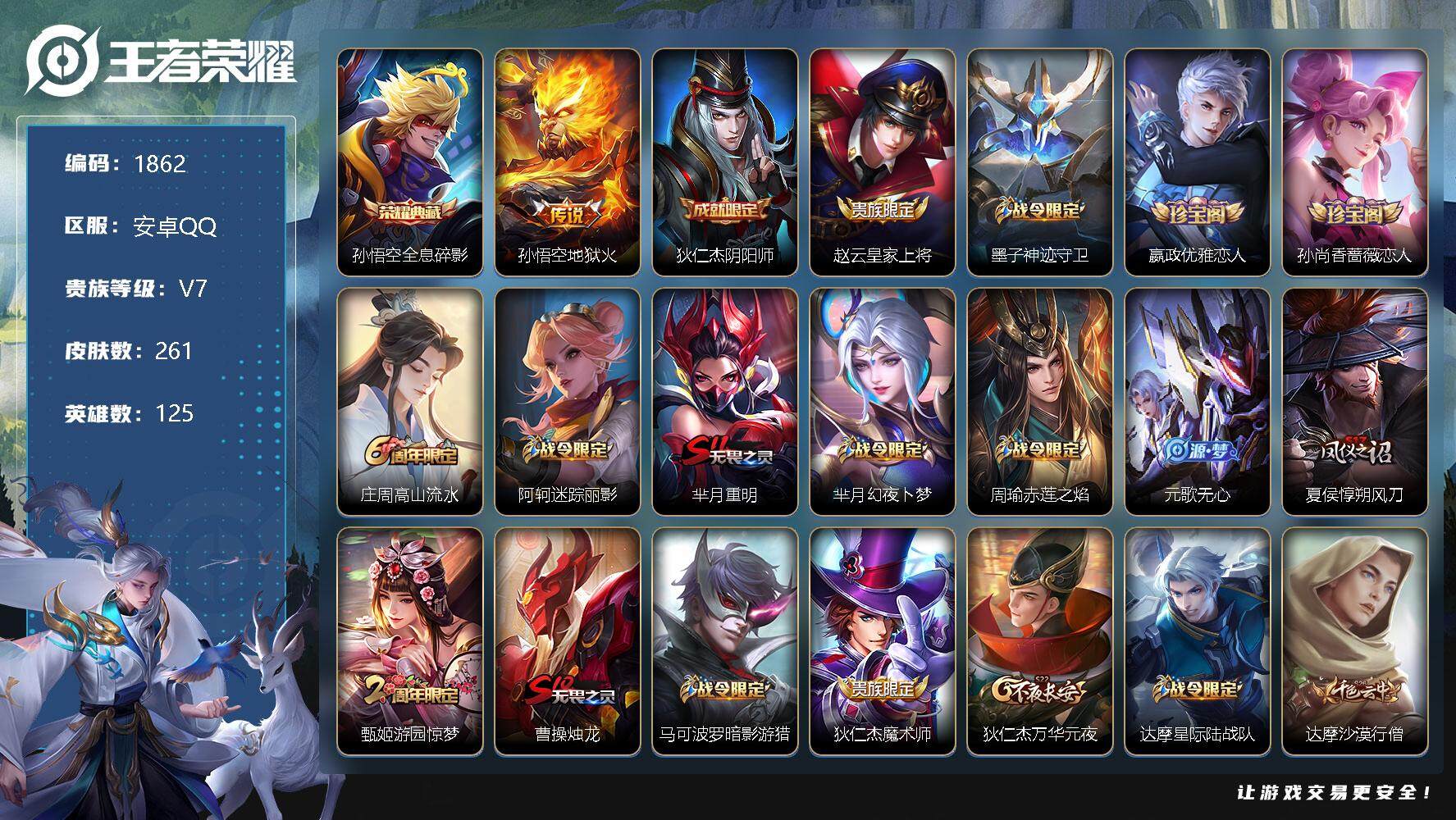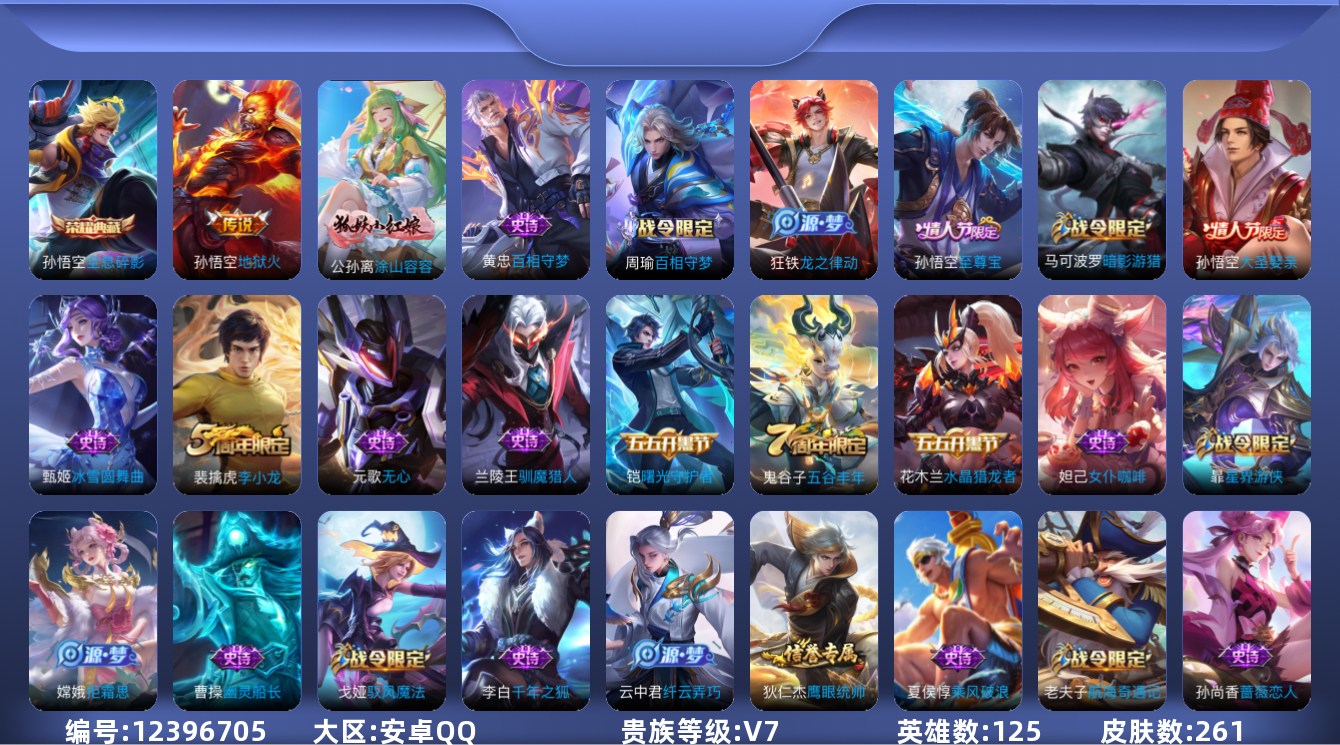 [12396705]【商品标题】:安卓Q-V7-至尊星耀II段位-125英雄-261皮肤-1典藏-0珍品无双-0无双-0珍品传说-1传说-57史诗