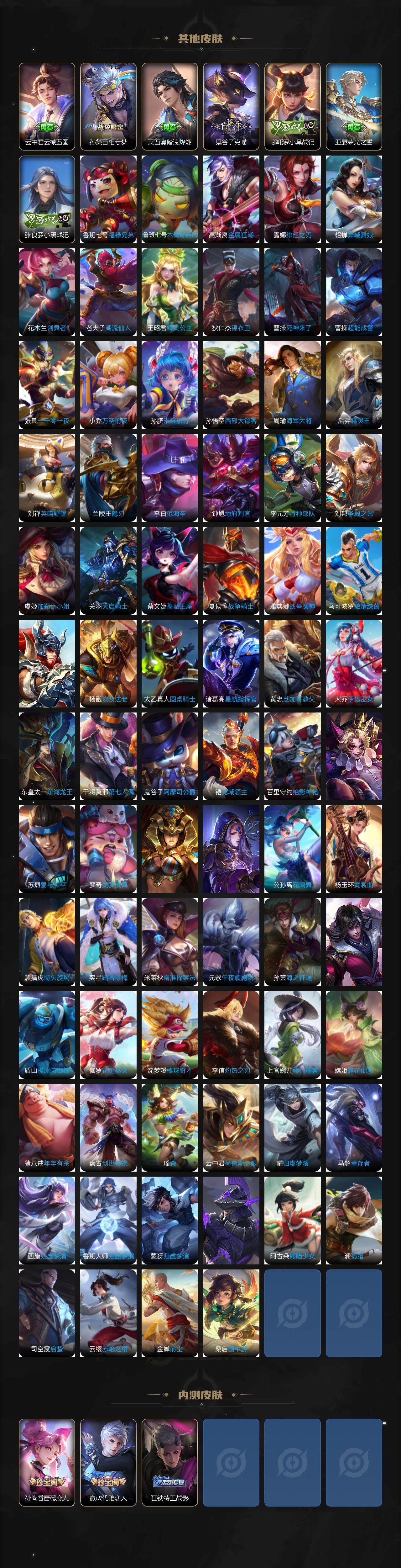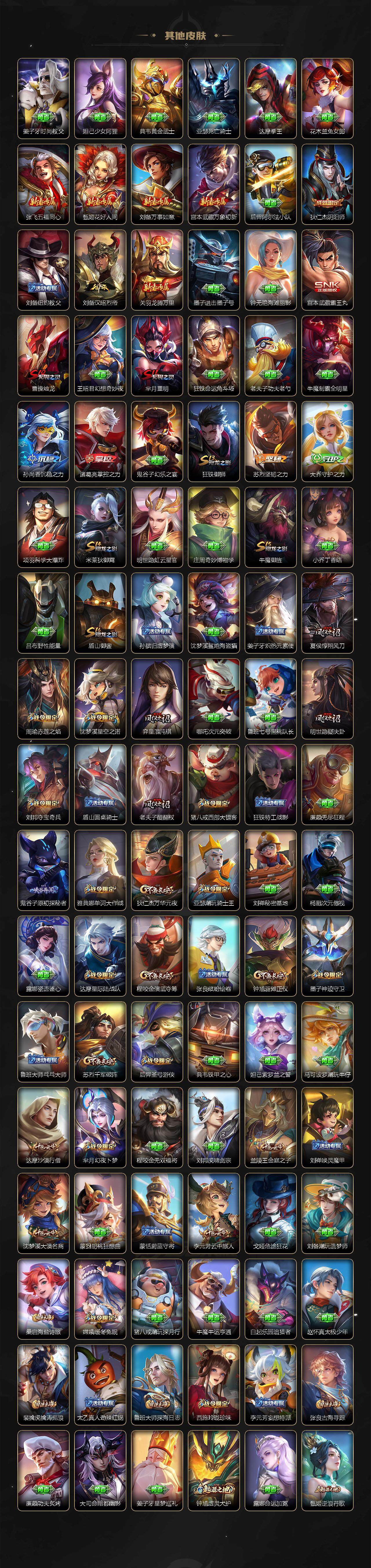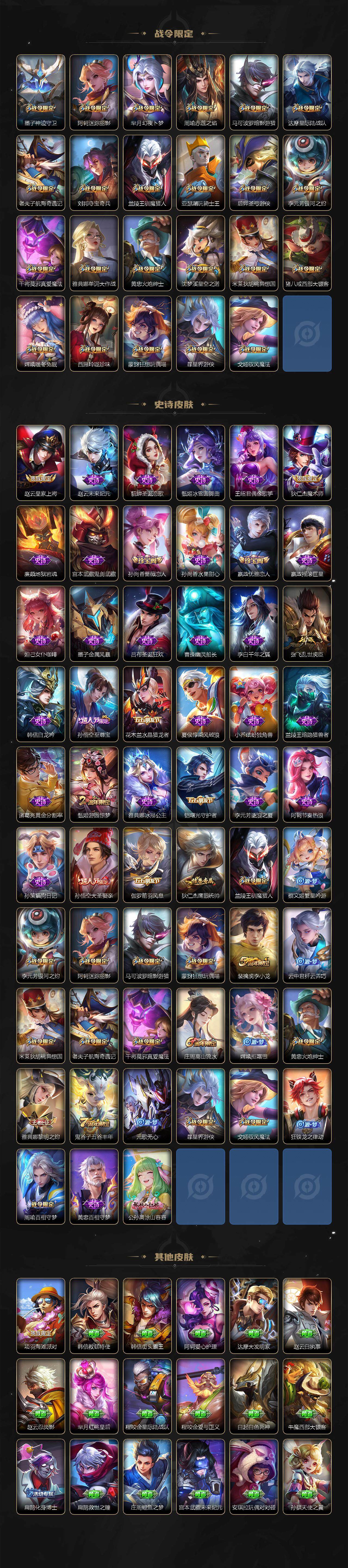 【限定皮肤】:狄仁杰阴阳师,赵云皇家上将,墨子神迹守卫,嬴政优雅恋人,孙尚香蔷薇恋人,庄周高山流水,阿轲迷踪丽影,芈月重明,芈月幻夜卜梦,周瑜赤莲之焰,元歌无心,夏侯惇朔风刀,甄姬游园惊梦,曹操烛龙,马可波罗暗影游猎,狄仁杰魔术师,狄仁杰万华元夜,达摩星际陆战队,达摩沙漠行僧,项羽海滩派对,老夫子醍醐杖,老夫子航海奇遇记,程咬金演武夺筹,刘邦夺宝奇兵,兰陵王驯魔猎人,兰陵王金庭之子,亚瑟潮玩骑士王,孙悟空至尊宝,孙悟空大圣娶亲,牛魔御旌,后羿圣弓游侠,李元芳银河之约,李元芳云中旅人,钟馗驱傩正仪,干将莫邪真爱魔法,雅典娜单词大作战,雅典娜黎明之约,蔡文姬繁星吟游,鬼谷子原初探秘者,鬼谷子五谷丰年,黄忠火炮绅士,苏烈千军破阵,弈星混沌棋,沈梦溪星空之诺,沈梦溪大漠名商,明世隐疑决卦,裴擒虎李小龙,裴擒虎擒涛扼浪,狂铁御狮,米莱狄御霄,米莱狄胡桃异想国,云中君纤云弄巧,盾山御銮,猪八戒西部大镖客,嫦娥拒霜思,嫦娥暖冬兔眠,西施玲珑珍味,蒙犽狂想玩偶喵,鲁班大师探海日志,桑启海盐诗旅,暃星界游侠,戈娅驭风魔法,张良古海寻踪