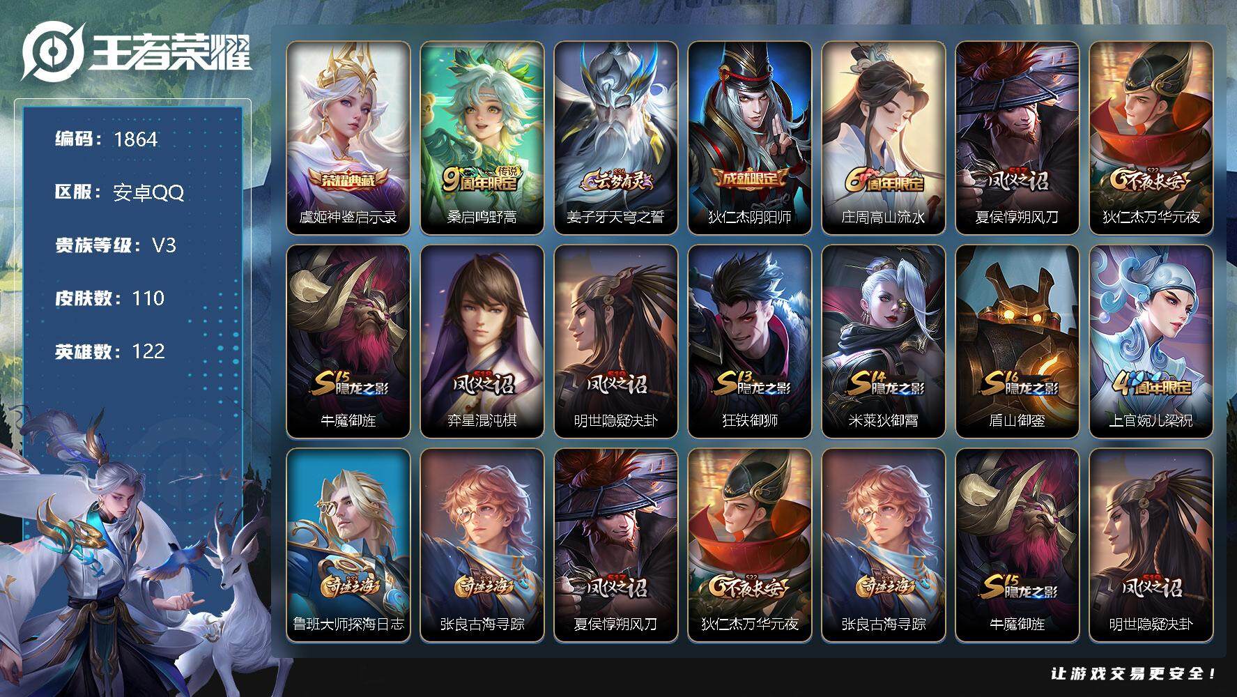 [12396768]【商品标题】:安卓Q-V1-最强王者段位-122英雄-110皮肤-1典藏-0珍品无双-0无双-0珍品传说-1传说-15史诗