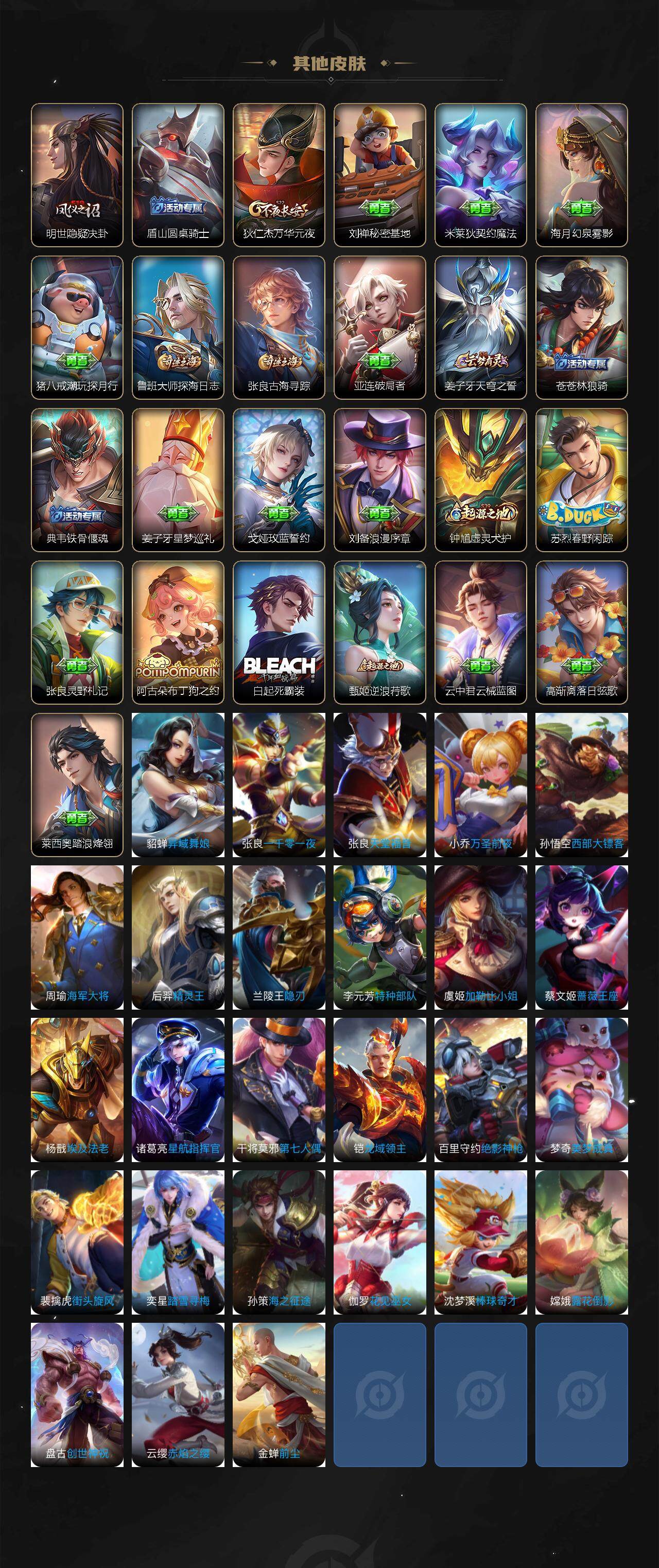 【其他皮肤】:韩信教廷特使,韩信街头霸王,阿轲爱心护理,达摩大发明家,赵云忍炎影,程咬金星际陆战队,白起白色死神,牛魔西部大镖客,扁鹊化身博士,孙膑天使之翼,妲己少女阿狸,典韦黄金武士,亚瑟死亡骑士,达摩拳王,花木兰兔女郎,张飞五福同心,甄姬花好人间,宫本武藏万象初新,狄仁杰阴阳师,刘备纽约教父,刘备汉昭烈帝,关羽龙腾万里,钟无艳海滩丽影,宫本武藏霸王丸,老夫子功夫老勺,孙尚香沉稳之力,诸葛亮掌控之力,李白敏锐之力,鬼谷子幻乐之宴,狂铁御狮,安琪拉如懿,苏烈坚韧之力,米莱狄御霄,明世隐虹云星官,牛魔御旌,小乔丁香结,吕布野性能量,盾山御銮,沈梦溪鲨炮海盗猫,夏侯惇朔风刀,弈星混沌棋,鲁班七号黑桃队长,明世隐疑决卦,盾山圆桌骑士,狄仁杰万华元夜,刘禅秘密基地,米莱狄契约魔法,海月幻泉雾影,猪八戒潮玩探月行,鲁班大师探海日志,张良古海寻踪,亚连破局者,姜子牙天穹之誓,苍苍林狼骑,典韦铁骨偃魂,姜子牙星梦巡礼,戈娅玫蓝誓约,刘备浪漫序章,钟馗虚灵犬护,苏烈春野闲踪,张良灵野札记,阿古朵布丁狗之约,白起死霸装,甄姬逆浪荇歌,云中君云械蓝图,高渐离落日弦歌,莱西奥踏浪烽翎,貂蝉异域舞娘,张良一千零一夜,张良天堂福音,小乔万圣前夜,孙悟空西部大镖客,周瑜海军大将,后羿精灵王,兰陵王隐刃,李元芳特种部队,虞姬加勒比小姐,蔡文姬蔷薇王座,杨戬埃及法老,诸葛亮星航指挥官,干将莫邪第七人偶,铠龙域领主,百里守约绝