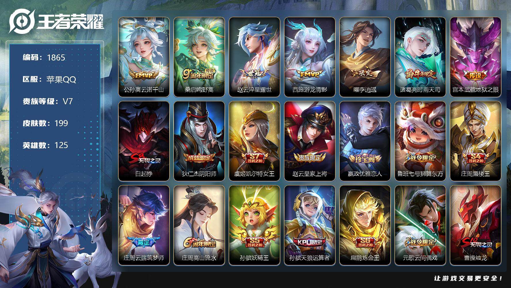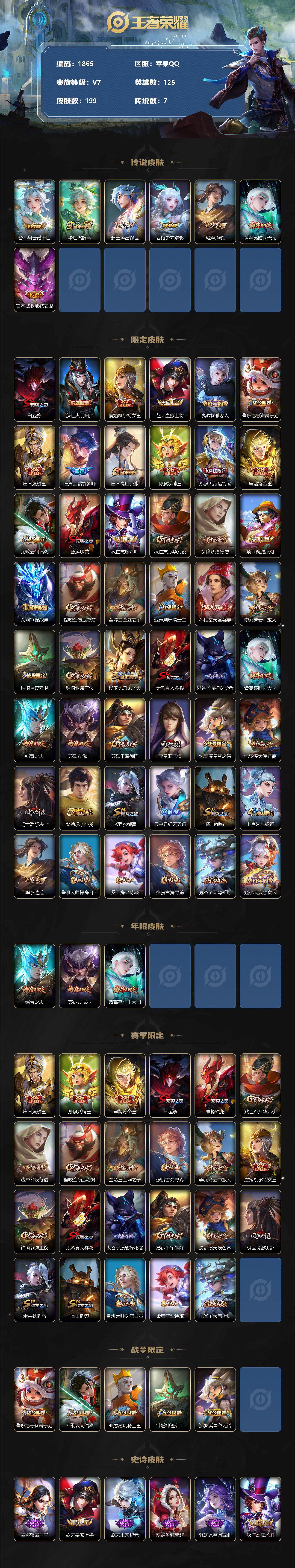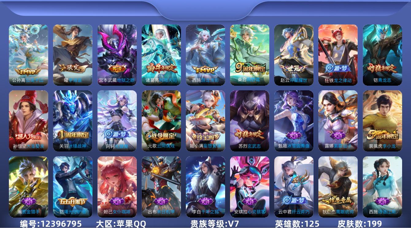 [12396795]【商品标题】:苹果Q-V7-至尊星耀V段位-125英雄-199皮肤-0典藏-0珍品无双-0无双-0珍品传说-7传说-42史诗