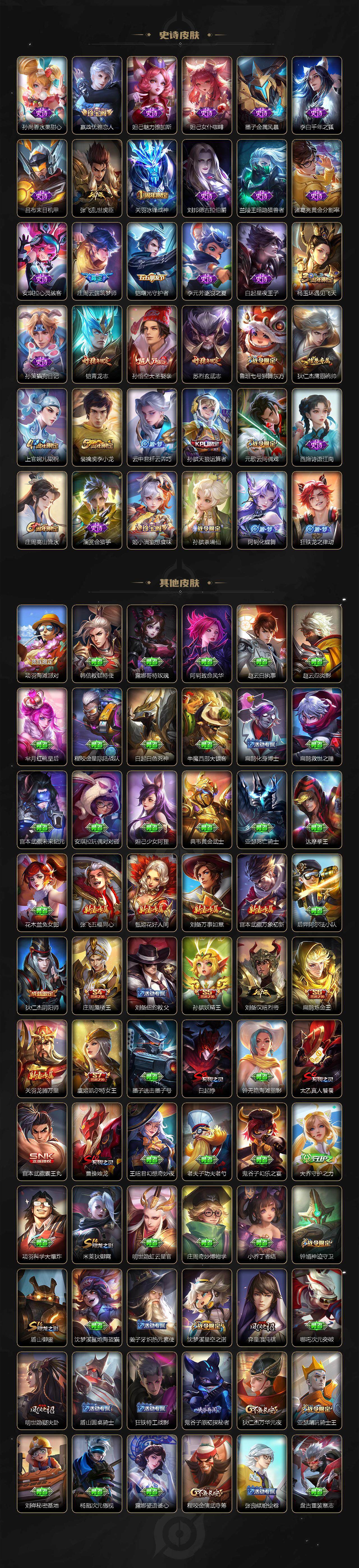 【史诗皮肤】:露娜紫霞仙子,赵云皇家上将,赵云未来纪元,貂蝉圣诞恋歌,甄姬冰雪圆舞曲,狄仁杰魔术师,孙尚香水果甜心,嬴政优雅恋人,妲己魅力维加斯,妲己女仆咖啡,墨子金属风暴,李白千年之狐,吕布末日机甲,张飞乱世虎臣,关羽冰锋战神,刘邦德古拉伯爵,兰陵王暗隐猎兽者,诸葛亮黄金分割率,安琪拉心灵骇客,庄周云端筑梦师,铠曙光守护者,李元芳逐浪之夏,白起星夜王子,杨玉环遇见飞天,孙策猫狗日记,铠青龙志,孙悟空大圣娶亲,苏烈玄武志,鲁班七号狮舞东方,狄仁杰鹰眼统帅,上官婉儿梁祝,裴擒虎李小龙,云中君纤云弄巧,孙膑天狼运算者,元歌云间偶戏,西施诗语江南,庄周高山流水,澜赏