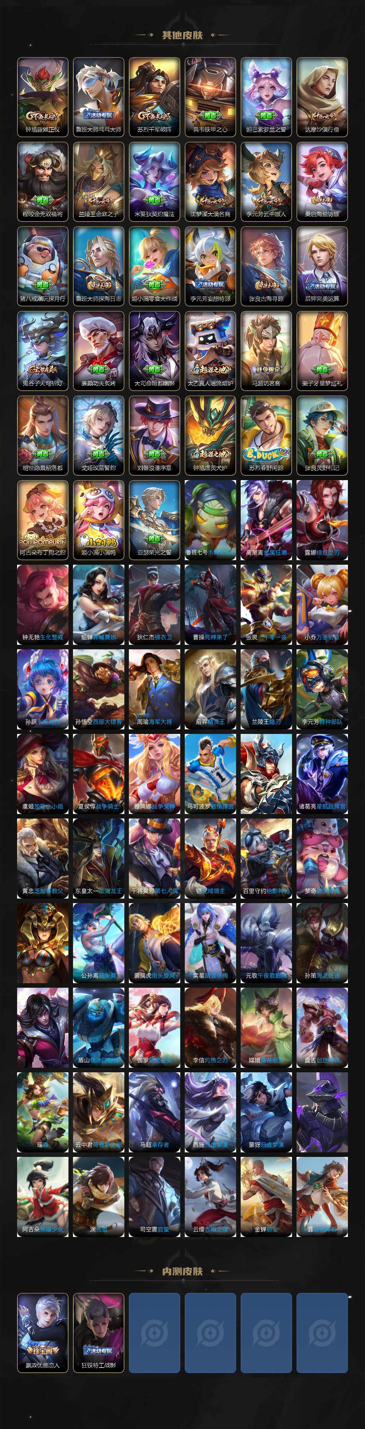 【限定皮肤】:白起狰,狄仁杰阴阳师,虞姬凯尔特女王,赵云皇家上将,嬴政优雅恋人,鲁班七号狮舞东方,庄周蜃楼王,庄周云端筑梦师,庄周高山流水,孙膑妖精王,孙膑天狼运算者,扁鹊炼金王,元歌云间偶戏,曹操烛龙,狄仁杰魔术师,狄仁杰万华元夜,达摩沙漠行僧,项羽海滩派对,关羽冰锋战神,程咬金演武夺筹,兰陵王金庭之子,亚瑟潮玩骑士王,孙悟空大圣娶亲,李元芳云中旅人,钟馗神迹守卫,钟馗驱傩正仪,杨玉环遇见飞天,太乙真人饕餮,鬼谷子原初探秘者,诸葛亮时雨天司,铠青龙志,苏烈玄武志,苏烈千军破阵,弈星混沌棋,沈梦溪星空之诺,沈梦溪大漠名商,明世隐疑决卦,裴擒虎李小龙,米莱狄御霄,云中君纤云弄巧,盾山御銮,上官婉儿梁祝,曜李逍遥 ,鲁班大师探海日志,桑启海盐诗旅,张良古海寻踪,鬼谷子天穹祈灯,姬小满妄想食味