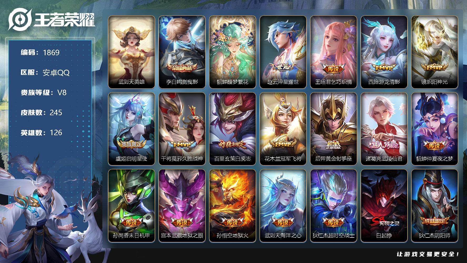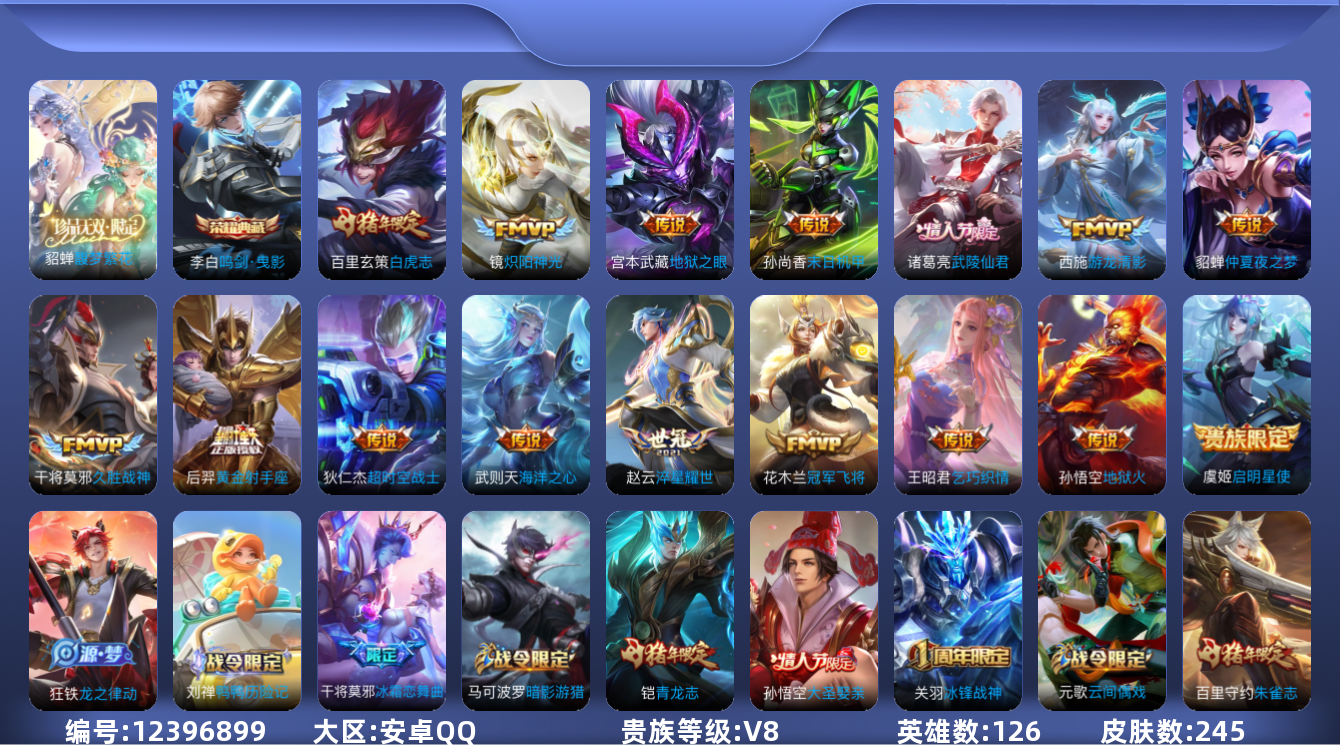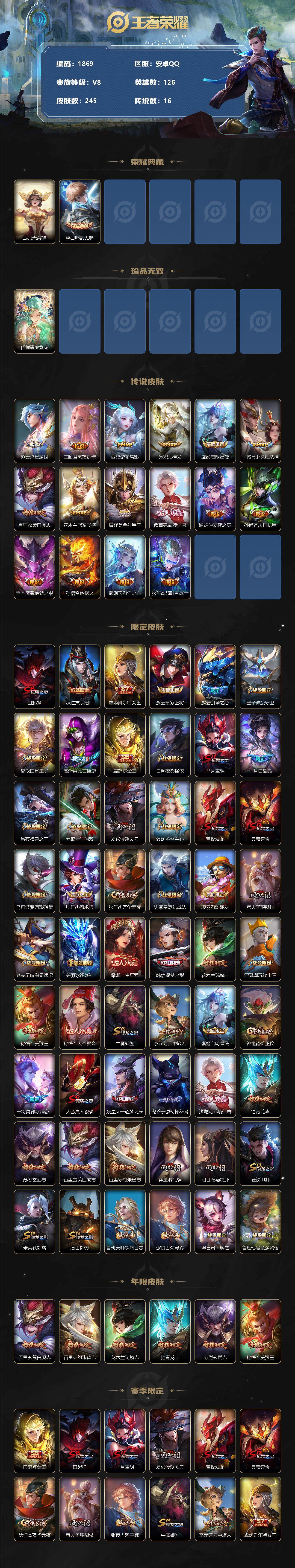 [12396899]【商品标题】:安卓Q-V7-永恒钻石III段位-126英雄-245皮肤-1典藏-1珍品无双-0无双-0珍品传说-16传说-65史诗