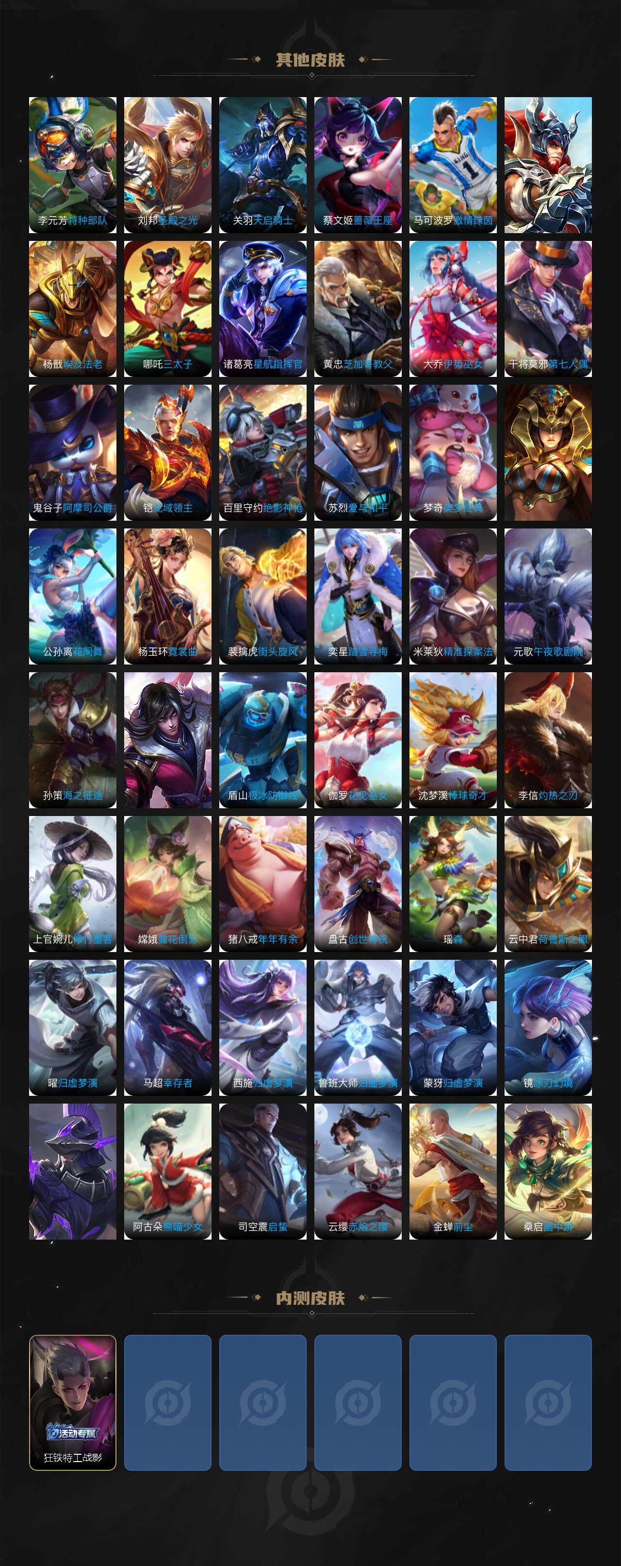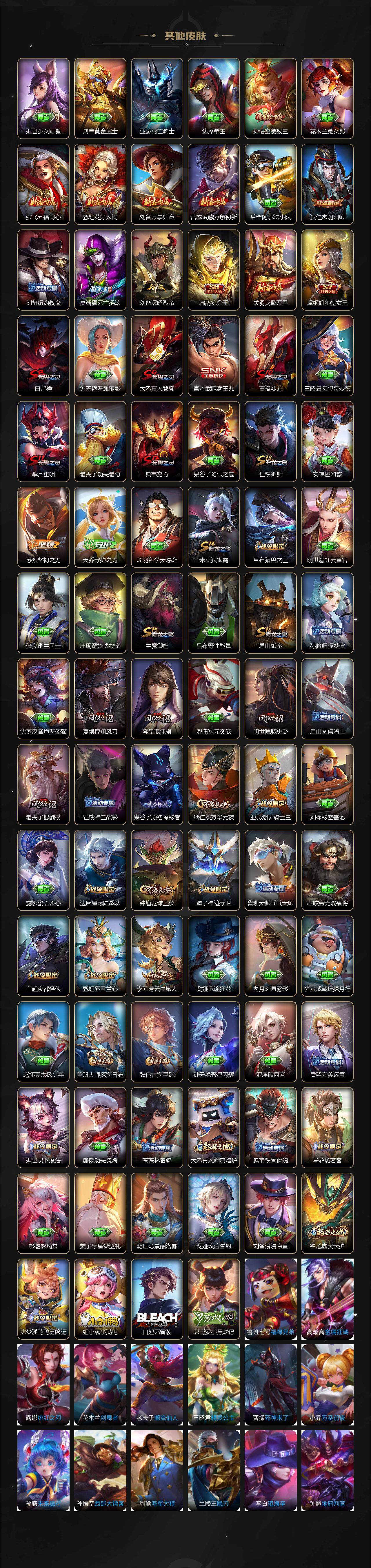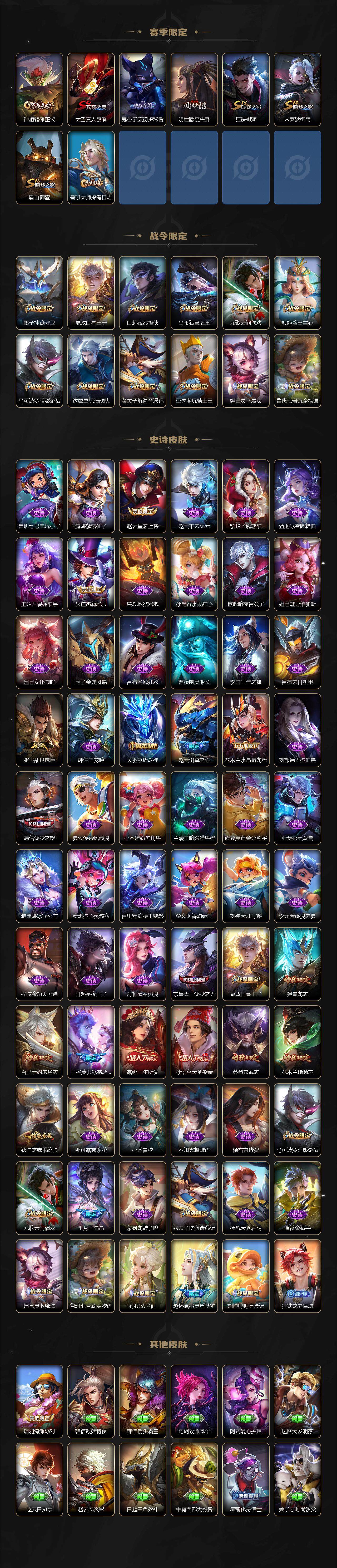 【限定皮肤】:白起狰,狄仁杰阴阳师,虞姬凯尔特女王,赵云皇家上将,赵云引擎之心,墨子神迹守卫,嬴政白昼王子,高渐离死亡摇滚,扁鹊炼金王,白起夜都怪侠,芈月重明,芈月白晶晶,吕布猎兽之王,元歌云间偶戏,夏侯惇朔风刀,甄姬落雪兰心,曹操烛龙,典韦穷奇,马可波罗暗影游猎,狄仁杰魔术师,狄仁杰万华元夜,达摩星际陆战队,项羽海滩派对,老夫子醍醐杖,老夫子航海奇遇记,关羽冰锋战神,露娜一生所爱,韩信逐梦之影,花木兰瑞麟志,亚瑟潮玩骑士王,孙悟空美猴王,孙悟空大圣娶亲,牛魔御旌,李元芳云中旅人,虞姬启明星使,钟馗驱傩正仪,干将莫邪冰霜恋舞曲,太乙真人饕餮,东皇太一逐梦之光,鬼谷子原初探秘者,诸葛亮武陵仙君,铠青龙志,苏烈玄武志,百里玄策白虎志,百里守约朱雀志,弈星混沌棋,明世隐疑决卦,狂铁御狮,米莱狄御霄,盾山御銮,鲁班大师探海日志,张良古海寻踪,妲己灵卜魔法,鲁班七号蔬乡物语
