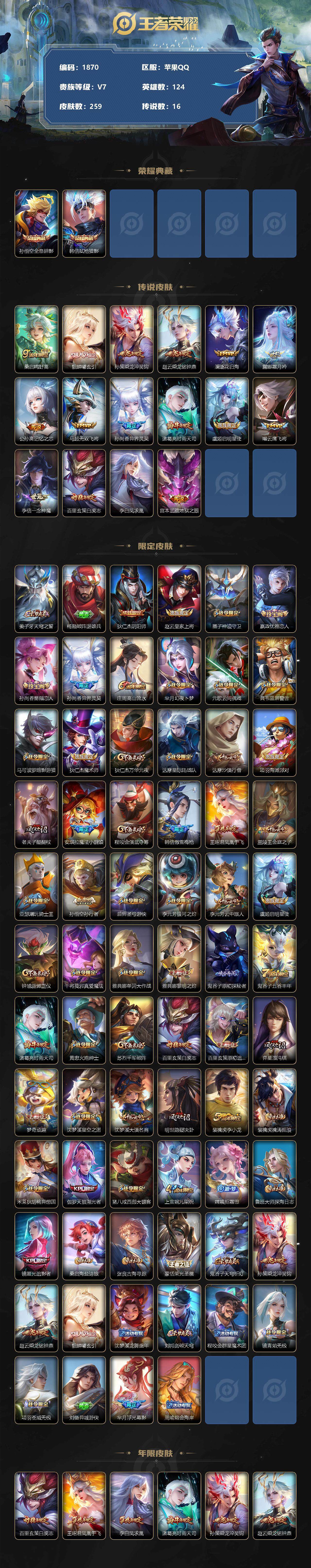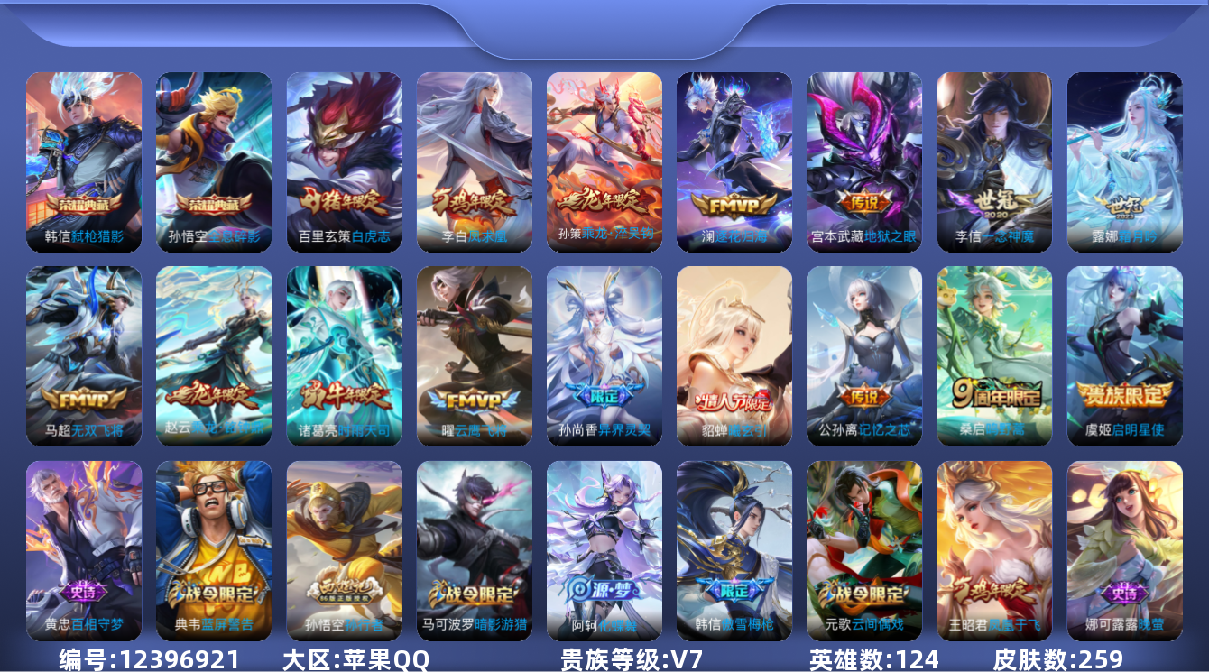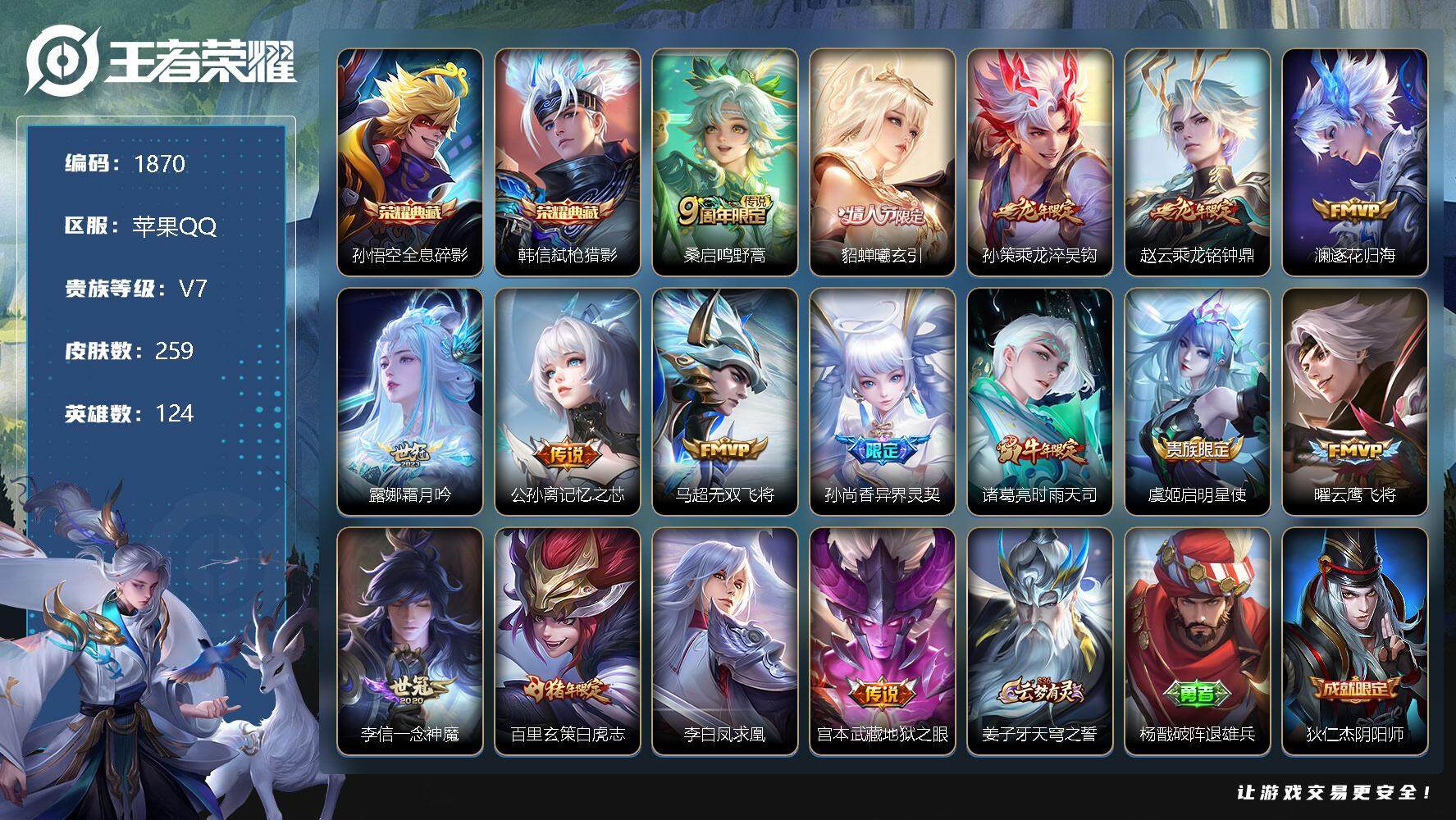 [12396921]【商品标题】:苹果Q-V7-最强王者段位-124英雄-259皮肤-2典藏-0珍品无双-0无双-0珍品传说-16传说-68史诗