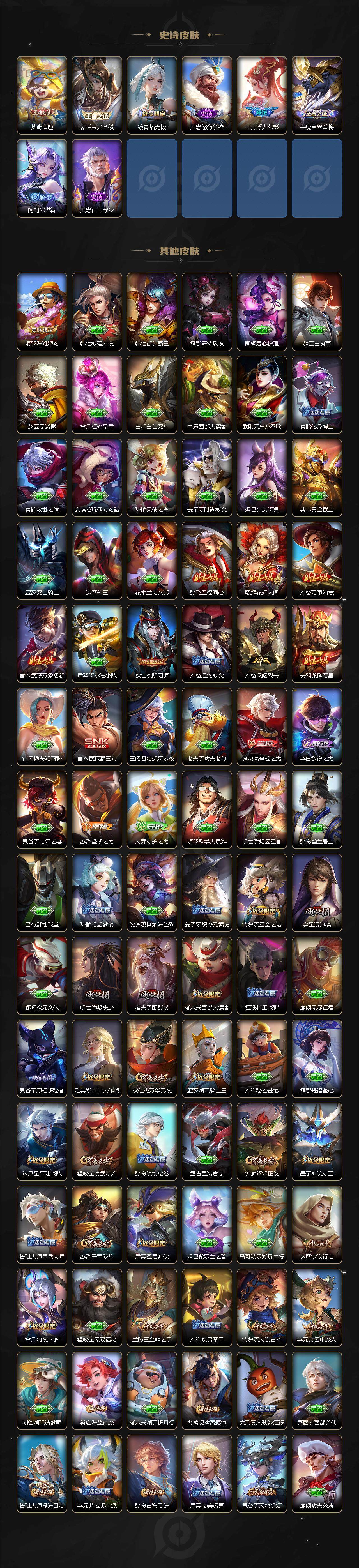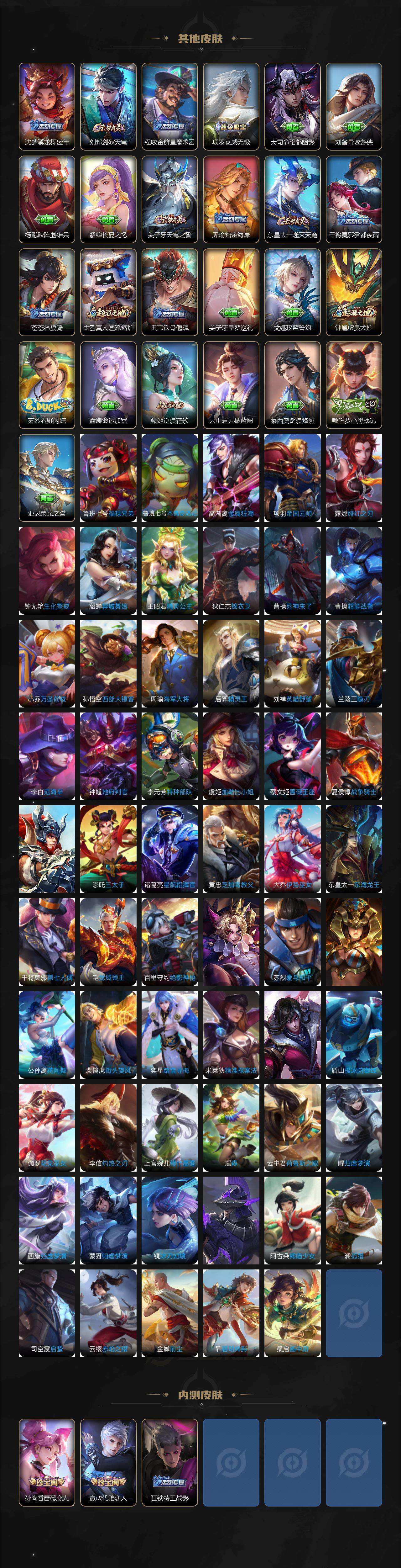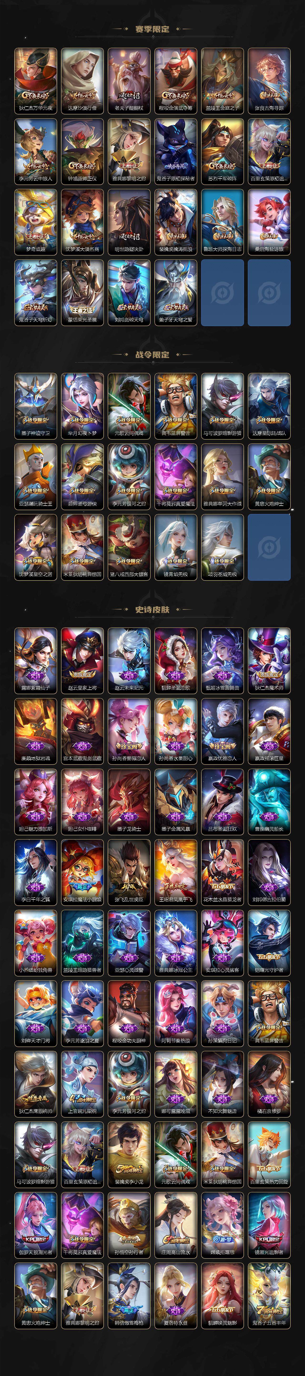 【限定皮肤】:姜子牙天穹之誓,杨戬破阵退雄兵,狄仁杰阴阳师,赵云皇家上将,墨子神迹守卫,嬴政优雅恋人,孙尚香蔷薇恋人,孙尚香异界灵契,庄周高山流水,芈月幻夜卜梦,元歌云间偶戏,典韦蓝屏警告,马可波罗暗影游猎,狄仁杰魔术师,狄仁杰万华元夜,达摩星际陆战队,达摩沙漠行僧,项羽海滩派对,老夫子醍醐杖,安琪拉魔法小厨娘,程咬金演武夺筹,韩信傲雪梅枪,王昭君凤凰于飞,兰陵王金庭之子,亚瑟潮玩骑士王,孙悟空孙行者,后羿圣弓游侠,李元芳银河之约,李元芳云中旅人,虞姬启明星使,钟馗驱傩正仪,干将莫邪真爱魔法,雅典娜单词大作战,雅典娜黎明之约,鬼谷子原初探秘者,鬼谷子五谷丰年,诸葛亮时雨天司,黄忠火炮绅士,苏烈千军破阵,百里玄策白虎志,百里玄策原初追逐者,弈星混沌棋,梦奇顽趣,沈梦溪星空之诺,沈梦溪大漠名商,明世隐疑决卦,裴擒虎李小龙,裴擒虎擒涛扼浪,米莱狄胡桃异想国,伽罗天狼溯光者,猪八戒西部大镖客,上官婉儿梁祝,嫦娥拒霜思,鲁班大师探海日志,镜匿光追影者,桑启海盐诗旅,张良古海寻踪,蒙恬荣光圣徽,鬼谷子天穹祈灯,孙策乘龙淬吴钩,赵云乘龙铭钟鼎,貂蝉曦玄引,沈梦溪龙舞盛年,刘邦剑破天穹,程咬金群星魔术团,镜青焰无极,项羽苍威无极,刘备异域游侠,芈月浮光幕影,周瑜熔金海岸
