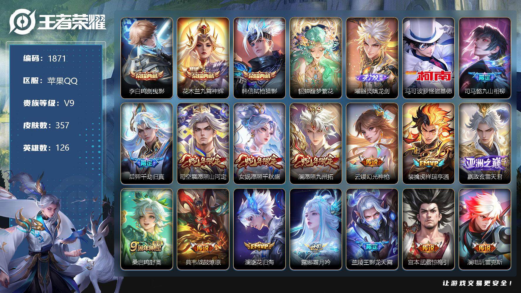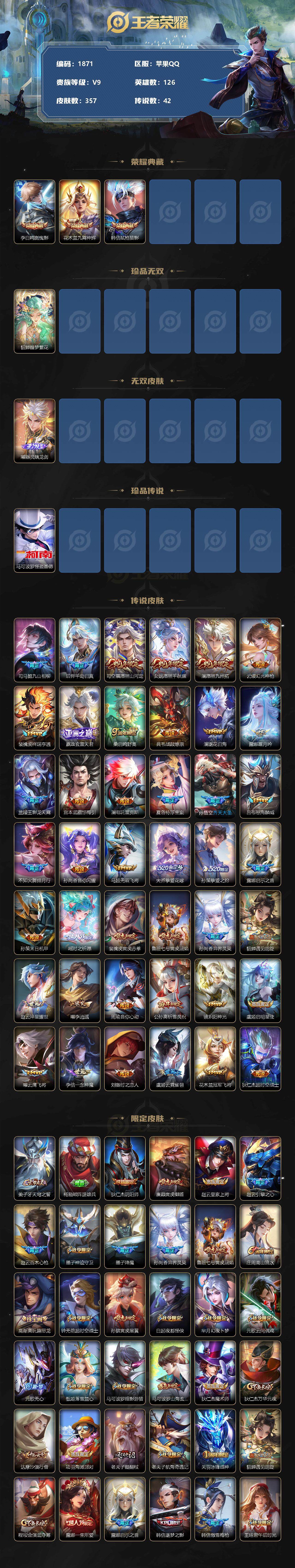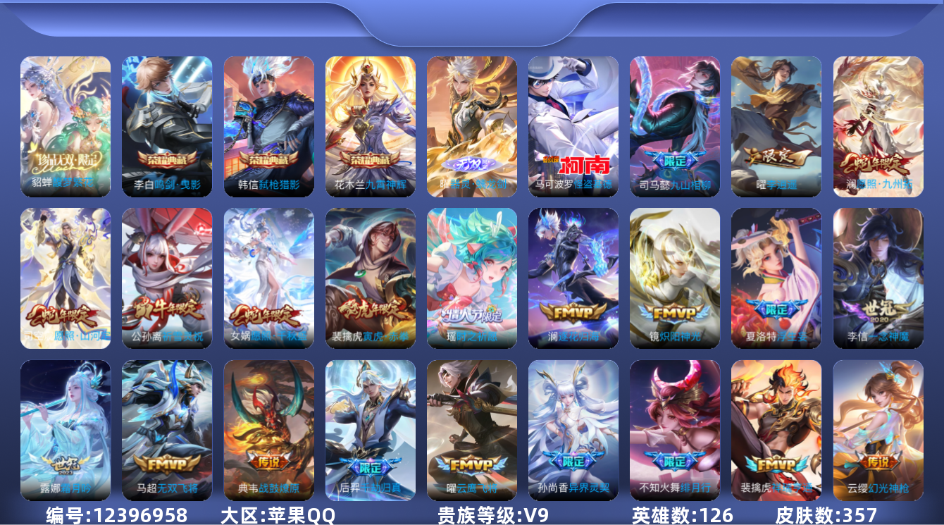[12396958]【商品标题】:苹果Q-V9-至尊星耀V段位-126英雄-357皮肤-3典藏-1珍品无双-1无双-1珍品传说-42传说-110史诗
