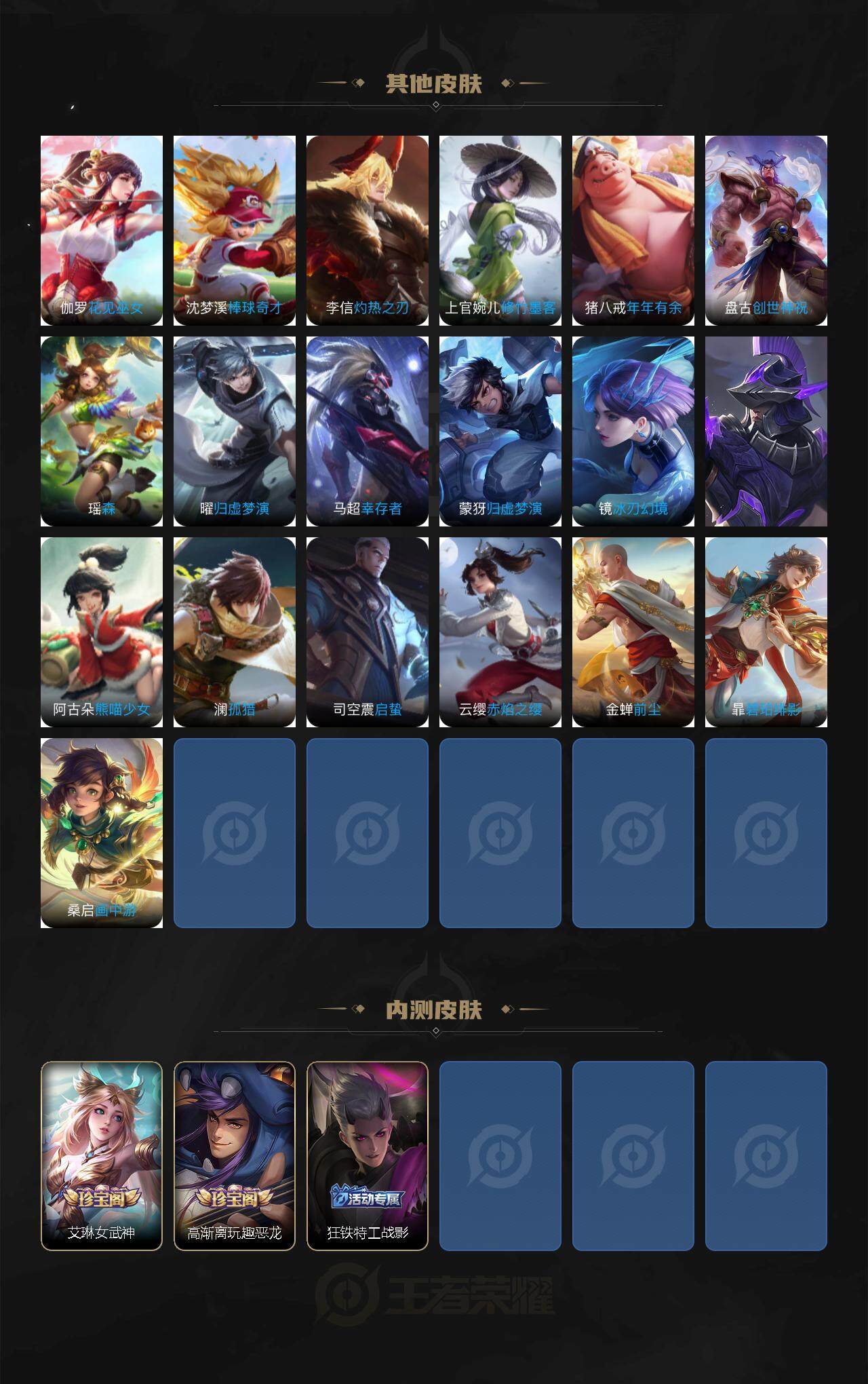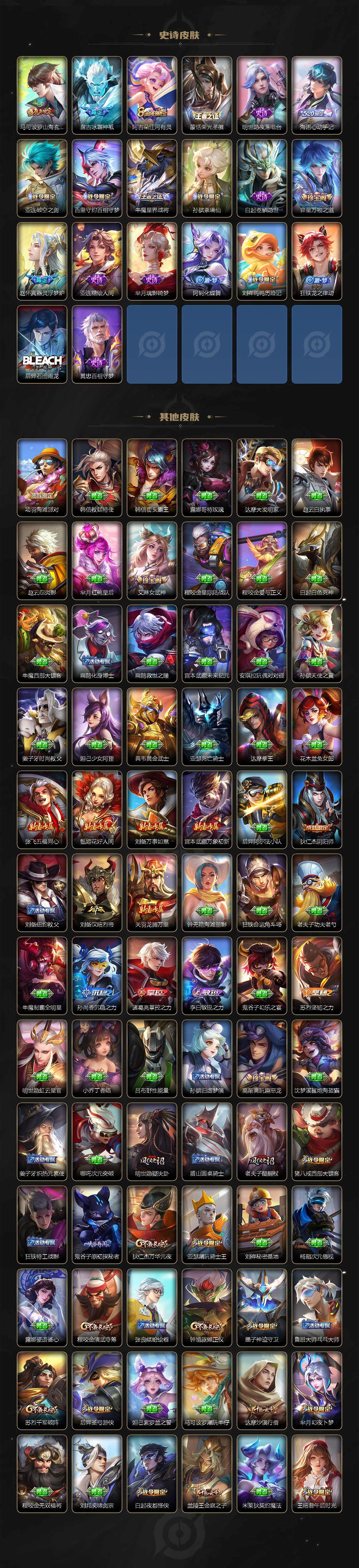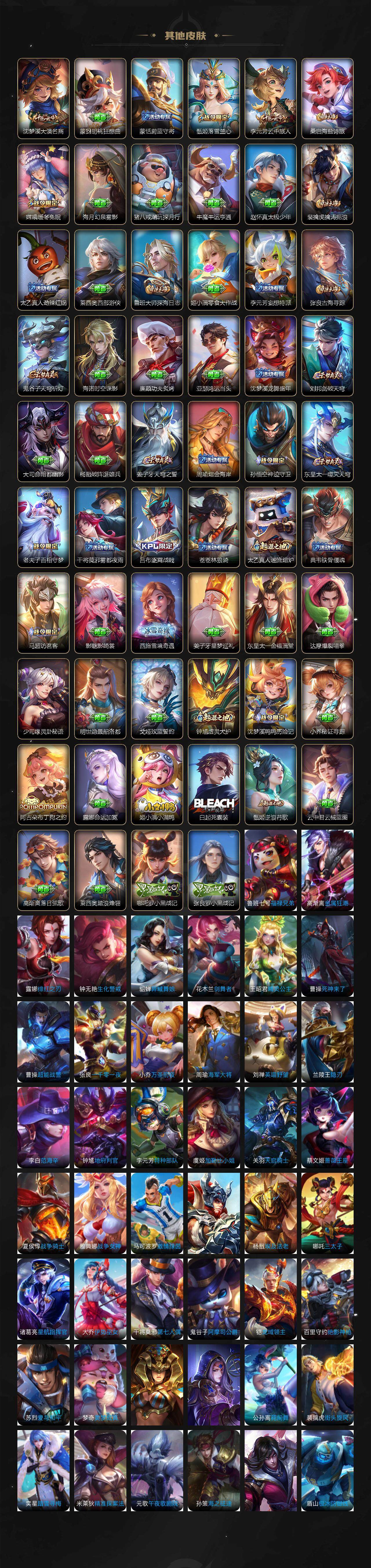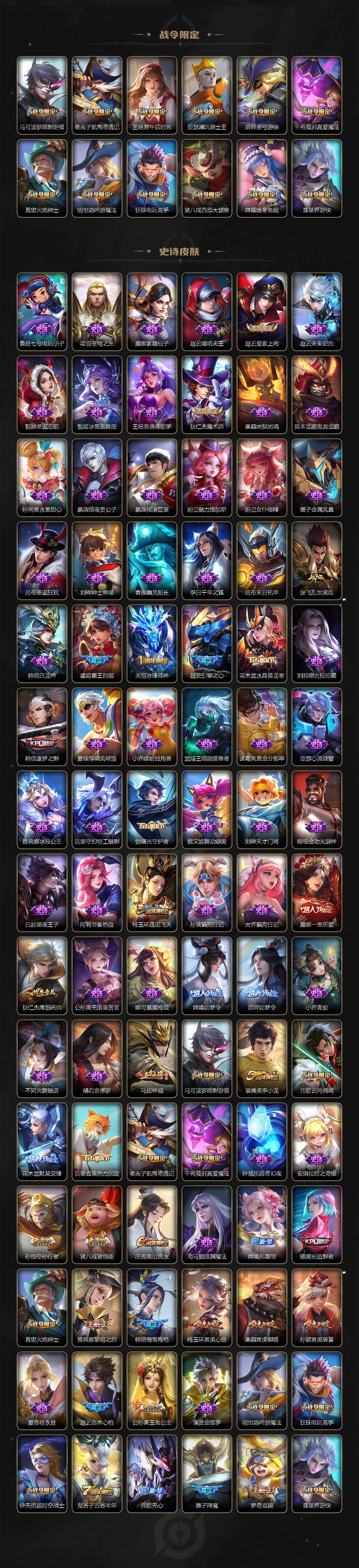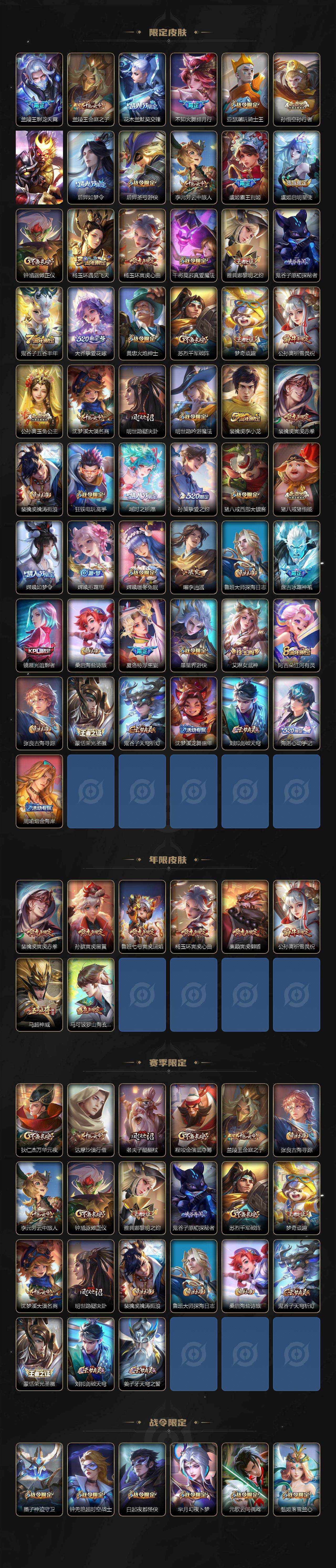 【限定皮肤】:姜子牙天穹之誓,杨戬破阵退雄兵,狄仁杰阴阳师,廉颇寅虎御盾,赵云皇家上将,赵云引擎之心,赵云百木心枪,墨子神迹守卫,墨子降魔,孙尚香异界灵契,鲁班七号寅虎瑞焰,庄周高山流水,高渐离玩趣恶龙,钟无艳超时空战士,孙膑寅虎展翼,白起夜都怪侠,芈月幻夜卜梦,元歌云间偶戏,元歌无心,甄姬落雪兰心,马可波罗暗影游猎,马可波罗山海玄木吟,狄仁杰魔术师,狄仁杰万华元夜,达摩沙漠行僧,项羽海滩派对,老夫子醍醐杖,老夫子航海奇遇记,关羽冰锋战神,貂蝉遇见胡旋,程咬金演武夺筹,露娜一生所爱,露娜启示之音,韩信逐梦之影,韩信傲雪梅枪,王昭君午后时光,兰陵王影龙天霄,兰陵王金庭之子,花木兰默契交锋,不知火舞绯月行,亚瑟潮玩骑士王,孙悟空孙行者,孙悟空齐天大圣,后羿如梦令,后羿圣弓游侠,李元芳云中旅人,虞姬霸王别姬,虞姬启明星使,钟馗驱傩正仪,杨玉环遇见飞天,杨玉环寅虎心曲,干将莫邪真爱魔法,雅典娜黎明之约,鬼谷子原初探秘者,鬼谷子五谷丰年,大乔挚爱花嫁,黄忠火炮绅士,苏烈千军破阵,梦奇顽趣,公孙离祈雪灵祝,公孙离玉兔公主,沈梦溪大漠名商,明世隐疑决卦,明世隐吟游魔法,裴擒虎李小龙,裴擒虎寅虎赤拳,裴