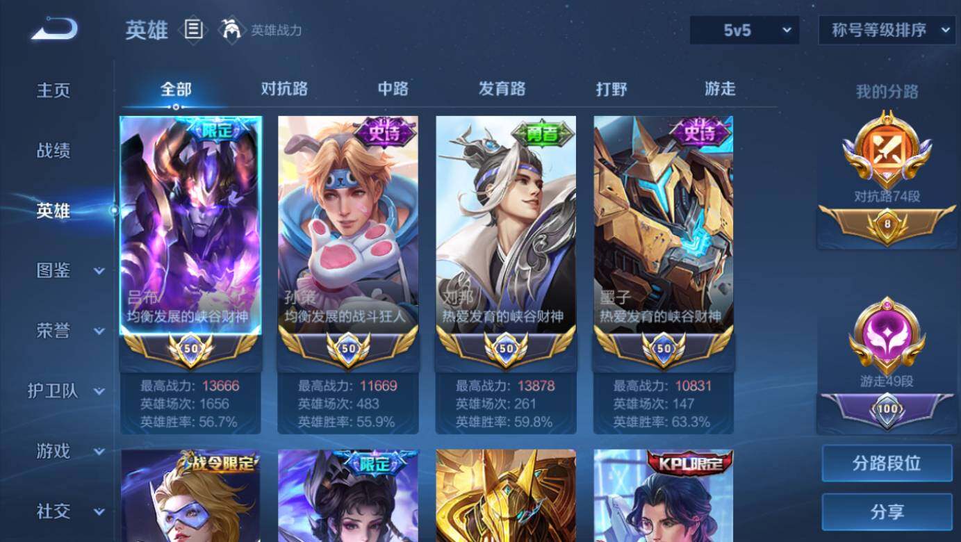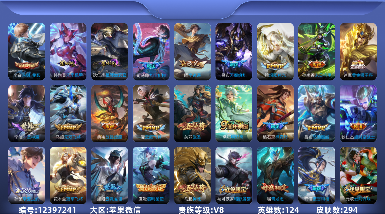 - [11881969]V10 6典藏 1无双 50传说 123英雄 448皮肤 典藏英雄武则天 可修改实名 优质装备:天鹅之梦(小乔典藏),星空梦想(太空人),倪克斯神谕(宇宙婆娘),无限飓风号(高达),杀手不太冷,全息碎影(猴子典藏),碎月剑心(李白无双),黄金狮子座,黄金射手座,冠军飞将,云鹰飞将(小将军),绛天战甲(鸡嘴战神),黄金白羊座,猫影幻舞,久胜战神,炽阳神光,一念神魔,云霓雀翎,末日机甲-孙尚香(绿蚂蚱),地狱火,仲夏夜之梦(大飞蛾),音你心动-小乔,零号·赤焰,海洋之心,地狱之眼,飞鸢探春,音你心动-周瑜,胖达荣荣,李逍遥,乞巧织情,时之恋人-刘备(电焊工),游龙清影(小青龙),淬星耀世,超时空战士-狄仁杰,遇见胡旋,音你闪耀(rap皮),霜月吟,澜逐花归海,艾琳觅芳踪,琥珀纪元铠,琥珀纪元马超 珍宝阁皮:蔷薇恋人,女武神 限定皮:至尊宝,白虎志(电光耗子),凤求凰(白切鸡),凤凰于飞,太华(伽罗年限),梅西,武陵仙君(小桃花),异界灵契(白毛香),傲雪梅枪,补天,星穹之声,绯月行,时之彼端,白鹤梁神女,魔法小厨娘,白晶晶,时雨天司(水龙头),神威(电光马子),飞衡(韩信年限),玄嵩(庄周年限),瑞麟志(木兰年限),遇见飞天,高山流水,五谷丰年,青龙志(铠年限),冰锋战神,幽恒(沐浴露),武圣,天狼运算者,游园惊梦,梁祝,御风骁将(吕布年限),天狼狩猎者,龙胆,逐梦之翼,逐梦之星,烈魂,岱宗(典韦年限),天狼溯光者,虎魄,逐梦之音,天狼征服者,奔雷神使(牛魔年限),祈雪灵祝(雪兔子),天狼绘梦者,李小龙,逐梦之影,逐梦之光,玄武志(苏烈年限),朱雀志(守约年限),永曜之星,辉光之辰,如梦令-嫦娥,如梦令-后羿,霸王别姬-项羽,霸王别姬-虞姬,奇迹圣诞,默契交锋-兰陵王,默契交锋-花木兰,孙行者,猪悟能,一生所爱,大圣娶亲,引擎之心,天魔缭乱,青春决赛季,冰霜恋舞曲,云端筑梦师,乒乒小将,蜜橘之夏,热情桑巴,神奇女侠,美猴王,匿光追影者,女儿国国王,时之祈愿-云中君,时之祈愿-瑶(瑶传限),玉兔公主 史诗皮:琥珀纪元伽罗,遇见神鹿,紫霞仙子,苍穹之光,电玩小子(小书包),白龙吟,黄金分割率,特工魅影,千年之狐,永昼,江河有灵,雪夜绮愿(周瑜),百解令(蒙犽),高渐离燃音魔法,蒙恬荣光圣徽,偶像歌手,龙骑士(小龙虾),白蛇,暗夜猫娘,魅语,无限星赏官,晚萤,冰冠公主,