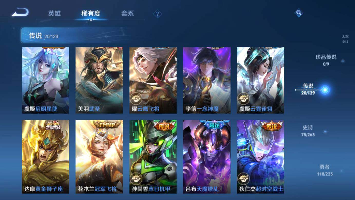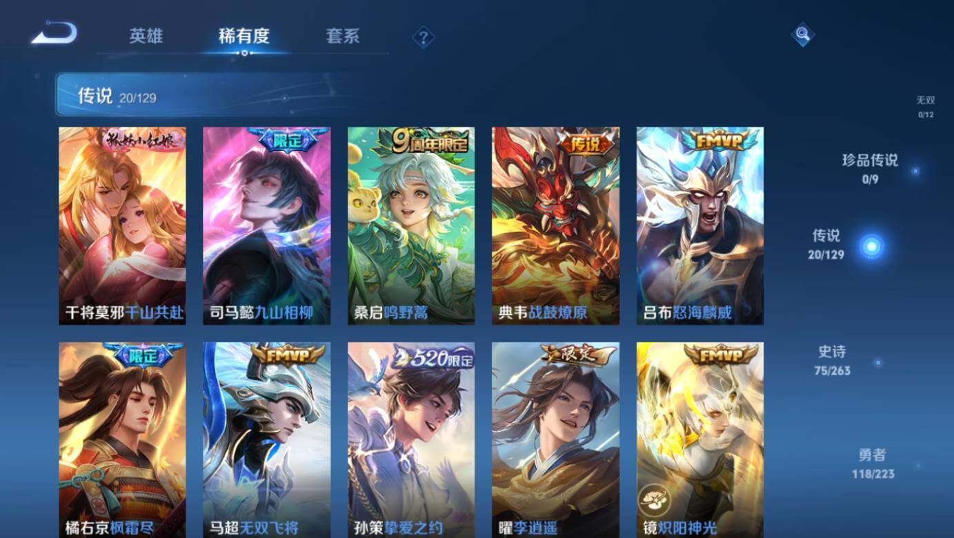 【传说皮肤】:干将莫邪千山共赴,司马懿九山相柳,桑启鸣野蒿,典韦战鼓燎原,吕布怒海麟威,橘右京枫霜尽,马超无双飞将,孙策挚爱之约,曜李逍遥 ,镜炽阳神光,虞姬启明星使,关羽武圣,曜云鹰飞将,李信一念神魔,虞姬云霓雀翎,达摩黄金狮子座,花木兰冠军飞将,孙尚香末日机甲,吕布天魔缭乱,狄仁杰超时空战士