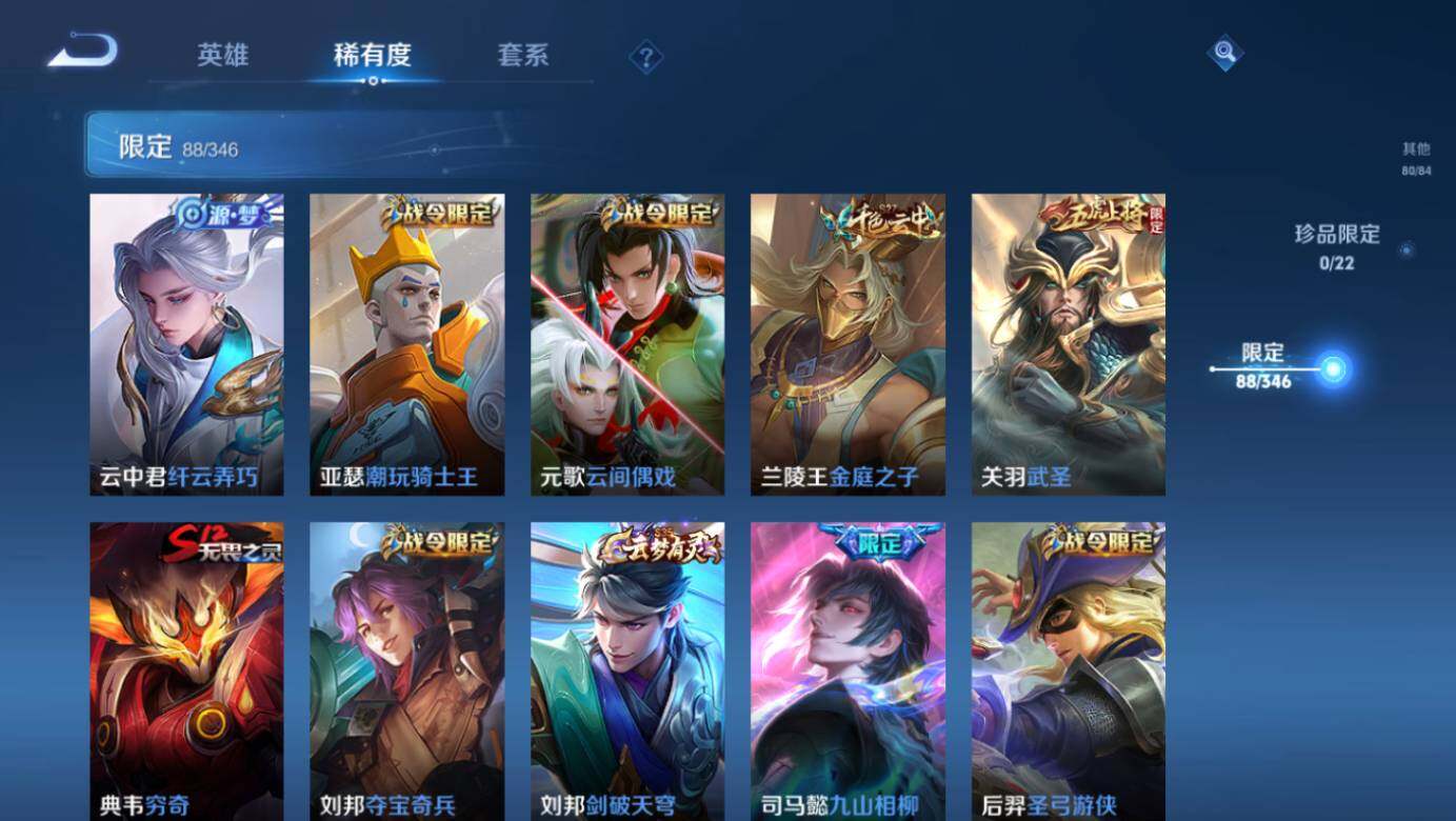 【限定皮肤】:白起狰,狄仁杰阴阳师,赵云皇家上将,赵云龙胆,墨子神迹守卫,嬴政白昼王子,鲁班七号乒乒小将,庄周高山流水,高渐离玩趣恶龙,阿轲迷踪丽影,钟无艳超时空战士,白起夜都怪侠,芈月白晶晶,芈月幻夜卜梦,吕布天魔缭乱,吕布猎兽之王,吕布御风骁将,元歌云间偶戏,甄姬落雪兰心,典韦穷奇,马可波罗暗影游猎,狄仁杰魔术师,狄仁杰万华元夜,达摩沙漠行僧,项羽海滩派对,老夫子醍醐杖,老夫子航海奇遇记,关羽武圣,程咬金演武夺筹,刘邦夺宝奇兵,韩信傲雪梅枪,王昭君午后时光,兰陵王金庭之子,橘右京枫霜尽,亚瑟潮玩骑士王,牛魔御旌,后羿圣弓游侠,李元芳云中旅人,虞姬启明星使,钟馗驱傩正仪,干将莫邪真爱魔法,雅典娜单词大作战,雅典娜黎明之约,鬼谷子原初探秘者,鬼谷子五谷丰年,黄忠火炮绅士,铠青龙志,苏烈千军破阵,百里玄策原初追逐者,弈星混沌棋,梦奇顽趣,沈梦溪大漠名商,明世隐疑决卦,明世隐吟游魔法,裴擒虎李小龙,裴擒虎擒涛扼浪,狂铁电玩高手,米莱狄御霄,云中君纤云弄巧,盾山御銮,孙策挚爱之约,猪八戒西部大镖客,猪八戒猪悟能,嫦娥拒霜思,曜李逍遥 ,蒙犽狂想玩偶喵,鲁班大师匿光启智者,鲁班大师探海日志,桑启海盐诗旅,艾琳女武神,阿古朵江河有灵,张良古海寻踪,蒙恬荣光圣徽,鬼谷子天穹祈灯,沈梦溪龙舞盛年,刘邦剑破天穹,程咬金群星魔术团