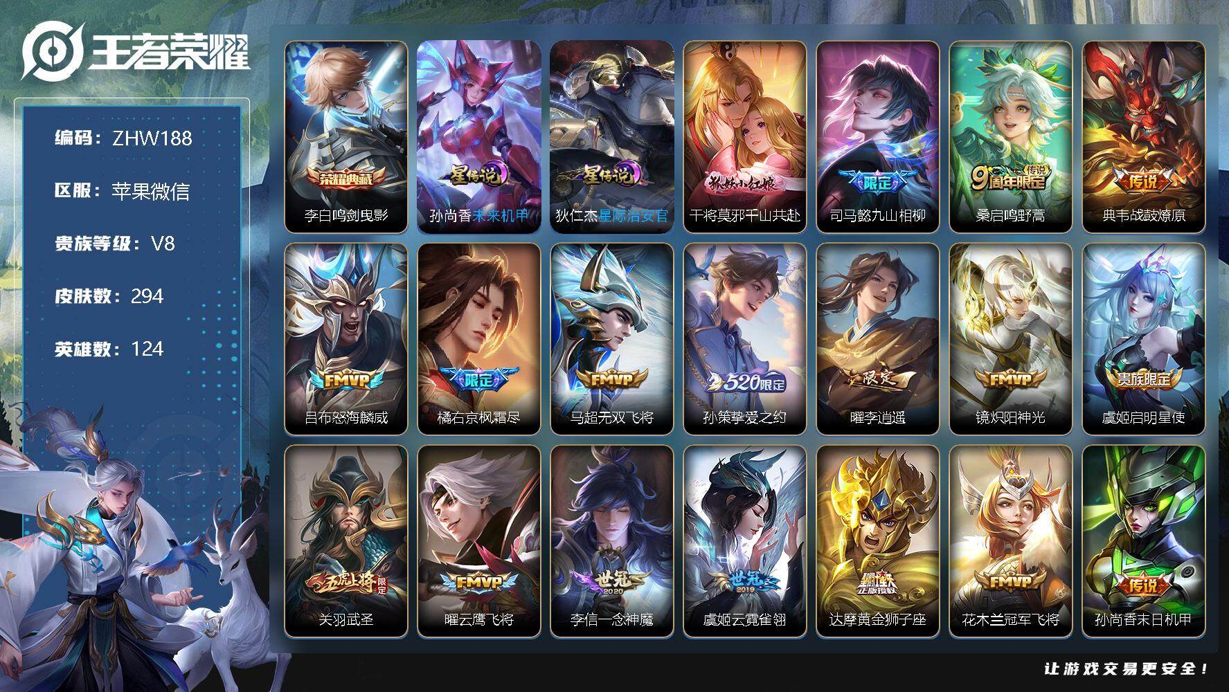 [12397241]8小国对抗74段-社交限制【商品标题】:苹果WX-V8-最强王者段位-124英雄-294皮肤-1典藏-20传说-75史诗