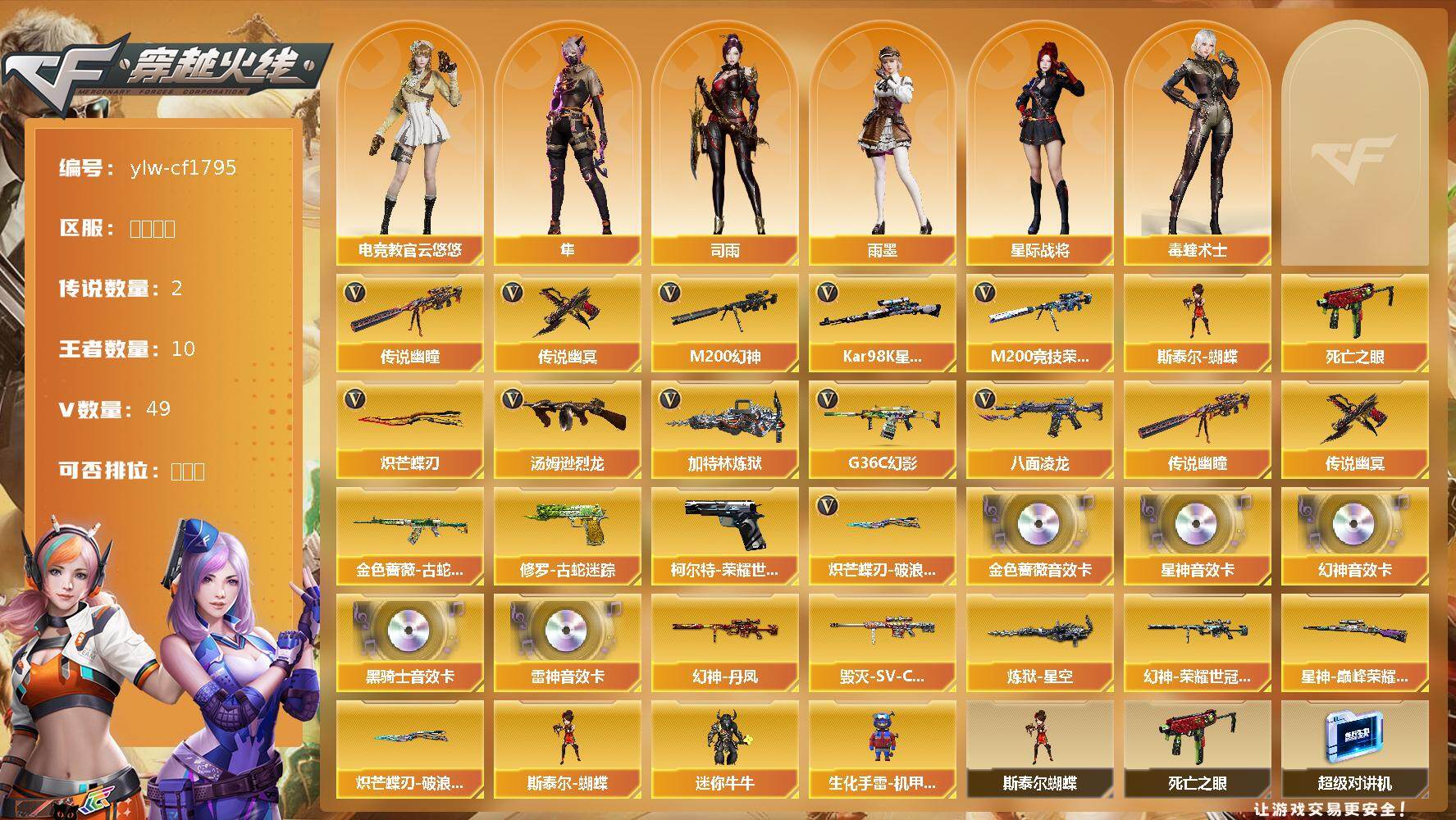 [12397368]【商品标题】:山西一区-49V-10王者-0炫金 【传说武器】:传说幽瞳,传说幽冥 【热门武器】:传说幽瞳,传说幽冥,G36C-幻影,M200-幻神,柯尔特-荣耀世冠白鲨2023,金色蔷薇-古蛇迷踪,修罗-古蛇迷踪,M200-竞技荣光,八面凌龙,死亡之眼,Kar98K-星神,汤姆逊-烈龙*5,加特林-炼狱,斯泰尔-蝴蝶,炽芒蝶刃*3,炽芒蝶刃-破浪逐光 皮肤 【音效卡】:M200-幻神音效卡,M4A1-雷神音效卡,M4A1-黑骑士音效卡,QBZ03-金色蔷薇音效卡,Kar98K-星神音效卡 【稀有皮肤】:幻神-丹凤,幻神-荣耀世冠白鲨2023 皮肤,星神-巅峰荣耀 皮肤,炼狱-星空,毁灭-SV-CFPLS16冠军,M200-庆典-CFS 2021,炽芒蝶刃-破浪逐光 皮肤 【角色】:电竞教官-云悠悠,隼,司雨,雨墨,星际战将,毒蝰术士 【人偶武器】:斯泰尔-蝴蝶,迷你牛牛,生化手雷-机甲核心 【暴走生化】:斯泰尔-蝴蝶,死亡之眼,超级对讲机 【英雄级武器】:M200-竞技荣光,柯尔特-竞技荣光,擎天-竞技荣光,高爆手雷-竞技荣光*2,烟雾弹-竞技荣光,闪光弹-竞技荣光*3,G36C-幻影,金色蔷薇-古蛇迷踪,八面凌龙,M4A1-雷神*2,M4A1-黑龙,加特林-炼狱,汤姆逊-烈龙*5,AK47-无影,AK47-火麒麟,AK12-天启,AN94-超新星,Barrett-毁灭,AWM-裁决,Kar98K-星神,M200-幻神,黑武士-锦绣游龙,修罗-古蛇迷踪,沙鹰-天神*4,炽芒蝶刃*3,麒麟刺*3,屠龙 【特殊枪械】:蝴蝶斯泰尔+5烈龙,5烈龙,,1炼狱,1蝴蝶斯泰尔