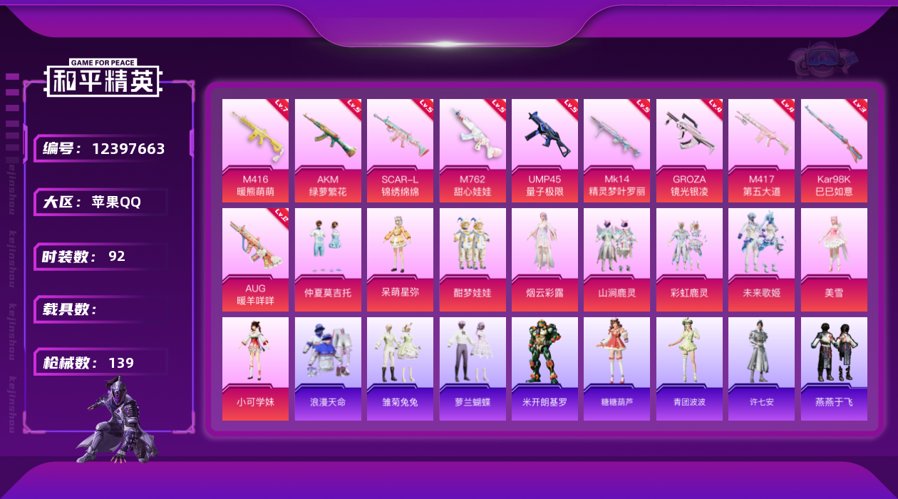 [12397663]【商品标题】:苹果 手Q-9粉装-10特效枪-0载具-1粉色飞行器-46521热力值-7王牌印记-92套装-139枪皮