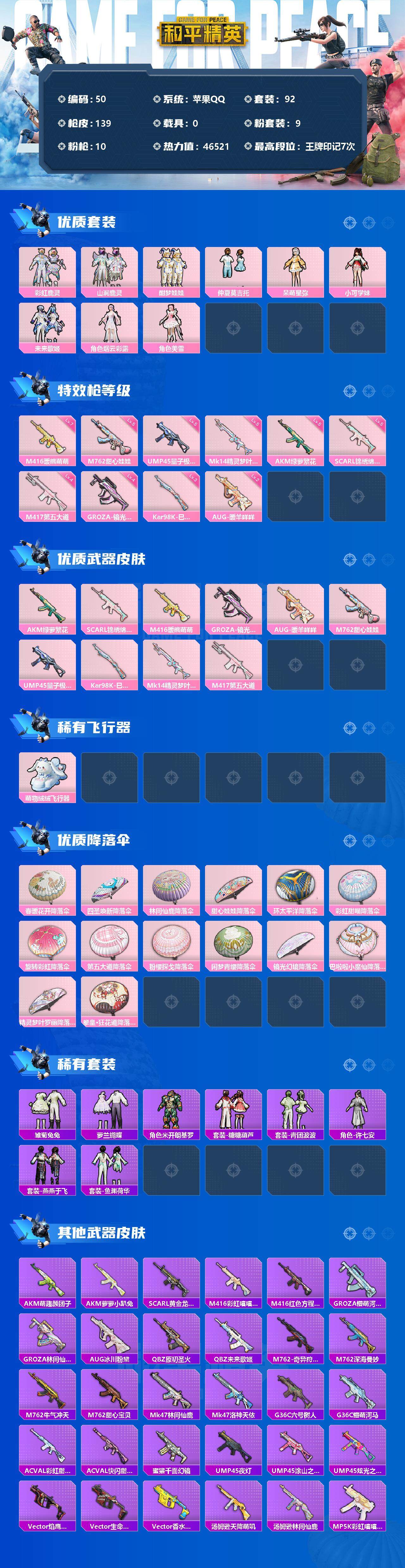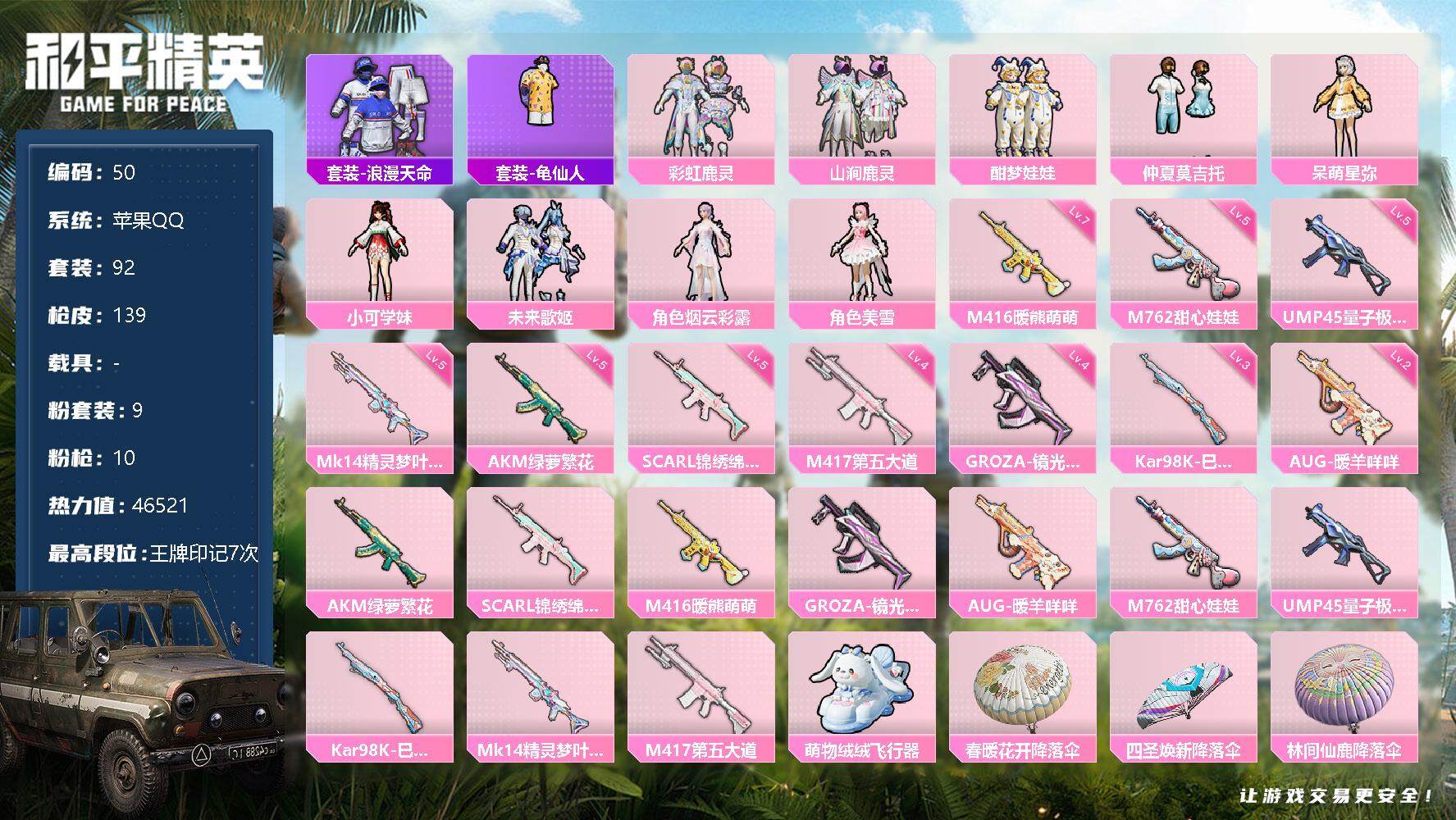 [12397663]【商品标题】:苹果 手Q-9粉装-10特效枪-0载具-1粉色飞行器-46521热力值-7王牌印记-92套装-139枪皮 【热门品类】:套装-浪漫天命,套装-龟仙人 【粉色套装】:粉装-彩虹鹿灵,粉装-山涧鹿灵,粉装-酣梦娃娃,粉装-仲夏莫吉托,角色-呆萌星弥,角色-小可学妹,粉装-未来歌姬,角色-烟云彩露,角色-美雪 【粉色枪皮等级】:AKM-绿萝繁花(五级),SCAR-L-锦绣绵绵(五级),M416-暖熊萌萌(七级),GROZA-镜光银凌(四级),AUG-暖羊咩咩(二级),M762-甜心娃娃(五级),UMP45-量子极限(五级),Kar98K-巳巳如意(三级),Mk14-精灵梦叶罗丽(五级),M417-第五大道(四级) 【粉色枪皮】:AKM-绿萝繁花,SCAR-L-锦绣绵绵,M416-暖熊萌萌,GROZA-镜光银凌,AUG-暖羊咩咩,M762-甜心娃娃,UMP45-量子极限,Kar98K-巳巳如意,Mk14-精灵梦叶罗丽,M417-第五大道 【粉色飞行器】:萌物绒绒飞行器 【粉色降落伞】:春暖花开降落伞,四圣焕新降落伞,林间仙鹿降落伞,甜心娃娃降落伞,环太平洋降落伞,彩虹甜喵降落伞,旋转彩虹降落伞,第五大道降落伞,粉樱探戈降落伞,闲梦青缨降落伞,镜光幻境降落伞,巴啦啦小魔仙降落伞,精灵梦叶罗丽降落伞,拳皇·狂花道降落伞 【稀有套装】:套装-龟仙人,套装-雏菊兔兔,套装-萝兰蝴蝶,角色-米开朗基罗,套装-糖糖葫芦,套装-青团波波,角色-许七安,套装-燕燕于飞,套装-鱼渊荷华 【稀有枪皮】:AKM-萌趣颜团子,AKM-萝萝小趴兔,SCAR-L-黄金龙骨,M416-彩虹嘻嘻猴,M416-红色方程式,GROZA-懵萌河马,GROZA-林间仙鹿,AUG-冰川粉黛,QBZ-原初圣火,QBZ-未来歌姬,M762-奇异狩猎者,M762-深海曼妙,M762-牛气冲天,M762-甜心宝贝,Mk47-林间仙鹿,Mk47-洛神天依,G36C-六号树人,G36C-懵萌河马,AC-VAL-彩虹甜喵,AC-VAL-快闪甜心,蜜獾-千面幻镜,UMP45-夜灯,UMP45-涂山之恋,UMP45-炫光之旅,Vector-焰鹰斗篷,Vector-生命誓言,Vector-香水柠檬,汤姆逊-天降萌叽,汤姆逊-林间仙鹿,MP5K-彩虹嘻嘻猴,MP5K-蓝莓炮弹,MP5K-飒粉甜心,P90-快闪甜心,P90