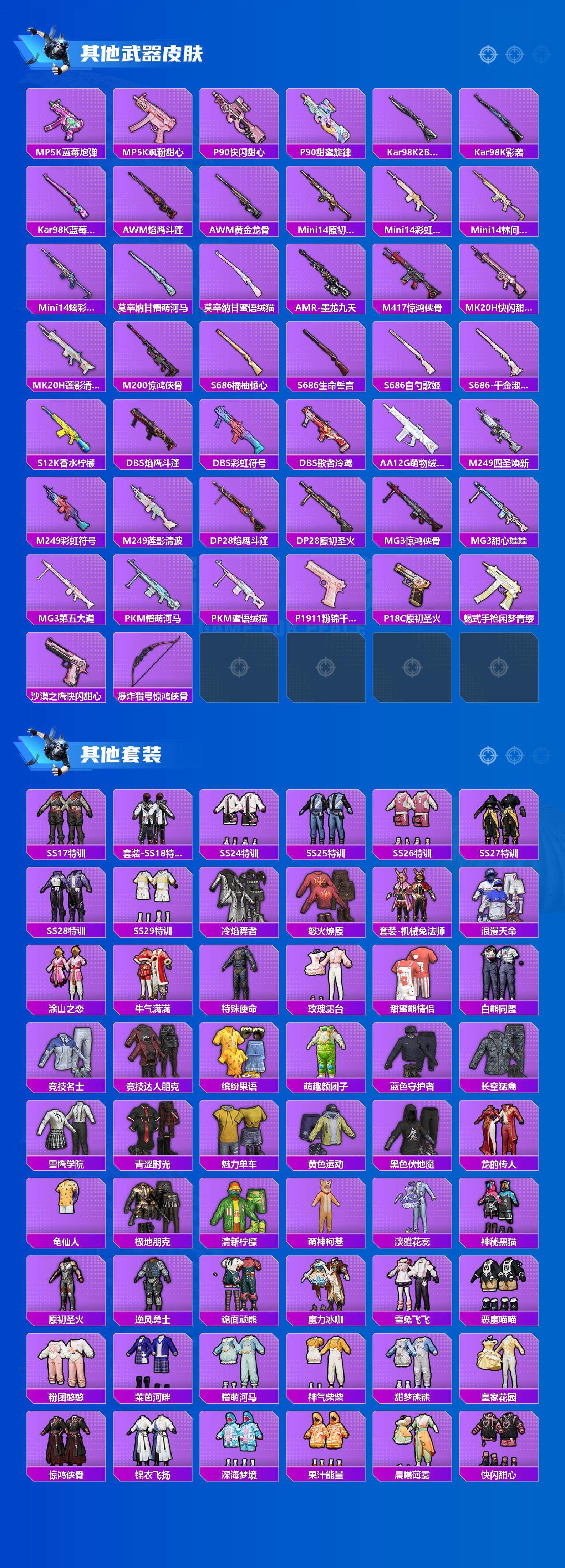 【稀有枪皮】:AKM-萌趣颜团子,AKM-萝萝小趴兔,SCAR-L-黄金龙骨,M416-彩虹嘻嘻猴,M416-红色方程式,GROZA-懵萌河马,GROZA-林间仙鹿,AUG-冰川粉黛,QBZ-原初圣火,QBZ-未来歌姬,M762-奇异狩猎者,M762-深海曼妙,M762-牛气冲天,M762-甜心宝贝,Mk47-林间仙鹿,Mk47-洛神天依,G36C-六号树人,G36C-懵萌河马,AC-VAL-彩虹甜喵,AC-VAL-快闪甜心,蜜獾-千面幻镜,UMP45-夜灯,UMP45-涂山之恋,UMP45-炫光之旅,Vector-焰鹰斗篷,Vector-生命誓言,Vector-香水柠檬,汤姆逊-天降萌叽,汤姆逊-林间仙鹿,MP5K-彩虹嘻嘻猴,MP5K-蓝莓炮弹,MP5K-飒粉甜心,P90-快闪甜心,P90