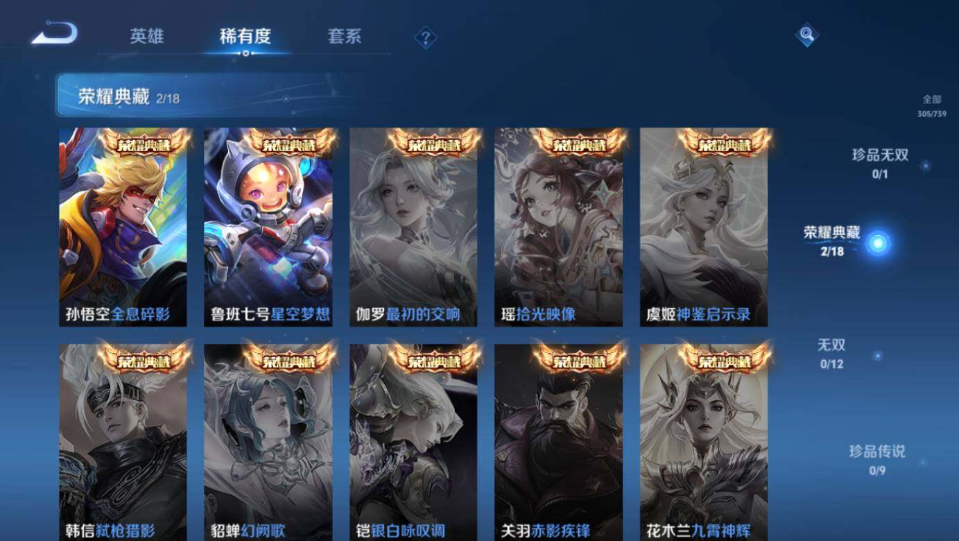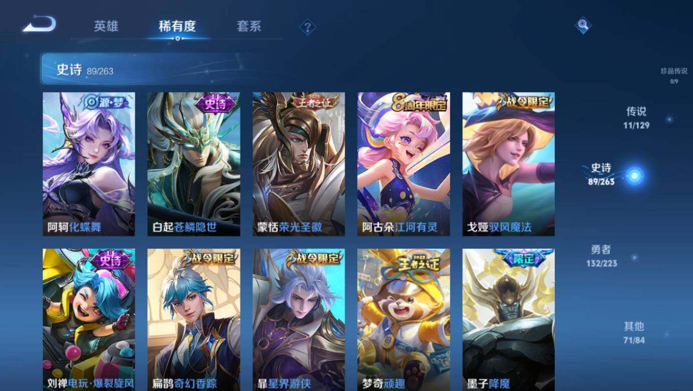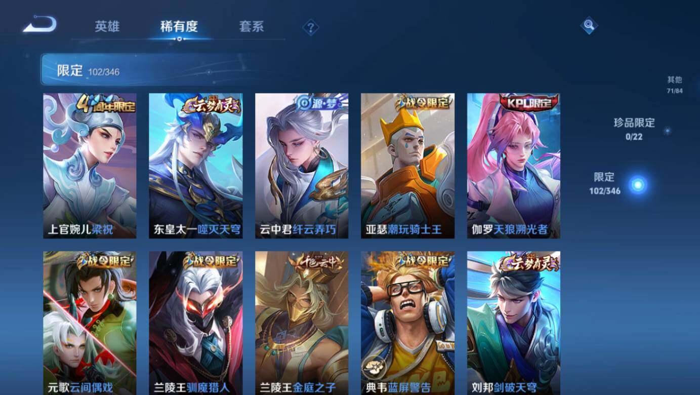 【限定皮肤】:白起狰,姜子牙天穹之誓,狄仁杰阴阳师,虞姬凯尔特女王,赵云皇家上将,墨子神迹守卫,墨子降魔,妲己热情桑巴,嬴政优雅恋人,嬴政白昼王子,鲁班七号狮舞东方,鲁班七号乒乒小将,鲁班七号寅虎瑞焰,庄周高山流水,高渐离玩趣恶龙,钟无艳超时空战士,扁鹊炼金王,扁鹊奇幻香踪,白起夜都怪侠,芈月白晶晶,芈月幻夜卜梦,吕布天魔缭乱,吕布猎兽之王,周瑜赤莲之焰,元歌云间偶戏,夏侯惇朔风刀,甄姬女儿国国王,甄姬游园惊梦,甄姬落雪兰心,曹操烛龙,典韦蓝屏警告,马可波罗暗影游猎,狄仁杰魔术师,狄仁杰万华元夜,达摩星际陆战队,达摩沙漠行僧,项羽海滩派对,老夫子醍醐杖,老夫子航海奇遇记,程咬金演武夺筹,王昭君午后时光,兰陵王驯魔猎人,兰陵王金庭之子,亚瑟潮玩骑士王,孙悟空美猴王,孙悟空至尊宝,孙悟空孙行者,牛魔御旌,后羿圣弓游侠,李元芳银河之约,李元芳云中旅人,虞姬启明星使,钟馗神迹守卫,钟馗驱傩正仪,杨玉环遇见飞天,杨戬潮玩骑兵,女娲朔望之晖,干将莫邪真爱魔法,雅典娜单词大作战,雅典娜黎明之约,蔡文姬繁星吟游,太乙真人饕餮,鬼谷子原初探秘者,鬼谷子五谷丰年,黄忠烈魂,黄忠火炮绅士,苏烈千军破阵,百里玄策原初追逐者,弈星混沌棋,梦奇顽趣,沈梦溪星空之诺,沈梦溪大漠名商,明世隐疑决卦,明世隐吟游魔法,裴擒虎李小龙,裴擒虎擒涛扼浪,狂铁电玩高手,米莱狄御霄,米莱狄胡桃异想国,云中君纤云弄巧,李信山海炽霜斩,伽罗天狼溯光者,盾山御銮,猪八戒西部大镖客,猪八戒猪悟能,上官婉儿梁祝,嫦娥拒霜思,嫦娥暖冬兔眠,西施玲珑珍味,蒙犽狂想玩偶喵,鲁班大师探海日志,桑启海盐诗旅,暃星界游侠,戈娅驭风魔法,阿古朵江河有灵,张良古海寻踪,蒙恬荣光圣徽,鬼谷子天穹祈灯,刘邦剑破天穹