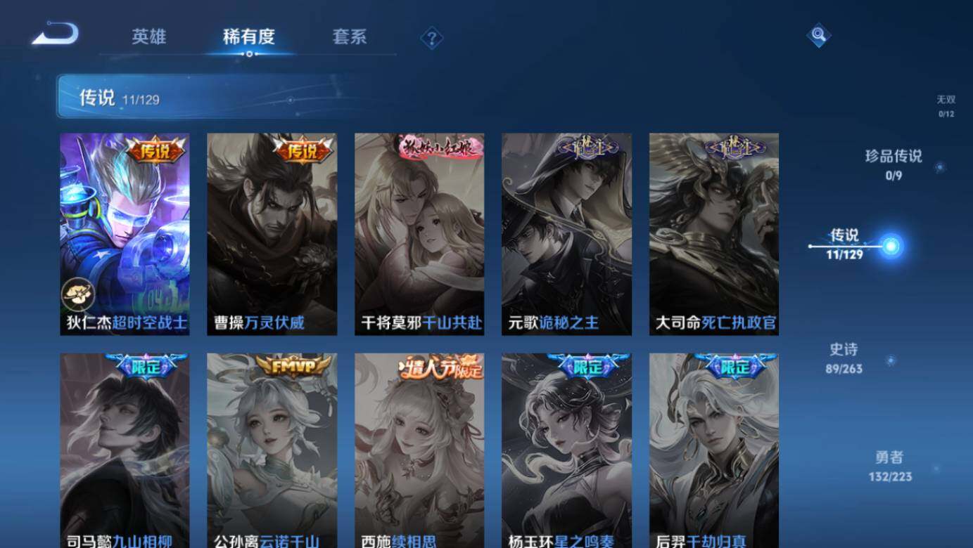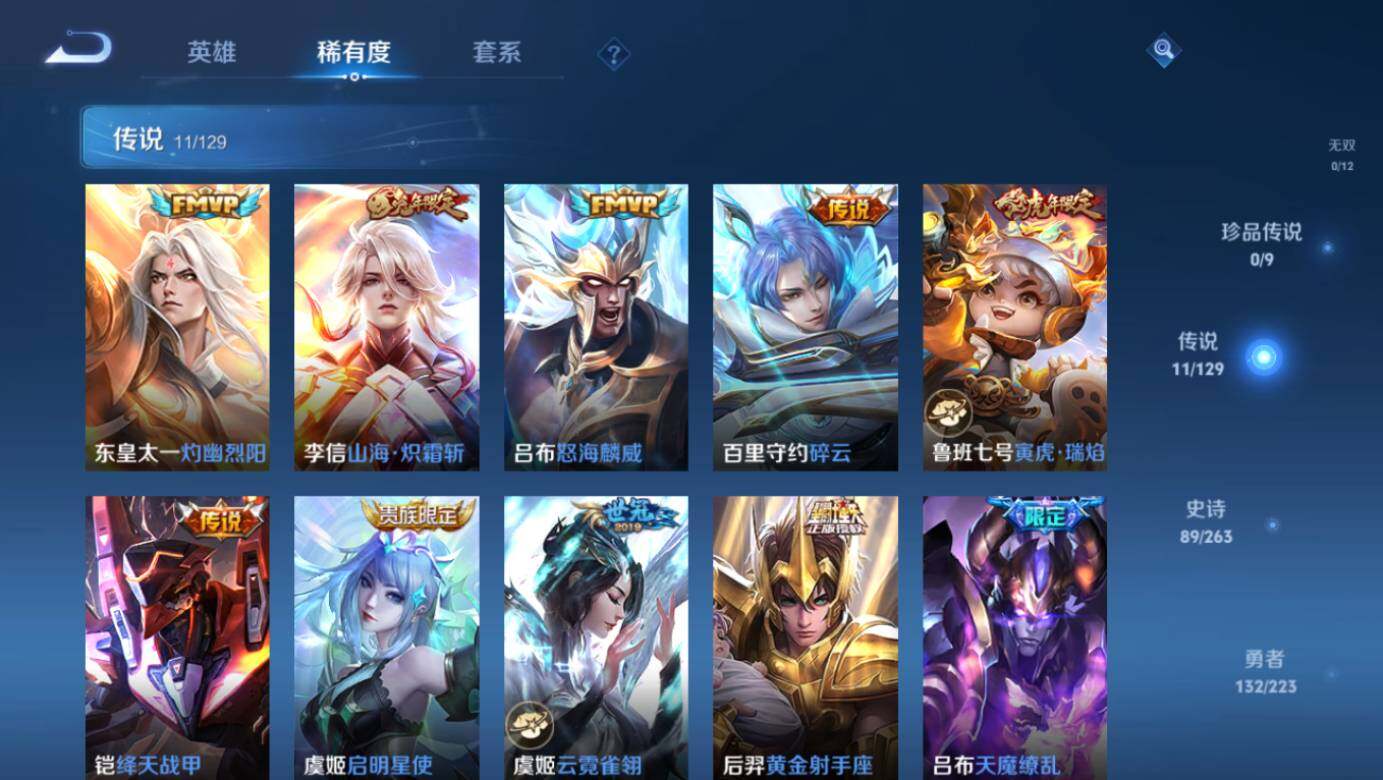 【传说皮肤】:东皇太一灼幽烈阳,李信山海炽霜斩,吕布怒海麟威,百里守约碎云,鲁班七号寅虎瑞焰,铠绛天战甲,虞姬启明星使,虞姬云霓雀翎,后羿黄金射手座,吕布天魔缭乱,狄仁杰超时空战士