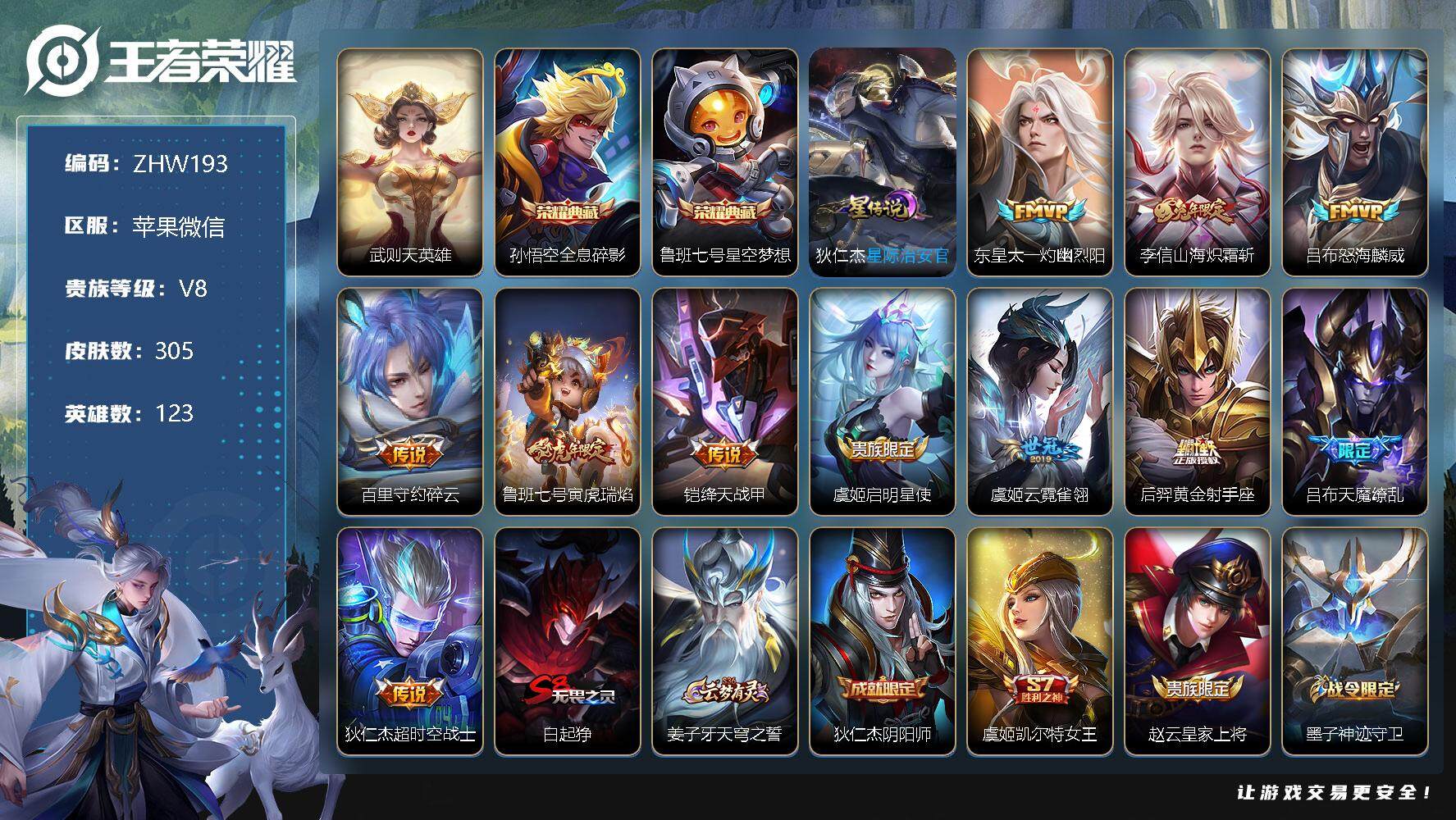 [12397708]【商品标题】:苹果WX-V8-尊贵铂金III段位-123英雄-305皮肤-2典藏-0珍品无双-0无双-0珍品传说-11传说-89史诗