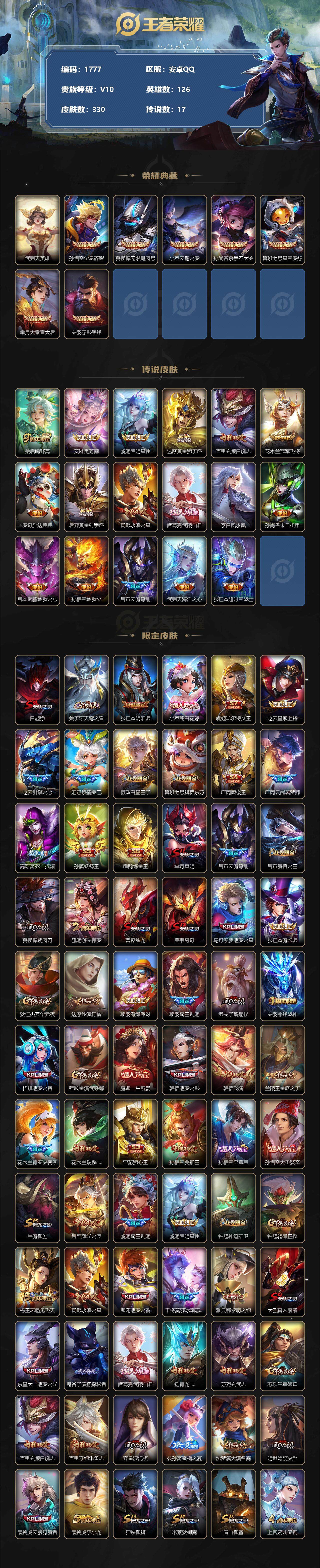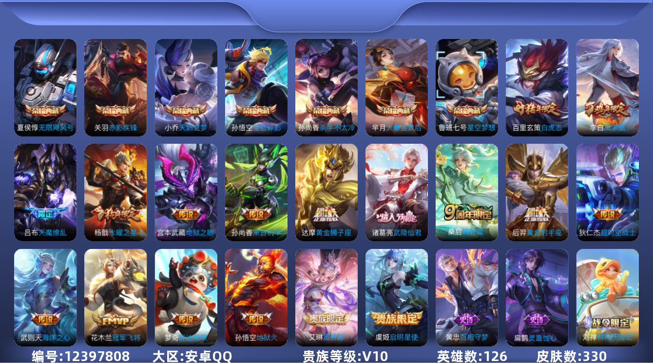 [12397808]【商品标题】:安卓Q-V10-至尊星耀V段位-126英雄-330皮肤-7典藏-0珍品无双-0无双-0珍品传说-17传说-87史诗