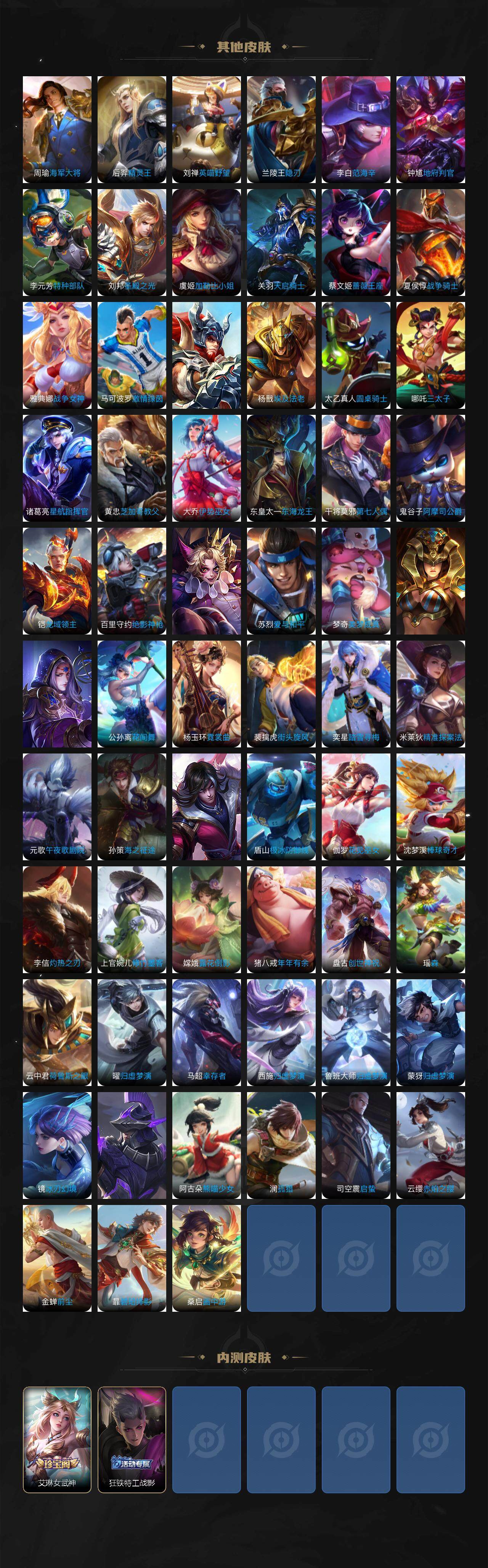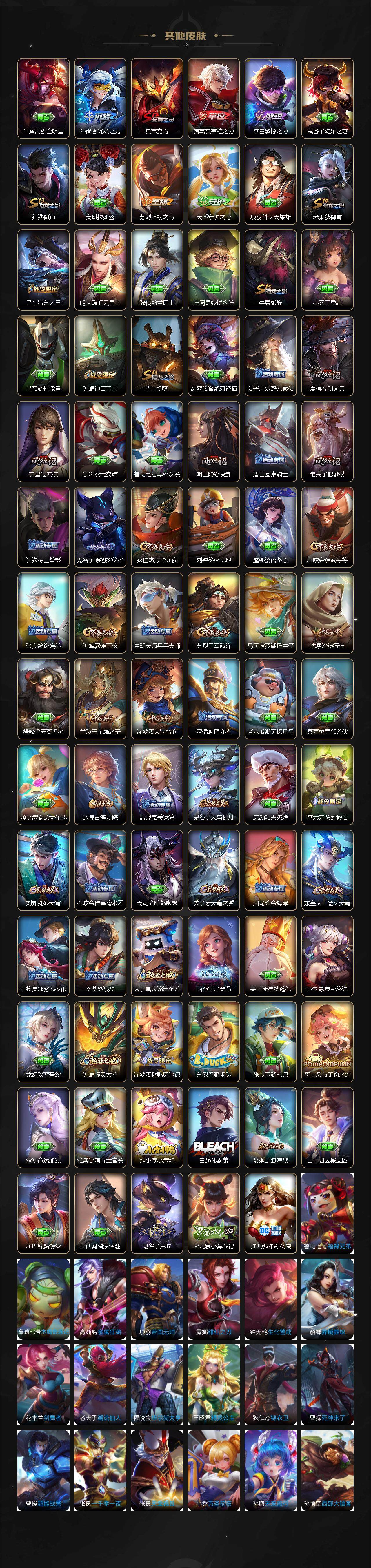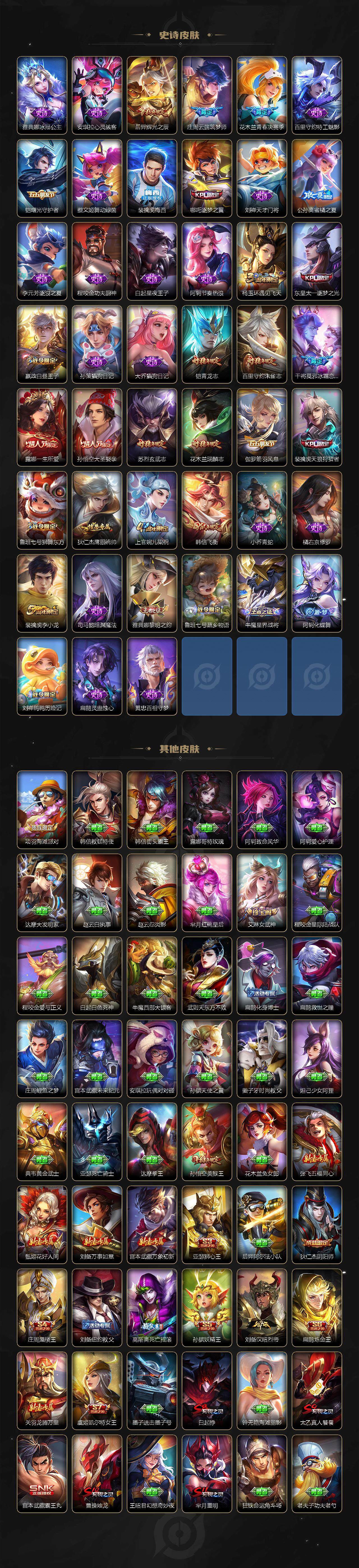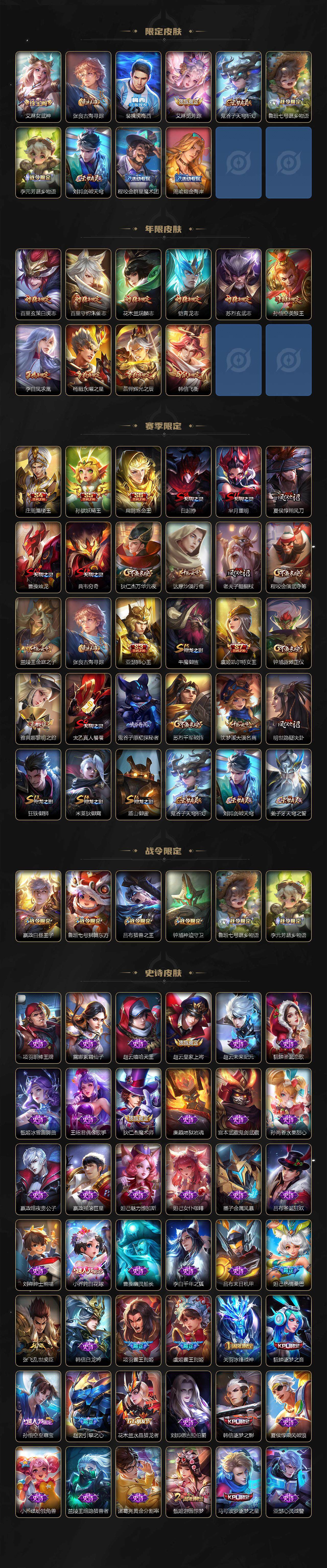 【限定皮肤】:白起狰,姜子牙天穹之誓,狄仁杰阴阳师,小乔纯白花嫁,虞姬凯尔特女王,赵云皇家上将,赵云引擎之心,妲己热情桑巴,嬴政白昼王子,鲁班七号狮舞东方,庄周蜃楼王,庄周云端筑梦师,高渐离死亡摇滚,孙膑妖精王,扁鹊炼金王,芈月重明,吕布天魔缭乱,吕布猎兽之王,夏侯惇朔风刀,甄姬游园惊梦,曹操烛龙,典韦穷奇,马可波罗逐梦之星,狄仁杰魔术师,狄仁杰万华元夜,达摩沙漠行僧,项羽海滩派对,项羽霸王别姬,老夫子醍醐杖,关羽冰锋战神,貂蝉逐梦之音,程咬金演武夺筹,露娜一生所爱,韩信逐梦之影,韩信飞衡,兰陵王金庭之子,花木兰青春决赛季,花木兰瑞麟志,亚瑟狮心王,孙悟空美猴王,孙悟空至尊宝,孙悟空大圣娶亲,牛魔御旌,后羿辉光之辰,虞姬霸王别姬,虞姬启明星使,钟馗神迹守卫,钟馗驱傩正仪,杨玉环遇见飞天,杨戬永曜之星,哪吒逐梦之翼,干将莫邪冰霜恋舞曲,雅典娜黎明之约,太乙真人饕餮,东皇太一逐梦之光,鬼谷子原初探秘者,诸葛亮武陵仙君,铠青龙志,苏烈玄武志,苏烈千军破阵,百里玄策白虎志,百里守约朱雀志,弈星混沌棋,公孙离蜜橘之夏,沈梦溪大漠名商,明世隐疑决卦,裴擒虎天狼狩猎者,裴擒虎李小龙,狂铁御狮,米莱狄御霄,盾山御銮,上官婉儿梁祝,艾琳女武神,张良古海寻踪,裴擒虎梅西,艾琳觅芳踪,鬼谷子天穹祈灯,鲁班七号蔬乡物语,李元芳蔬乡物语,刘邦剑破天穹,程咬金群星魔术团,周瑜熔金海岸