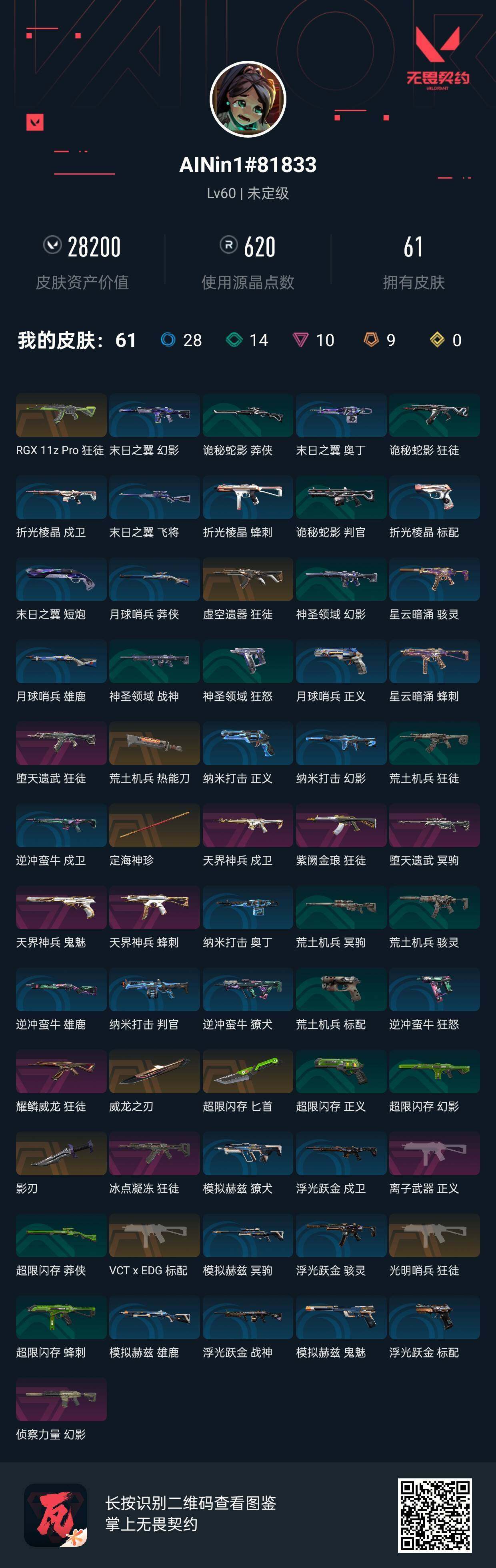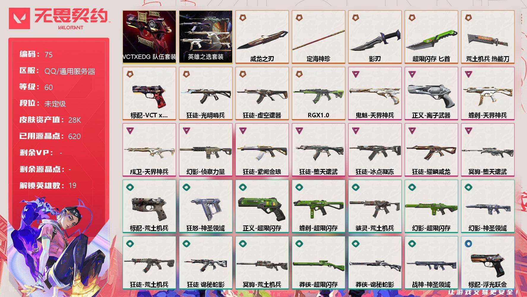 [12398014]【套装】:VCTxEDG 队伍套装,英雄之选套装 【英雄】:幻棱,炼狱,维斯,暮蝶,壹决,铁臂,捷风,雷兹,幽影,不死鸟,贤者,猎枭,蝰蛇,零,芮娜,尚勃勒,霓虹,星礈,盖可 【近战 武器】:近战武器-威龙之刃,近战武器-超限闪存 匕首,近战武器-定海神珍,近战武器-荒土机兵 热能刀,近战武器-影刃 【狂徒】:狂徒-光明哨兵,狂徒-虚空遗器,狂徒-RGX 11z Pro,狂徒-冰点凝冻,狂徒-堕天遗武,狂徒-耀鳞威龙,狂徒-紫阙金琅,狂徒-荒土机兵,狂徒-诡秘蛇影 【幻影】:幻影-侦察力量,幻影-超限闪存,幻影-神圣领域,幻影-纳米打击,幻影-末日之翼 【戍卫】:戍卫-天界神兵,戍卫-浮光跃金,戍卫-逆冲蛮牛,戍卫-折光棱晶 【獠犬】:獠犬-模拟赫兹,獠犬-逆冲蛮牛 【冥驹】:冥驹-堕天遗武,冥驹-荒土机兵,冥驹-模拟赫兹 【飞将】:飞将-末日之翼 【莽侠】:莽侠-超限闪存,莽侠-诡秘蛇影,莽侠-月球哨兵 【战神】:战神-神圣领域,战神-浮光跃金 【奥丁】:奥丁-纳米打击,奥丁-末日之翼 【判官】:判官-诡秘蛇影,判官-纳米打击x 【雄鹿】:雄鹿-模拟赫兹,雄鹿-逆冲蛮牛,雄鹿-月球哨兵 【骇灵】:骇灵-荒土机兵,骇灵-浮光跃金,骇灵-星云暗涌 【蜂刺】:蜂刺-天界神兵,蜂刺-超限闪存,蜂刺-星云暗涌,蜂刺-折光棱晶 【标配】:标配-荒土机兵,标配-浮光跃金,标配-折光棱晶 【VCT手枪】:标配-VCT x EDG 【正义】:正义-离子武器,正义-超限闪存,正义-纳米打击,正义-月球哨兵 【鬼魅】:鬼魅-天界神兵,鬼魅-模拟赫兹 【狂怒】:狂怒-神圣领域,狂怒-逆冲蛮牛 【短炮】:短炮-末日之翼 【卡面】:进入射程 卡面,分崩离析 卡面,纳米打击 卡面,抑制技术 卡面,激斗汉堡 卡面,瓦娃脸雪糕 P2 卡面,从黄昏到黎明 卡面,荒土机兵 卡面,银弹猎手 卡面,逆冲蛮牛 卡面,《双城之战》拥抱 卡面,精灵大战 卡面,欢迎来到底城 卡面,南瓜盛典 卡面,唱片的故事 卡面,钢弓与箭弦 卡面,排除故障 卡面,战术桌游 卡面,悠享食光 卡面,修车达人 卡面,模拟赫兹 卡面,浮光跃金 卡面,超限闪存 卡面,维斯工牌 卡面,正义的化身 卡面,代号红色 卡面,新兵报到 卡面,V契约 卡面,无畏契约 卡面 【喷漆】:小小心意 喷漆,战“素”兔 喷漆,宇宙的指引 喷漆,请求重启 喷漆