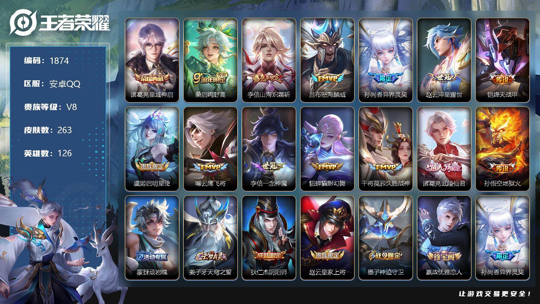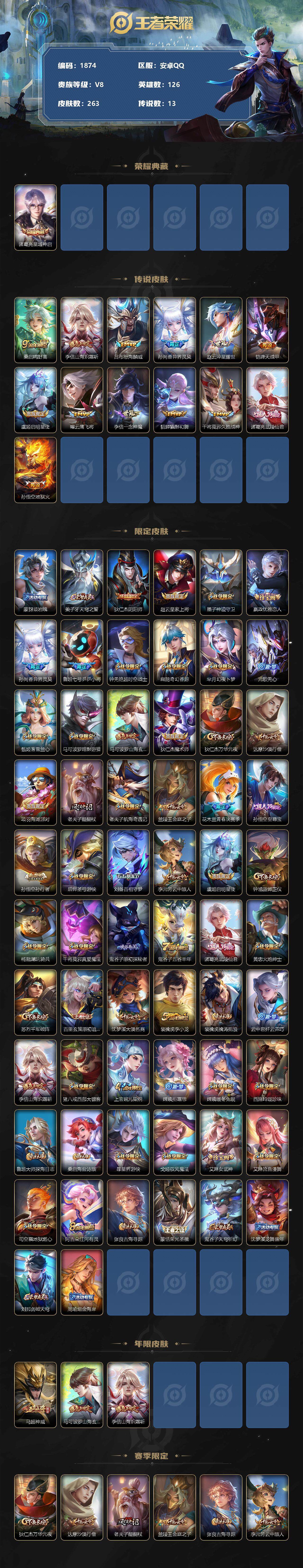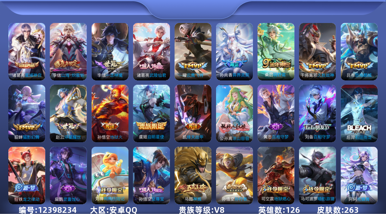 [12398234]【商品标题】:安卓Q-V8-最强王者段位-126英雄-263皮肤-1典藏-0珍品无双-0无双-0珍品传说-13传说-80史诗