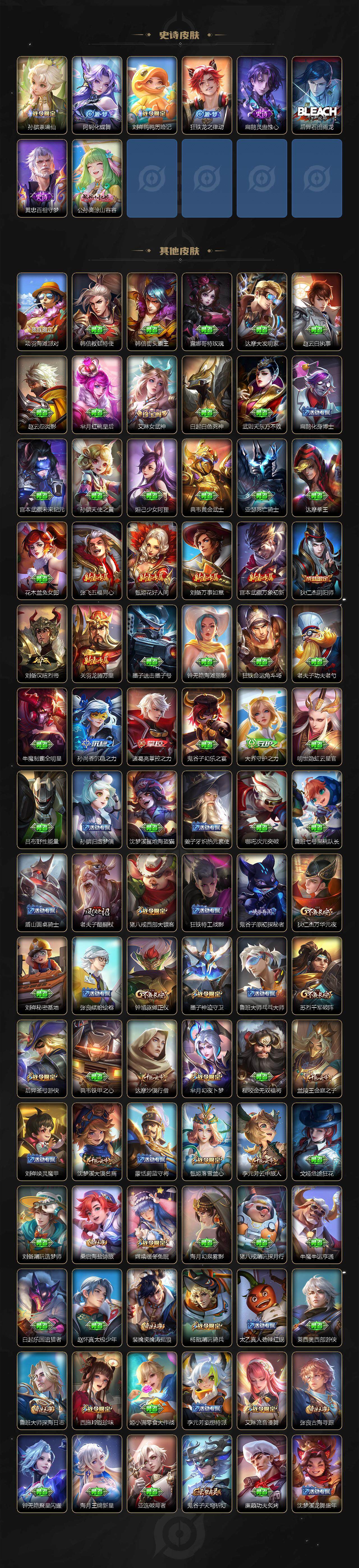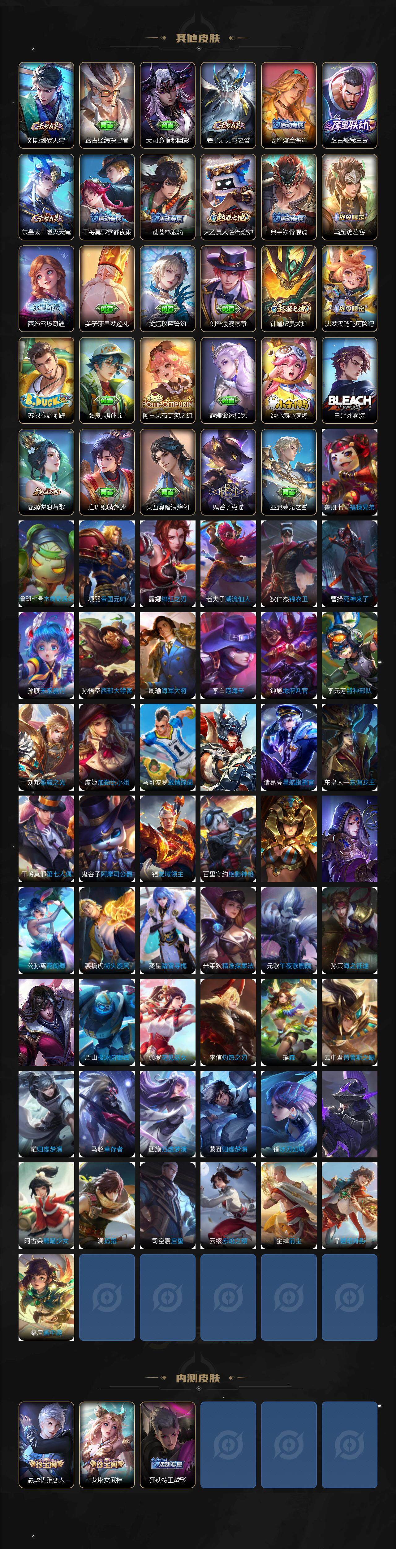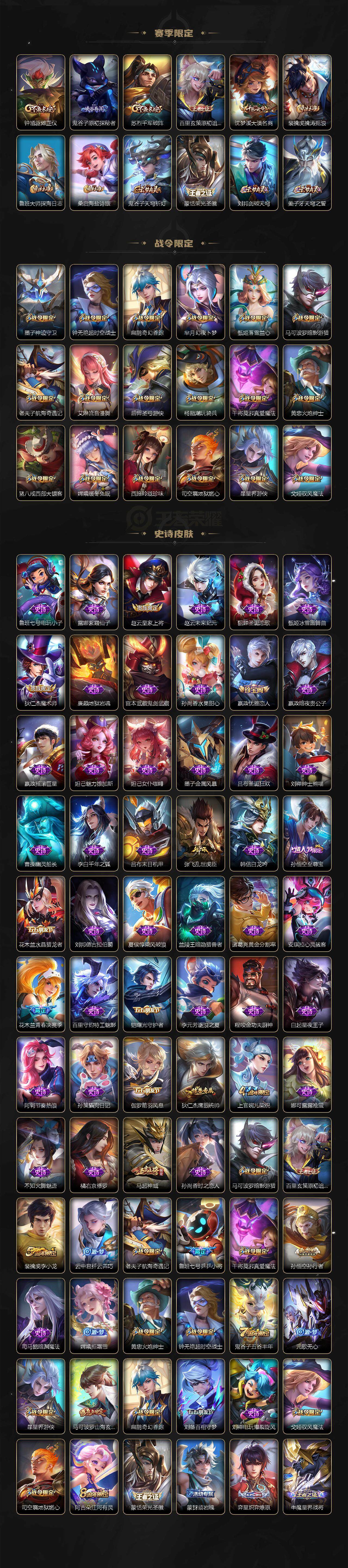 【限定皮肤】:蒙犽顽岩魄,姜子牙天穹之誓,狄仁杰阴阳师,赵云皇家上将,墨子神迹守卫,嬴政优雅恋人,孙尚香异界灵契,鲁班七号乒乒小将,钟无艳超时空战士,扁鹊奇幻香踪,芈月幻夜卜梦,元歌无心,甄姬落雪兰心,马可波罗暗影游猎,马可波罗山海玄木吟,狄仁杰魔术师,狄仁杰万华元夜,达摩沙漠行僧,项羽海滩派对,老夫子醍醐杖,老夫子航海奇遇记,兰陵王金庭之子,花木兰青春决赛季,孙悟空至尊宝,孙悟空孙行者,后羿圣弓游侠,刘备百相守梦,李元芳云中旅人,虞姬启明星使,钟馗驱傩正仪,杨戬潮玩骑兵,干将莫邪真爱魔法,鬼谷子原初探秘者,鬼谷子五谷丰年,诸葛亮武陵仙君,黄忠火炮绅士,苏烈千军破阵,百里玄策原初追逐者,沈梦溪大漠名商,裴擒虎李小龙,裴擒虎擒涛扼浪,云中君纤云弄巧,李信山海炽霜斩,猪八戒西部大镖客,上官婉儿梁祝,嫦娥拒霜思,嫦娥暖冬兔眠,西施玲珑珍味,鲁班大师探海日志,桑启海盐诗旅,暃星界游侠,戈娅驭风魔法,艾琳女武神,艾琳流音漫舞,司空震地狱燃心,阿古朵江河有灵,张良古海寻踪,蒙恬荣光圣徽,鬼谷子天穹祈灯,沈梦溪龙舞盛年,刘邦剑破天穹,周瑜熔金海岸