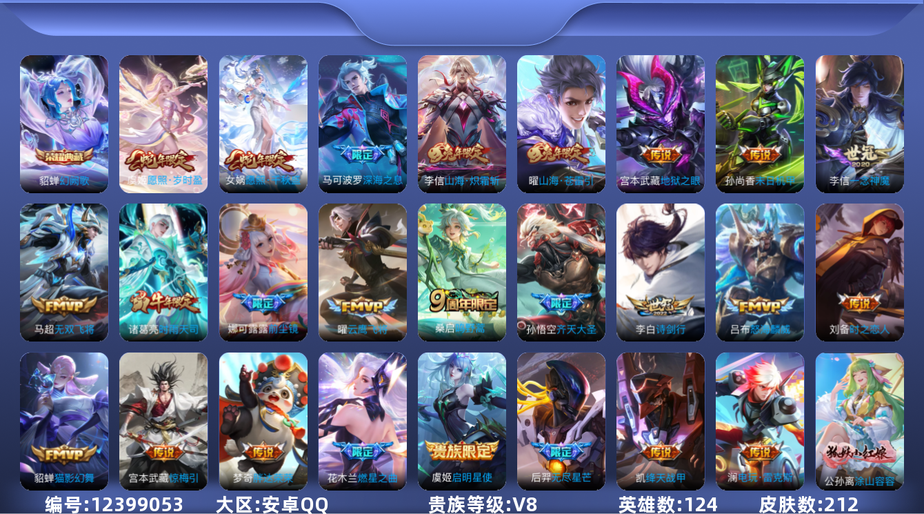 [12399053]【商品标题】:安卓Q-V8-至尊星耀V段位-124英雄-211皮肤-1典藏-0珍品无双-0无双-0珍品传说-25传说-74史诗
