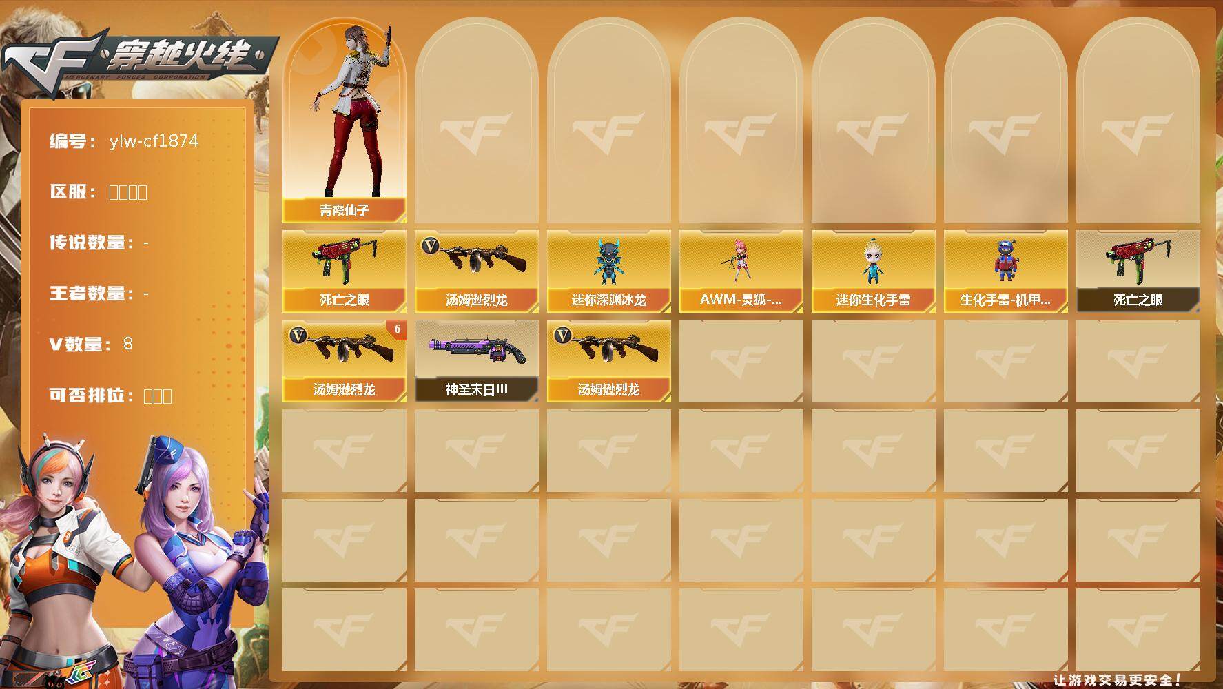- [11250290]总资产:170.6M 7传说枪械 哈夫币:100K 顶级安全箱(9.17到期) 可二次 可修改实名 优质装备:顶级安全箱(3x3) 烽火地带段位:铂金 全面战场段位:无段位 传说武器皮肤:M4A1突击步枪-阿米娅,CAR-15突击步枪-阿米娅,AWM狙击步枪-捞点薯条,腾龙突击步枪-捞点薯条,93R-捞点薯条,勇士冲锋枪-能天使-午夜邮差,Vector冲锋枪-能天使-午夜邮差 史诗武器皮肤:勇士冲锋枪-深海恐惧,AKM突击步枪-林中猎手,M16A4突击步枪-竞赛选手,M1014霰弹枪-林中猎手,SV-98狙击步枪-林中猎手,PTR-32突击步枪-英雄,SCAR-H战斗步枪-囚徒,Vector冲锋枪-阿萨拉文明