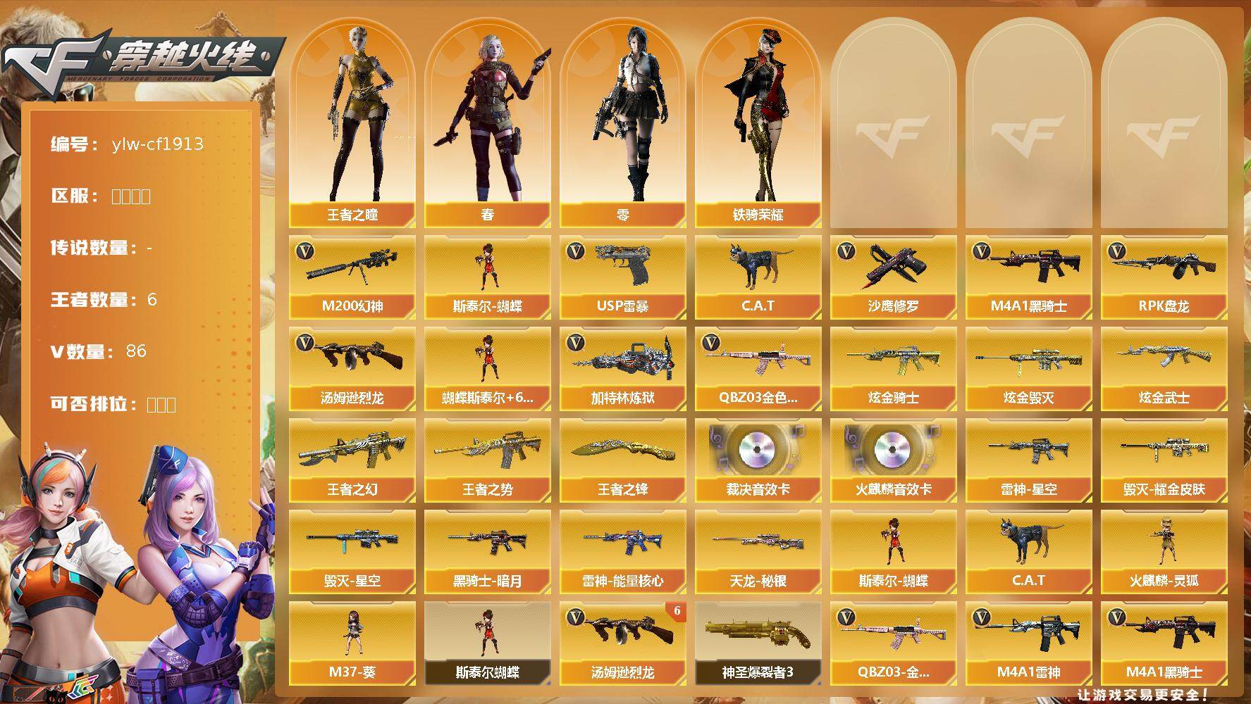 [12401221]【商品标题】:福建一区-86V-6王者-3炫金 【热门武器】:QBZ03-金色蔷薇,M200-幻神,C.A.T,M4A1-黑骑士*4,汤姆逊-烈龙*9,RPK-盘龙,加特林-炼狱,斯泰尔-蝴蝶,USP-雷暴,沙鹰-修罗*4 【王者炫金武器】:炫金骑士,炫金毁灭,炫金武士,王者之幻,王者之势,王者之锋 【音效卡】:AK47-火麒麟音效卡,AWM-裁决音效卡 【稀有皮肤】:雷神-能量核心,雷神-星空,黑骑士-暗月,毁灭耀金皮肤,毁灭-星空,天龙-秘银 【角色】:王者之瞳,零,春,铁骑荣耀 【人偶武器】:斯泰尔-蝴蝶,火麒麟-灵狐,M37-葵,C.A.T 【暴走生化】:斯泰尔-蝴蝶 【挑战大师】:神圣爆裂者III 【英雄级武器】:AK47-雷暴,USP-雷暴,斩神刀-雷暴,QBZ03-金色蔷薇,M4A1-雷神*2,M4A1-黑骑士*4,RPK-盘龙,加特林-炼狱,汤姆逊-烈龙*9,AK47-无影,AK47-火麒麟,AK47-黑武士,AWM-天龙,Barrett-毁灭*2,Barrett-极光*2,AWM-裁决*3,M4A1-龙血*2,AA-12-雷霆*3,M200-幻神,AK47-黑鲨*2,沙鹰-天神*2,沙鹰-修罗*4,麒麟刺*5,龙啸,屠龙*3 【特殊枪械】:蝴蝶斯泰尔+6烈龙,,4黑骑士,6烈龙,1盘龙,1炼狱,1蝴蝶斯泰尔