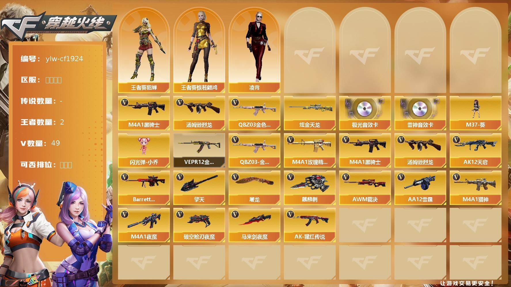 [12401755]【商品标题】:四川一区-49V-2王者-1炫金 【热门武器】:QBZ03-金色蔷薇,M4A1-黑骑士,汤姆逊-烈龙 【王者炫金武器】:炫金天龙 【音效卡】:M4A1-雷神音效卡,Barrett-极光音效卡 【角色】:王者-葵-貂蝉,王者葵-惊若翩鸿,凌霄 【人偶武器】:M37-葵,闪光弹-小乔 【挑战大师】:VEPR-12-金魔*3 【英雄级武器】:M4A1-夜魔*2,破空枪刃-夜魔*2,马来剑-夜魔,QBZ03-金色蔷薇,M4A1-玫瑰精灵,M4A1-黑骑士,汤姆逊-烈龙,AK12-天启,Barrett-极光,AWM-裁决*3,AA-12-雷霆*2,M4A1-猎神,AK-47-猩红传说,麒麟刺,擎天*3,屠龙*2 【特殊枪械】:,1黑骑士,1烈龙