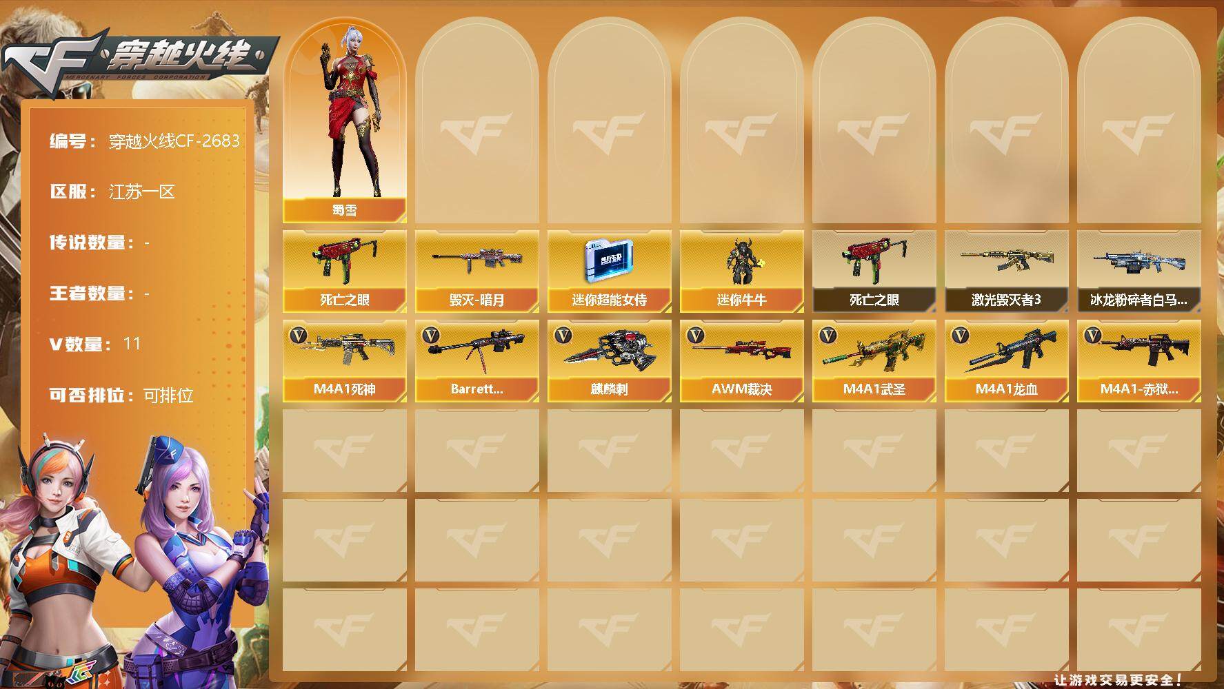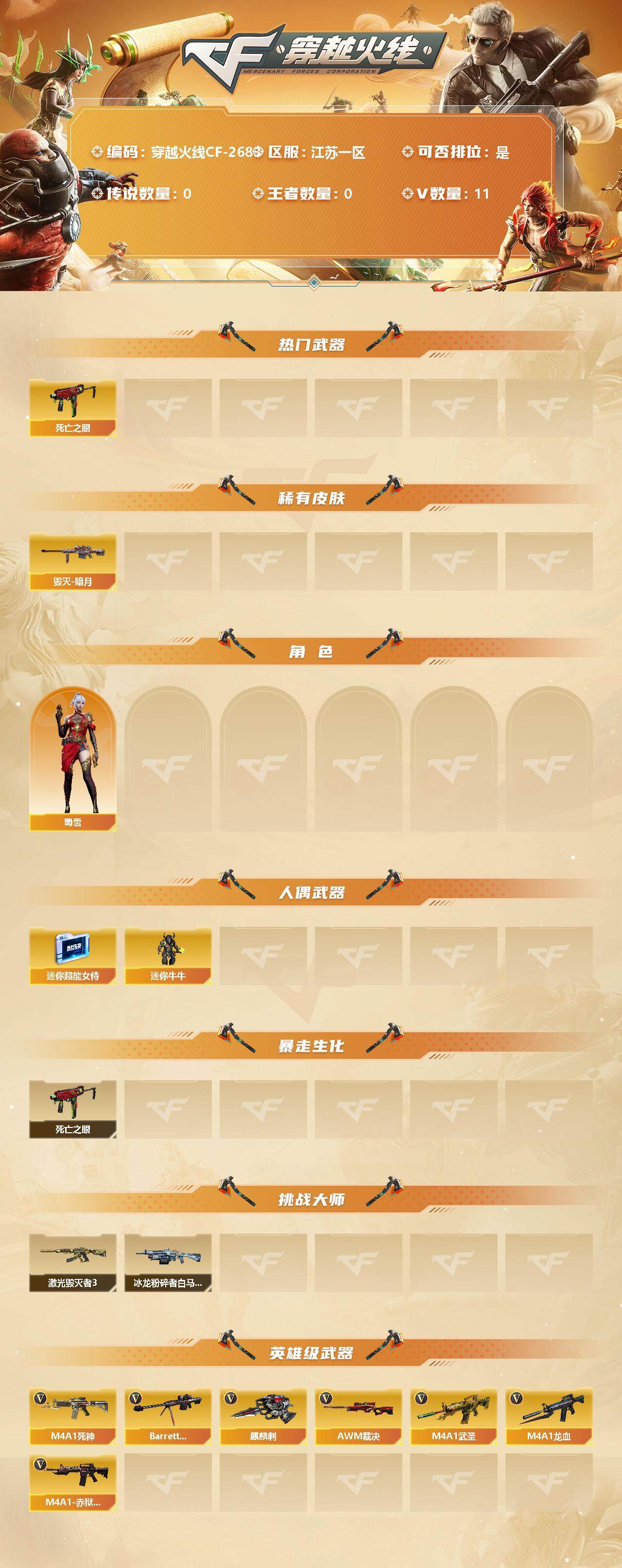 [12401801]【商品标题】:江苏一区-11V-0王者-0炫金 【热门武器】:死亡之眼 【稀有皮肤】:毁灭-暗月 【角色】:蜀雪 【人偶武器】:迷你超能女侍,迷你牛牛 【暴走生化】:死亡之眼 【挑战大师】:激光毁灭者III,冰龙粉碎者-白马银枪 【英雄级武器】:M4A1-武圣,M4A1-死神,Barrett-毁灭,AWM-裁决,M4A1-龙血,M4A1-赤狱骑士,麒麟刺*3 【特殊枪械】: