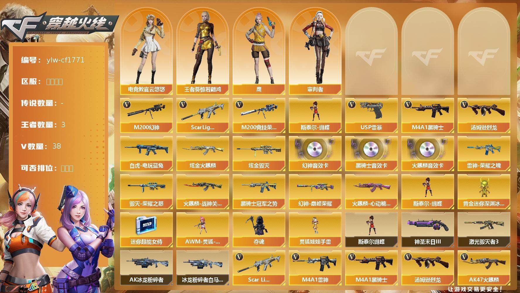 [12401837]【商品标题】:山西一区-38V-3王者-2炫金 【热门武器】:Scar Light-白虎,M200-幻神,M200-竞技荣光,白虎-电玩蓝兔,M4A1-黑骑士,汤姆逊-烈龙*2,斯泰尔-蝴蝶,USP-雷暴 【王者炫金武器】:炫金火麒麟,炫金毁灭 【音效卡】:M200-幻神音效卡,AK47-火麒麟音效卡,M4A1-黑骑士音效卡 【稀有皮肤】:幻神-巅峰荣耀,雷神-荣耀之魄,火麒麟-战神关羽,火麒麟-心动糖果,黑骑士-冠军之势,毁灭-荣耀之怒,AWM-CFS 2020 【角色】:王者葵-惊若翩鸿,电竞教官-云悠悠,鹰,审判者 【人偶武器】:斯泰尔-蝴蝶,AWM-灵狐-15周年嘉年华,黄金迷你深渊冰龙,迷你超能女侍,夺魂,灵狐娃娃手雷 【暴走生化】:斯泰尔-蝴蝶 【挑战大师】:神圣爆裂者-末日III,激光毁灭者III,AK47-冰龙粉碎者,冰龙粉碎者-白马银枪 【英雄级武器】:M200-竞技荣光,柯尔特-竞技荣光,擎天-竞技荣光,高爆手雷-竞技荣光*2,闪光弹-竞技荣光,USP-雷暴,Scar Light-白虎,白虎-电玩蓝兔,无影-神兵利器,M4A1-雷神,M4A1-黑骑士,汤姆逊-烈龙*2,AK47-火麒麟*2,AN94-超新星,AWM-天龙,Barrett-毁灭,Barrett-极光,M200-幻神,AK-47-猩红传说*3,AK47-B-战神*2,屠龙 【特殊枪械】:蝴蝶斯泰尔+2烈龙,1白虎,1黑骑士,2烈龙,,1蝴蝶斯泰尔