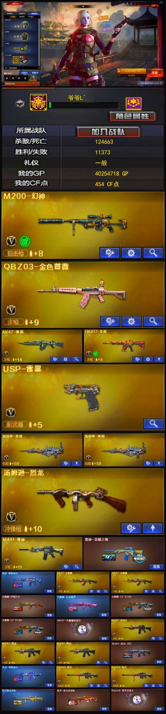 【热门武器】:QBZ03-金色蔷薇,HK417-朱雀,M200-幻神,M4A1-黑骑士,汤姆逊-烈龙,加特林-炼狱*2,USP-雷暴,沙鹰-修罗*3