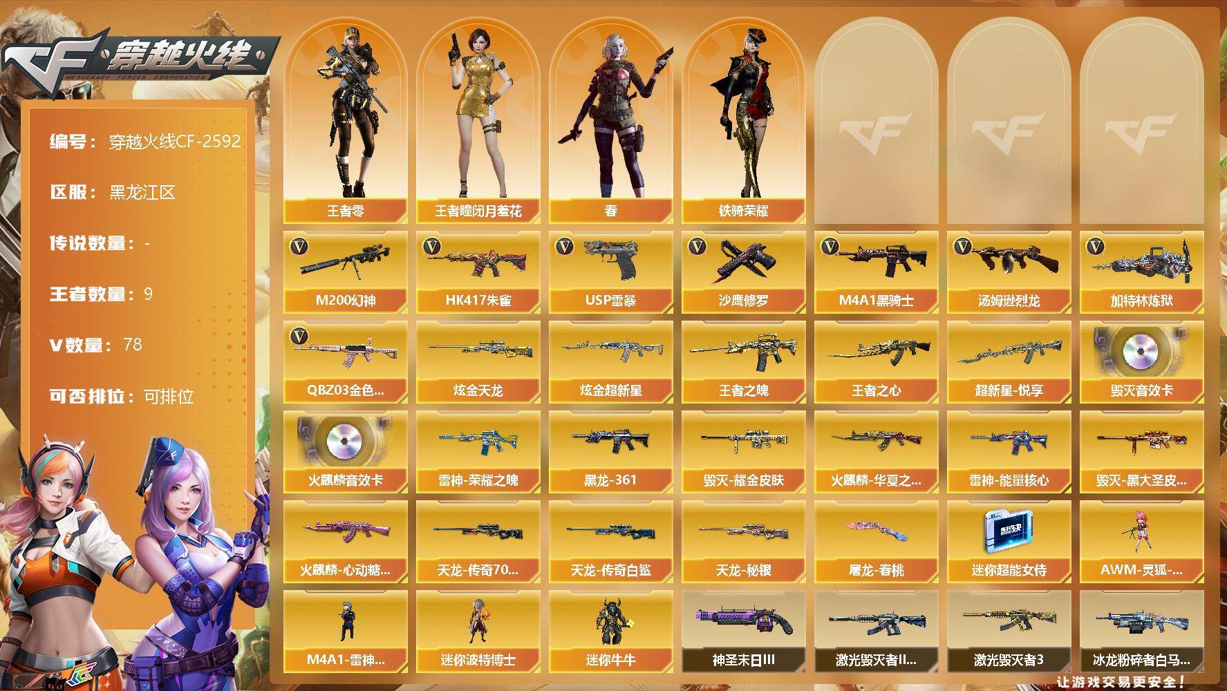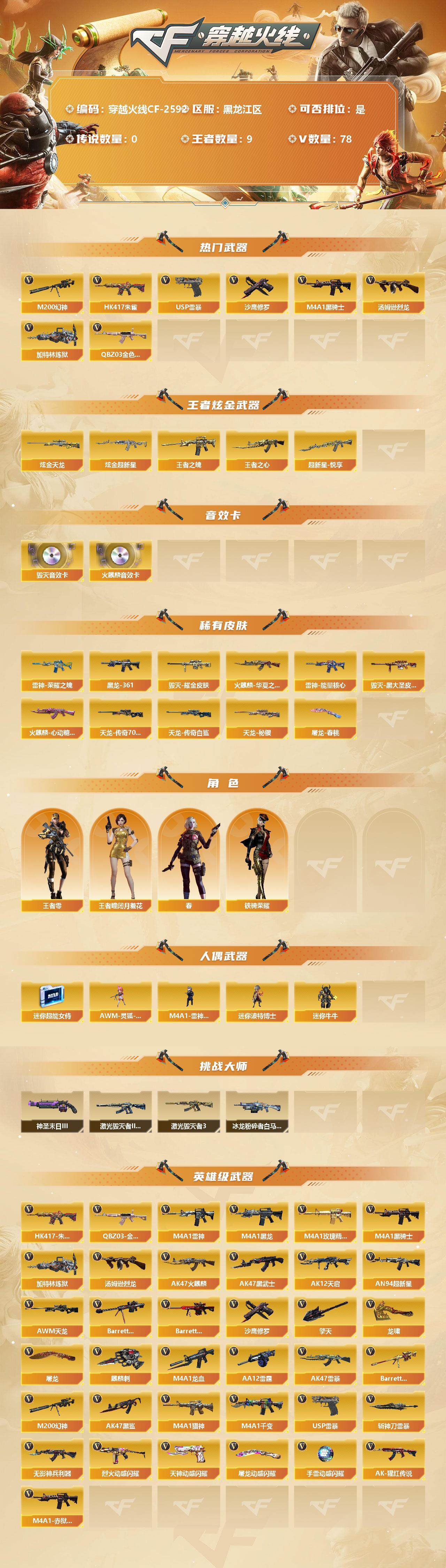 [12401810]【商品标题】:黑龙江区-78V-9王者-4炫金 【热门武器】:QBZ03-金色蔷薇,HK417-朱雀,M200-幻神,M4A1-黑骑士,汤姆逊-烈龙,加特林-炼狱*2,USP-雷暴,沙鹰-修罗*3 【王者炫金武器】:炫金天龙*3,炫金超新星,超新星-悦享,王者之魄,王者之心 【音效卡】:AK47-火麒麟音效卡,Barrett-毁灭音效卡 【稀有皮肤】:雷神-能量核心,雷神-荣耀之魄,火麒麟-华夏之心,火麒麟-心动糖果,M4A1-黑龙-361,毁灭耀金皮肤,毁灭-黑大圣皮肤,天龙-秘银,AWM-天龙-传奇70KG*2,AWM-天龙-传奇白鲨,屠龙-春桃 皮肤 【角色】:王者-瞳-闭月羞花,王者-零,春,铁骑荣耀 【人偶武器】:AWM-灵狐-15周年嘉年华,M4A1-雷神-精英刀锋,迷你超能女侍,迷你波特博士,迷你牛牛 【挑战大师】:神圣爆裂者-末日III,激光毁灭者III,激光毁灭者III-白马银枪,冰龙粉碎者-白马银枪*2 【英雄级武器】:AK47-雷暴,USP-雷暴,斩神刀-雷暴,烈火-动感闪耀,天神-动感闪耀,屠龙-动感闪耀,手雷-动感闪耀,QBZ03-金色蔷薇,HK417-朱雀,无影-神兵利器,M4A1-雷神,M4A1-黑龙*2,M4A1-玫瑰精灵,M4A1-黑骑士,加特林-炼狱*2,汤姆逊-烈龙,AK47-火麒麟*2,AK47-黑武士,AK12-天启,AN94-超新星,AWM-天龙,Barrett-毁灭*2,Barrett-极光,M4A1-龙血*2,AA-12-雷霆,Barrett-朱雀,M200-幻神,AK47-黑鲨*4,M4A1-猎神*2,M4A1-千变,AK-47-猩红传说,M4A1-赤狱骑士,沙鹰-修罗*3,麒麟刺*4,擎天*2,龙啸,屠龙*2 【特殊枪械】:1黑骑士,1烈龙,2炼狱
