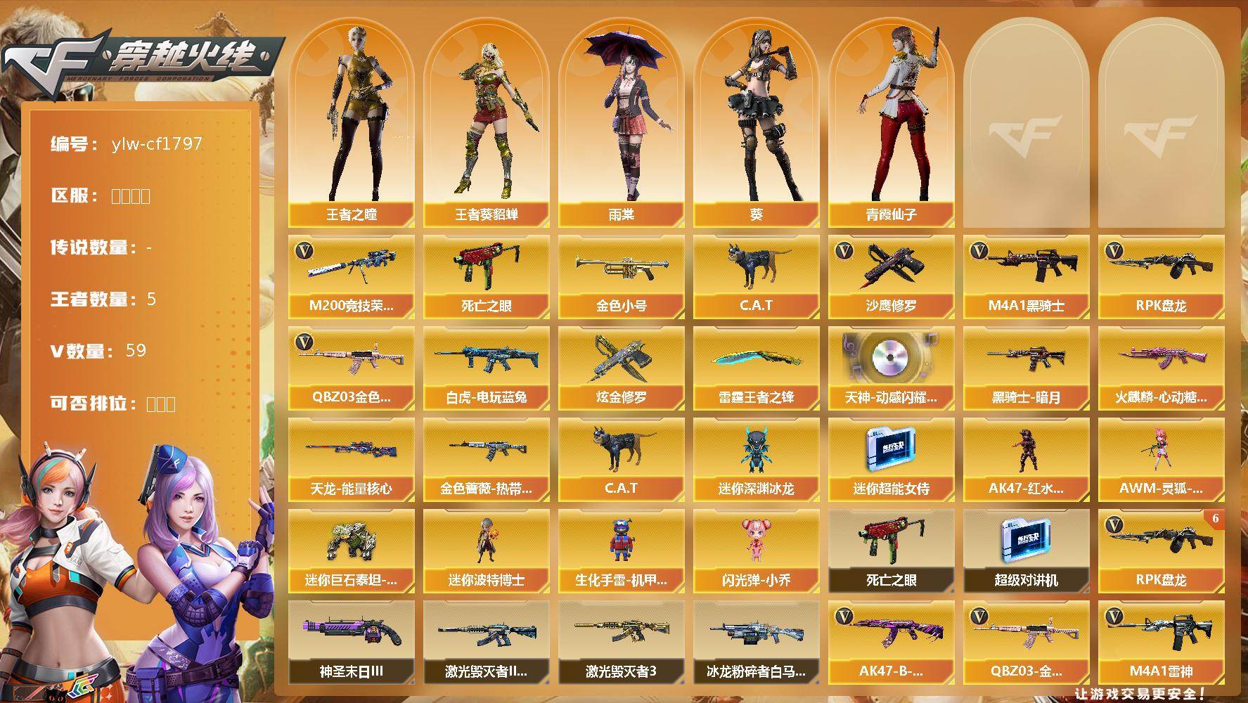 [12401842]【商品标题】:广西一区-59V-5王者-1炫金 【热门武器】:QBZ03-金色蔷薇,M200-竞技荣光,死亡之眼,白虎-电玩蓝兔,金色小号,C.A.T,M4A1-黑骑士,RPK-盘龙*6,沙鹰-修罗*3 【王者炫金武器】:炫金修罗,雷霆王者之锋 【音效卡】:天神-动感闪耀 音效卡 【稀有皮肤】:金色蔷薇-热带奇洋 皮肤,火麒麟-心动糖果,黑骑士-暗月,天龙-能量核心 【角色】:王者-葵-貂蝉,王者之瞳,葵,雨棠,青霞仙子 【人偶武器】:AK47-红水晶-斯沃特精英,AWM-灵狐-15周年嘉年华*2,C.A.T,迷你深渊冰龙,迷你超能女侍,迷你巨石泰坦-魔花研究所,迷你波特博士,生化手雷-机甲核心,闪光弹-小乔 【暴走生化】:死亡之眼,超级对讲机 【挑战大师】:神圣爆裂者-末日III,激光毁灭者III,激光毁灭者III-白马银枪,冰龙粉碎者-白马银枪*3 【英雄级武器】:M200-竞技荣光,高爆手雷-竞技荣光,烟雾弹-竞技荣光,闪光弹-竞技荣光,烈火-动感闪耀,天神-动感闪耀,屠龙-动感闪耀,手雷-动感闪耀,QBZ03-金色蔷薇,白虎-电玩蓝兔,无影-神兵利器,M4A1-雷神,M4A1-黑龙,M4A1-黑骑士,RPK-盘龙*6,AK47-火麒麟,AWM-天龙,Barrett-毁灭,Barrett-极光,AWM-裁决,AK47-机械迷城,AK47-黑鲨,黑武士-锦绣游龙,AK-47-猩红传说*6,AK47-B-战神,AK47-B-常胜将军,M4A1-赤狱骑士,沙鹰-修罗*3,麒麟刺*3,擎天,龙啸,屠龙*3,擎天-云海游龙,龙啸-热带奇洋 【特殊枪械】:1黑骑士,6盘龙,
