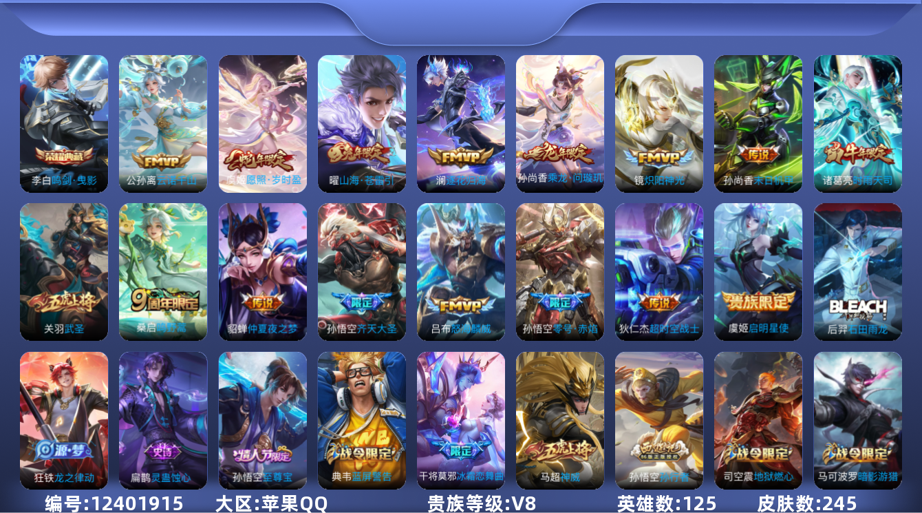 [12401915]【商品标题】:苹果Q-V8-最强王者段位-125英雄-245皮肤-1典藏-0珍品无双-0无双-0珍品传说-16传说-82史诗
