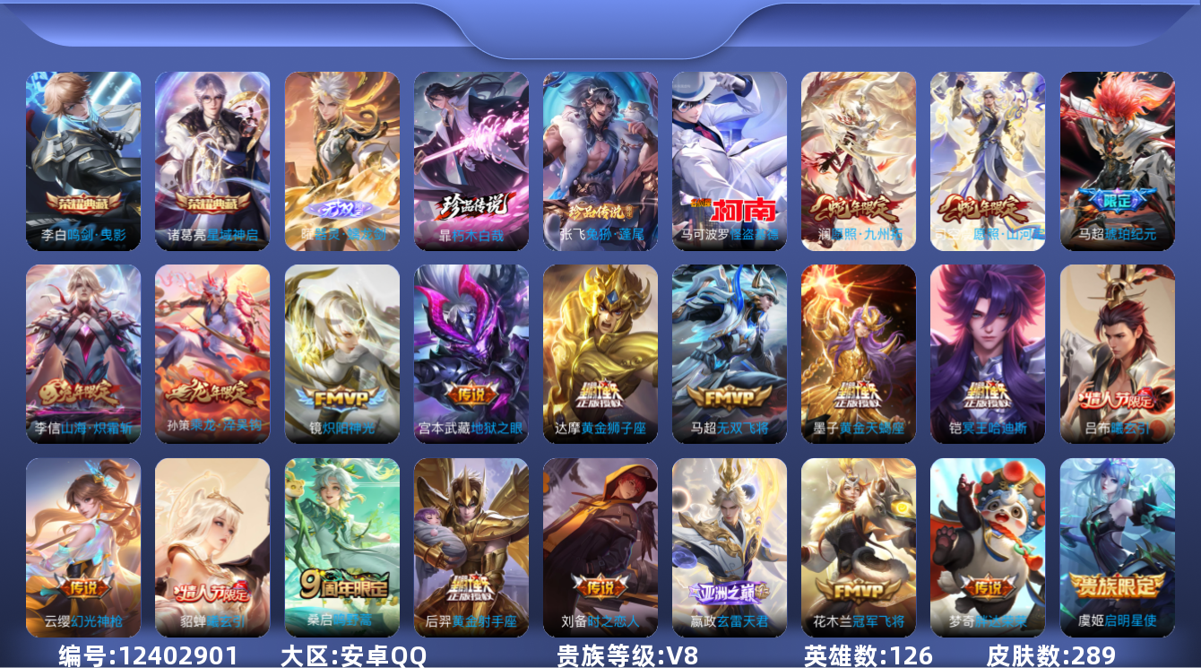 [12402901]【商品标题】:安卓Q-V8-最强王者段位-125英雄-278皮肤-2典藏-0珍品无双-1无双-3珍品传说-22传说-79史诗