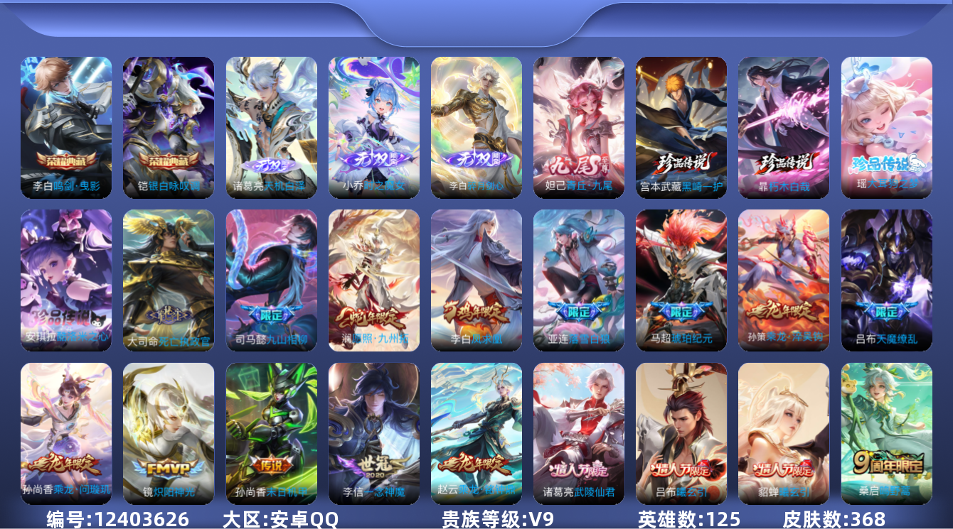 [12403626]【商品标题】:安卓Q-V9-永恒钻石II段位-125英雄-368皮肤-2典藏-0珍品无双-4无双-4珍品传说-29传说-103史诗