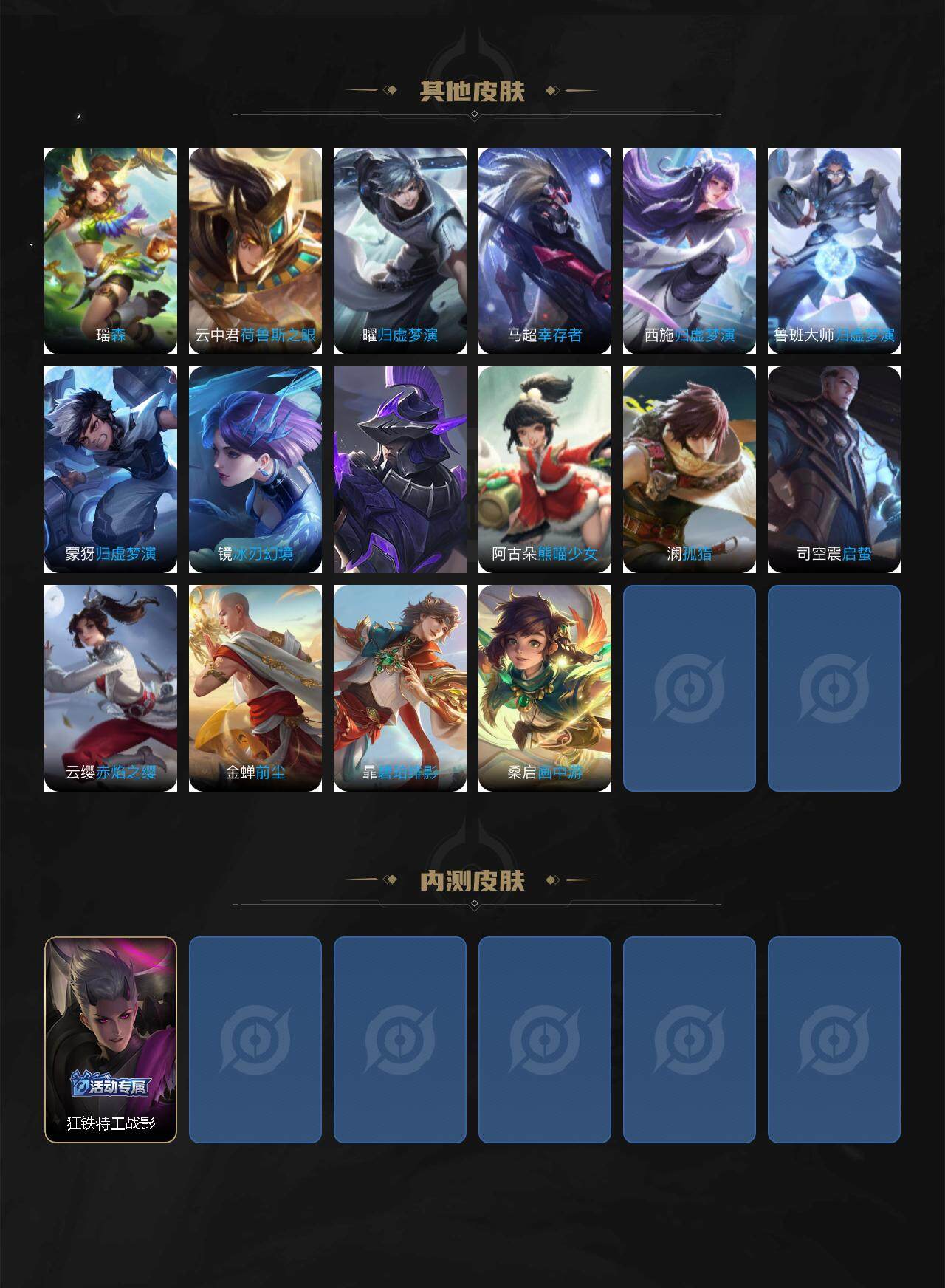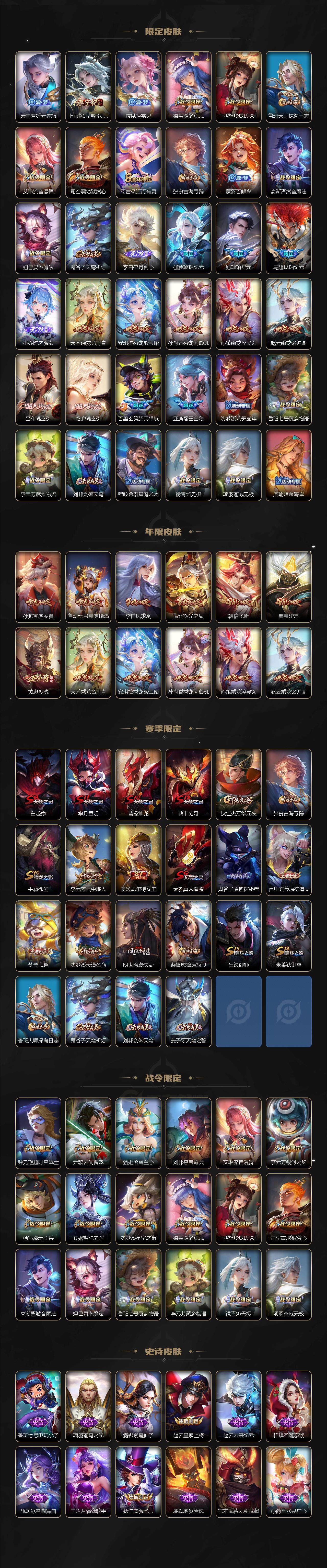 【限定皮肤】:白起狰,姜子牙天穹之誓,狄仁杰阴阳师,虞姬凯尔特女王,赵云皇家上将,墨子降魔,鲁班七号寅虎瑞焰,鲁班七号时之奇旅,庄周高山流水,钟无艳超时空战士,孙膑寅虎展翼,芈月重明,吕布天魔缭乱,元歌云间偶戏,元歌无心,夏侯惇匿光决锋者,甄姬游园惊梦,甄姬落雪兰心,曹操烛龙,典韦穷奇,典韦岱宗,狄仁杰魔术师,狄仁杰万华元夜,项羽海滩派对,关羽冰锋战神,刘邦夺宝奇兵,韩信逐梦之影,韩信飞衡,孙悟空至尊宝,孙悟空大圣娶亲,孙悟空孙行者,牛魔御旌,后羿辉光之辰,李元芳银河之约,李元芳云中旅人,虞姬霸王别姬,虞姬启明星使,杨玉环遇见飞天,杨戬潮玩骑兵,女娲朔望之晖,太乙真人饕餮,鬼谷子原初探秘者,鬼谷子五谷丰年,诸葛亮武陵仙君,黄忠烈魂,百里玄策原初追逐者,弈星混沌棋,梦奇顽趣,沈梦溪星空之诺,沈梦溪大漠名商,明世隐疑决卦,裴擒虎擒涛扼浪,狂铁御狮,米莱狄御霄,云中君纤云弄巧,上官婉儿神器万象笔,嫦娥拒霜思,嫦娥暖冬兔眠,西施玲珑珍味,鲁班大师探海日志,艾琳流音漫舞,司空震地狱燃心,阿古朵江河有灵,张良古海寻踪,蒙犽百解令,高渐离燃音魔法,妲己灵卜魔法,鬼谷子天穹祈灯,李白碎月剑心,伽罗琥珀纪元,铠琥珀纪元,马超琥珀纪元,小乔时之魔女,大乔乘龙忆丹青,安琪拉乘龙聚宝船,孙尚香乘龙问璇玑,孙策乘龙淬吴钩,赵云乘龙铭钟鼎,吕布曦玄引,貂蝉曦玄引,百里玄策超元猎域,亚连落
