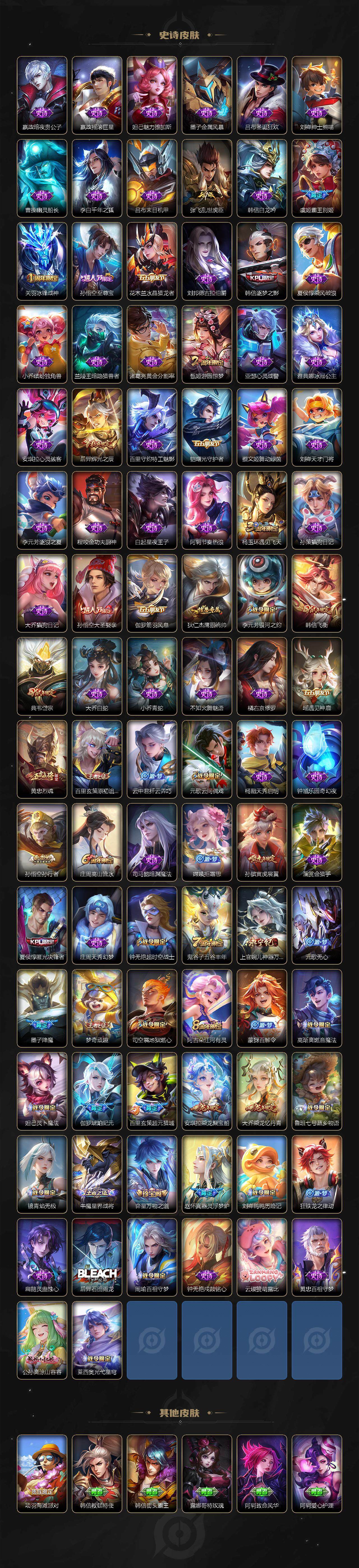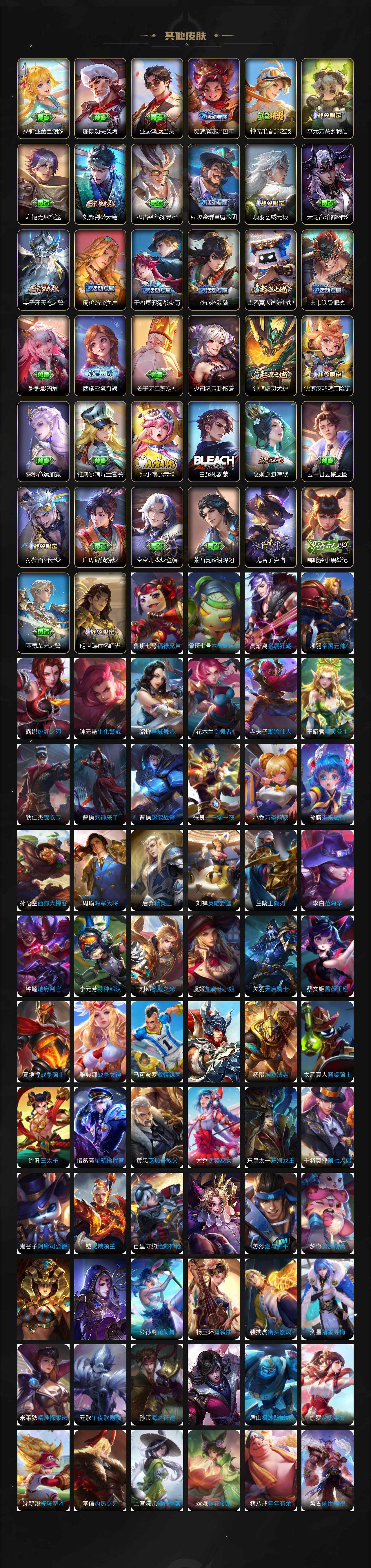小乔青蛇,大乔白蛇,瑶遇见神鹿,伽罗箭羽风息,李元芳逐浪之夏,不知火舞魅语,大乔猫狗日记,孙策猫狗日记,阿轲节奏热浪,露娜紫霞仙子,诸葛亮黄金分割率,王昭君偶像歌手,韩信白龙吟,项羽苍穹之光,雅典娜冰冠公主,吕布末日机甲,鲁班七号电玩小子,橘右京修罗,嬴政摇滚巨星,刘禅绅士熊喵,刘禅天才门将,白起星夜王子,安琪拉心灵骇客,程咬金功夫厨神,刘邦德古拉伯爵,兰陵王暗隐猎兽者,曹操幽灵船长,宫本武藏鬼剑武藏,司马懿暗渊魔法,亚瑟心灵战警,钟馗乐园奇幻夜,杨戬天秀·启明,蔡文姬舞动绿茵,廉颇地狱岩魂,小乔缤纷独角兽,夏侯惇乘风破浪,花木兰水晶猎龙者,铠曙光守护者,墨子金属风暴,百里玄策原初追逐者,吕布圣诞狂欢,貂蝉圣诞恋歌,百里守约特工魅影,嬴政暗夜贵公子,嫦娥拒霜思,李白千年之狐,澜赏金猎手,庄周天秀·幻梦,蒙犽百解令,高渐离燃音魔法,伽罗琥珀纪元,大乔乘龙·忆丹青,安琪拉乘龙·聚宝船,赵怀真器灵·浮梦炉