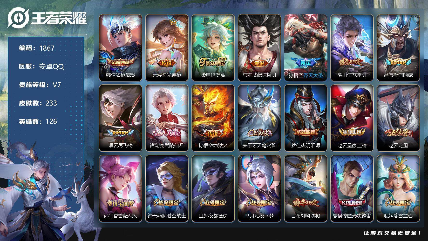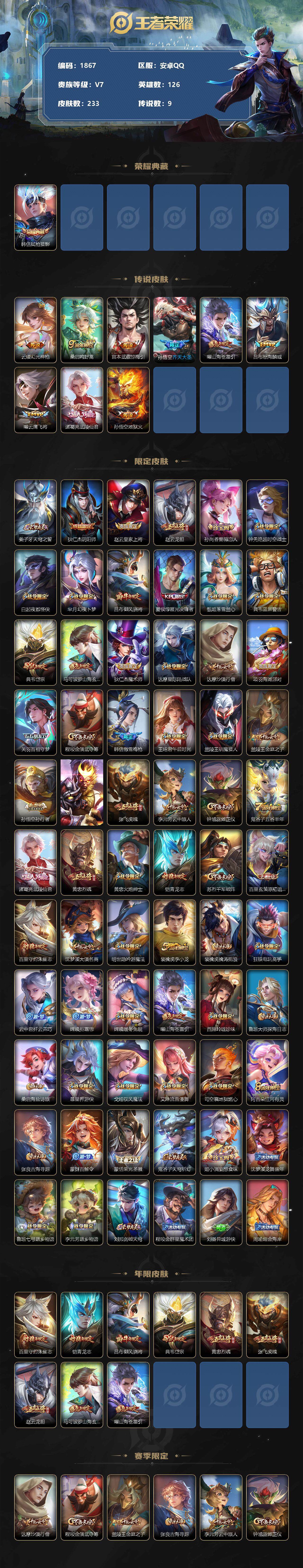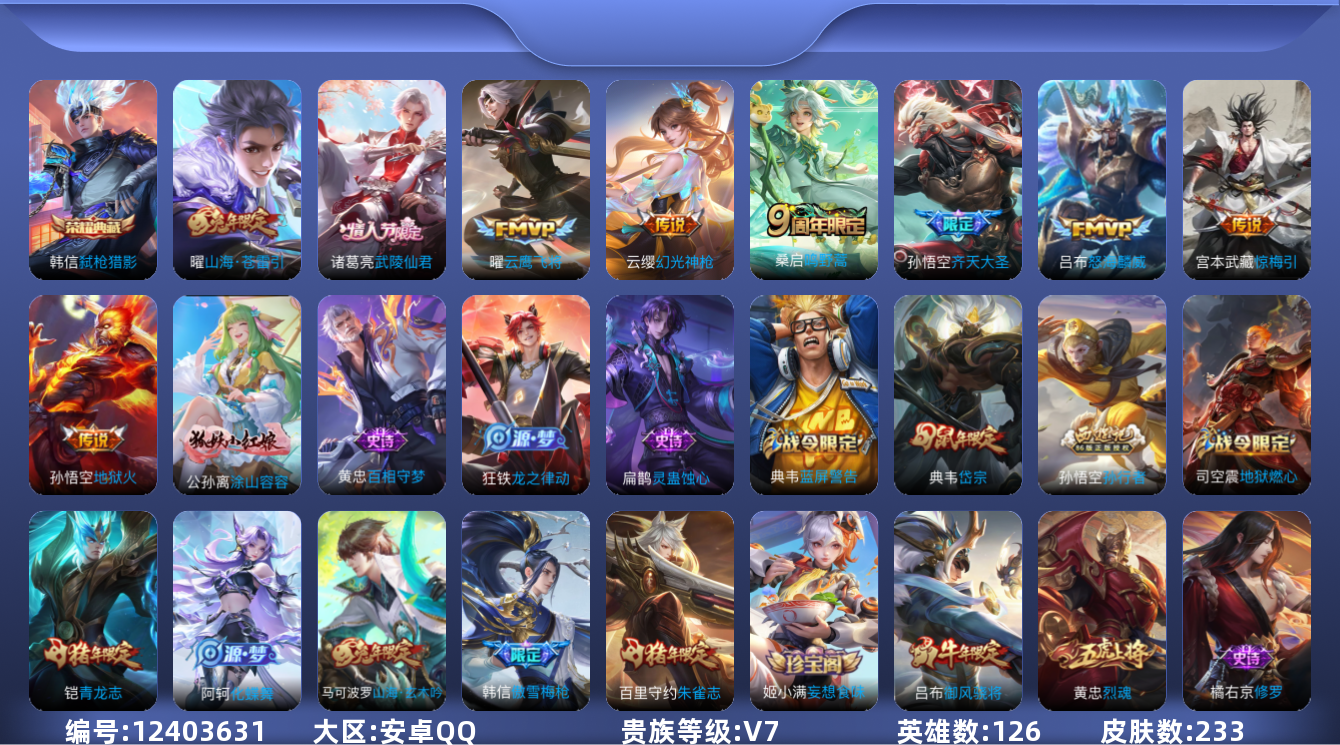 [12403631]【商品标题】:安卓Q-V4-永恒钻石I段位-126英雄-233皮肤-1典藏-0珍品无双-0无双-0珍品传说-9传说-76史诗