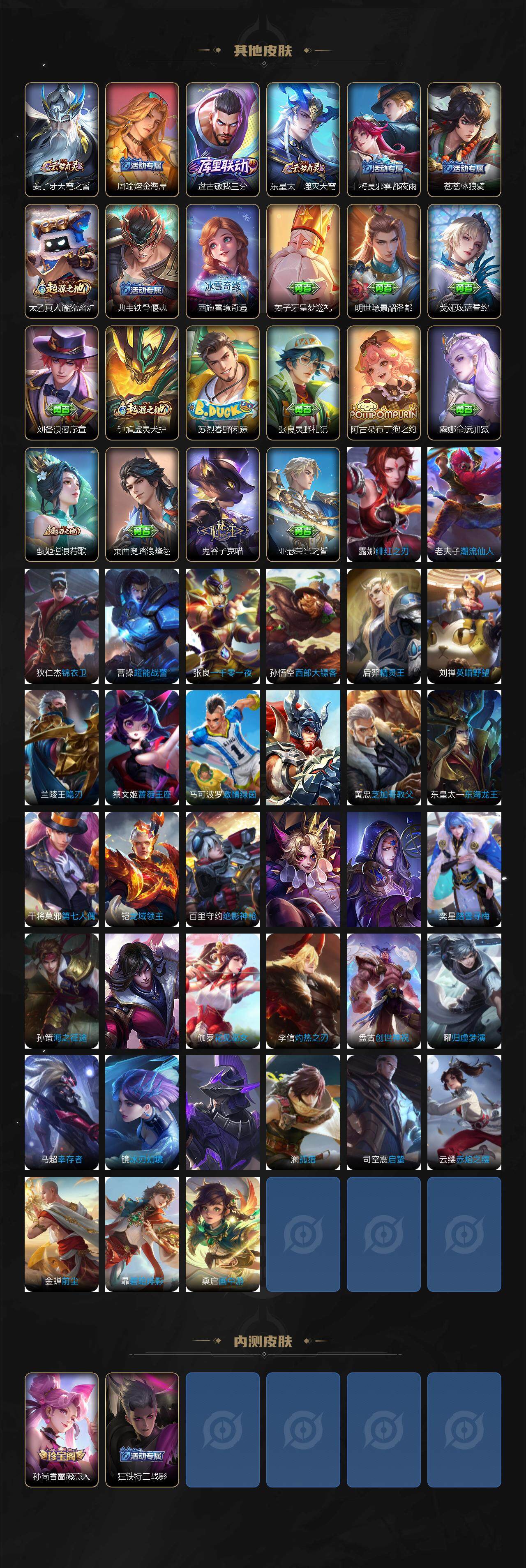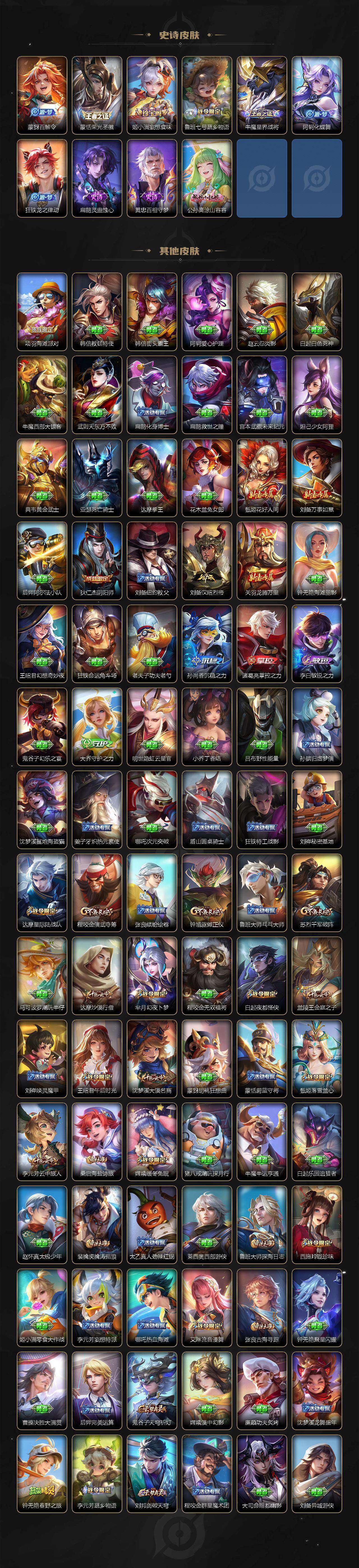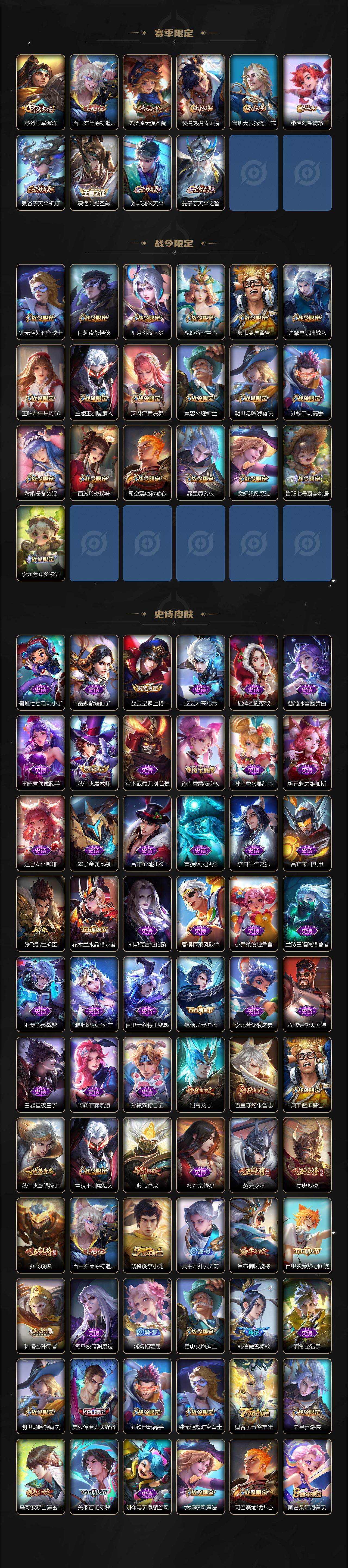 【限定皮肤】:姜子牙天穹之誓,狄仁杰阴阳师,赵云皇家上将,赵云龙胆,孙尚香蔷薇恋人,钟无艳超时空战士,白起夜都怪侠,芈月幻夜卜梦,吕布御风骁将,夏侯惇匿光决锋者,甄姬落雪兰心,典韦蓝屏警告,典韦岱宗,马可波罗山海玄木吟,狄仁杰魔术师,达摩星际陆战队,达摩沙漠行僧,项羽海滩派对,关羽百相守梦,程咬金演武夺筹,韩信傲雪梅枪,王昭君午后时光,兰陵王驯魔猎人,兰陵王金庭之子,孙悟空孙行者,孙悟空齐天大圣,张飞虎魄,李元芳云中旅人,钟馗驱傩正仪,鬼谷子五谷丰年,诸葛亮武陵仙君,黄忠烈魂,黄忠火炮绅士,铠青龙志,苏烈千军破阵,百里玄策原初追逐者,百里守约朱雀志,沈梦溪大漠名商,明世隐吟游魔法,裴擒虎李小龙,裴擒虎擒涛扼浪,狂铁电玩高手,云中君纤云弄巧,嫦娥拒霜思,嫦娥暖冬兔眠,曜山海苍雷引,西施玲珑珍味,鲁班大师探海日志,桑启海盐诗旅,暃星界游侠,戈娅驭风魔法,艾琳流音漫舞,司空震地狱燃心,阿古朵江河有灵,张良古海寻踪,蒙犽百解令,蒙恬荣光圣徽,鬼谷子天穹祈灯,姬小满妄想食味,沈梦溪龙舞盛年,鲁班七号蔬乡物语,李元芳蔬乡物语,刘邦剑破天穹,程咬金群星魔术团,刘备异域游侠,周瑜熔金海岸