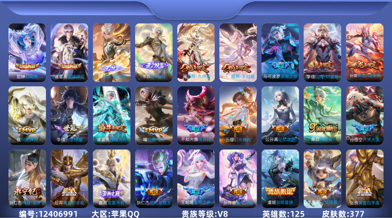 [12406991]【商品标题】:苹果Q-V8-永恒钻石II段位-125英雄-377皮肤-2典藏-0珍品无双-2无双-0珍品传说-24传说-106史诗