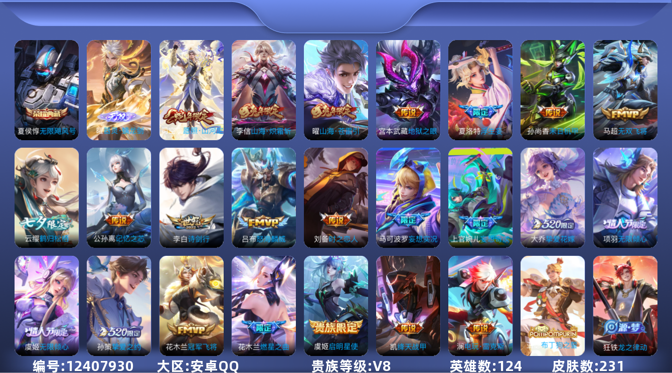 [12407930]【商品标题】:安卓Q-V8-永恒钻石IV段位-124英雄-231皮肤-1典藏-0珍品无双-1无双-0珍品传说-23传说-56史诗