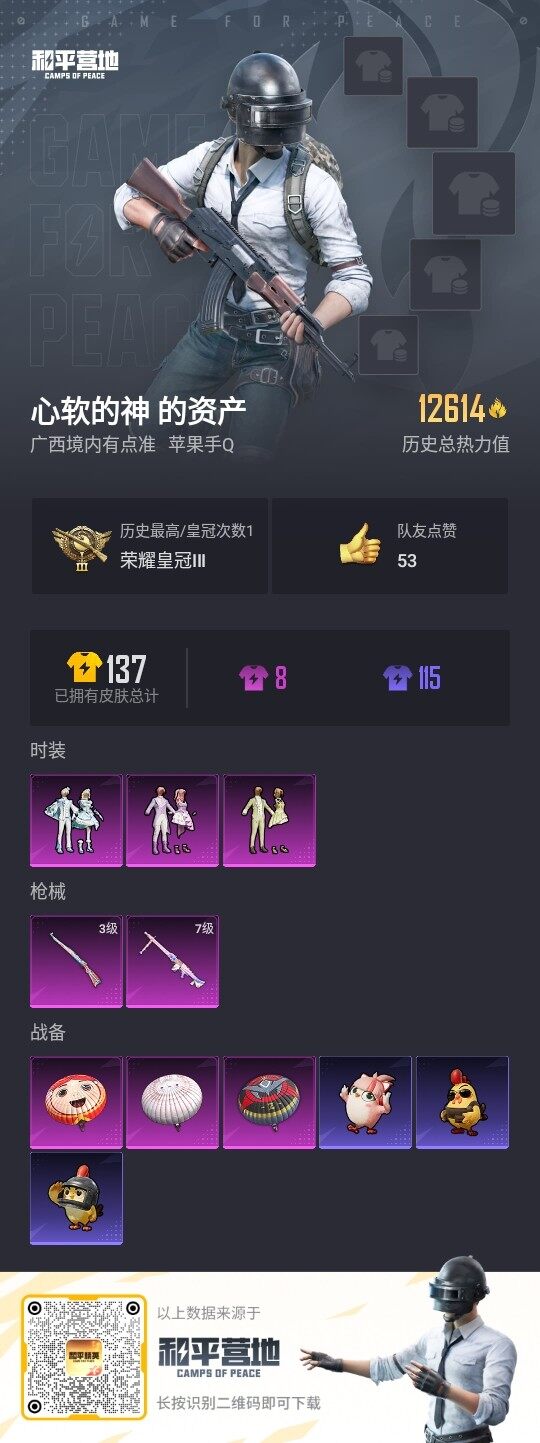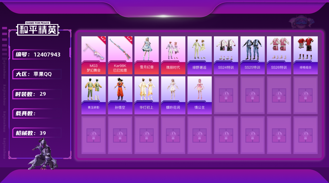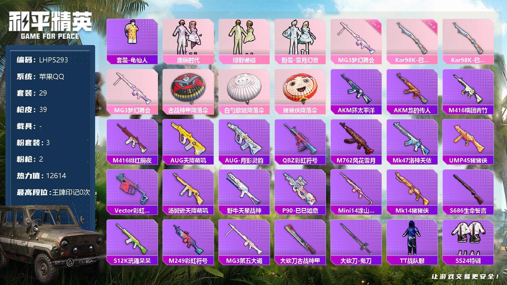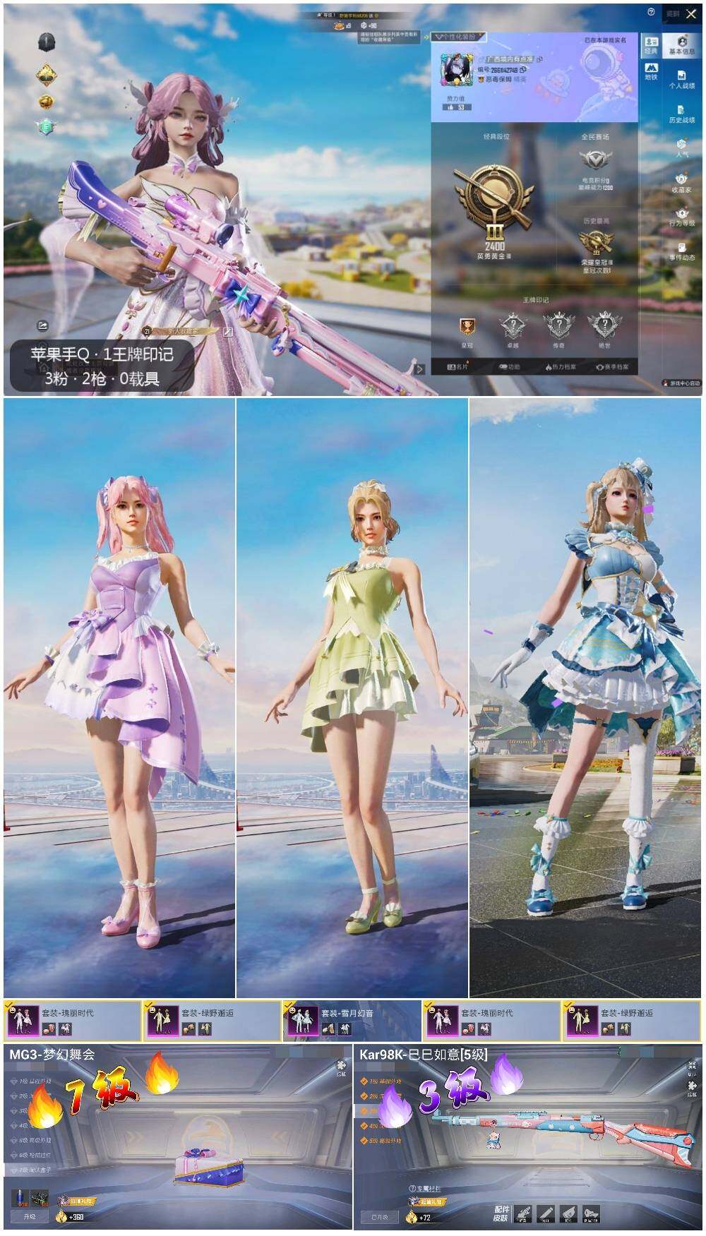 [12407943]【特价急出/详情看图】:苹果 手Q-3粉装-2特效枪-1.2w热力值-1王牌印记-29套装-39枪皮【热门品类】:套装-龟仙人【粉色套装】:粉装-瑰丽时代,粉装-绿野邂逅,粉装-雪月幻音【粉色枪皮等级】:Kar98K-巳巳如意(三级),MG3-梦幻舞会(七级)
