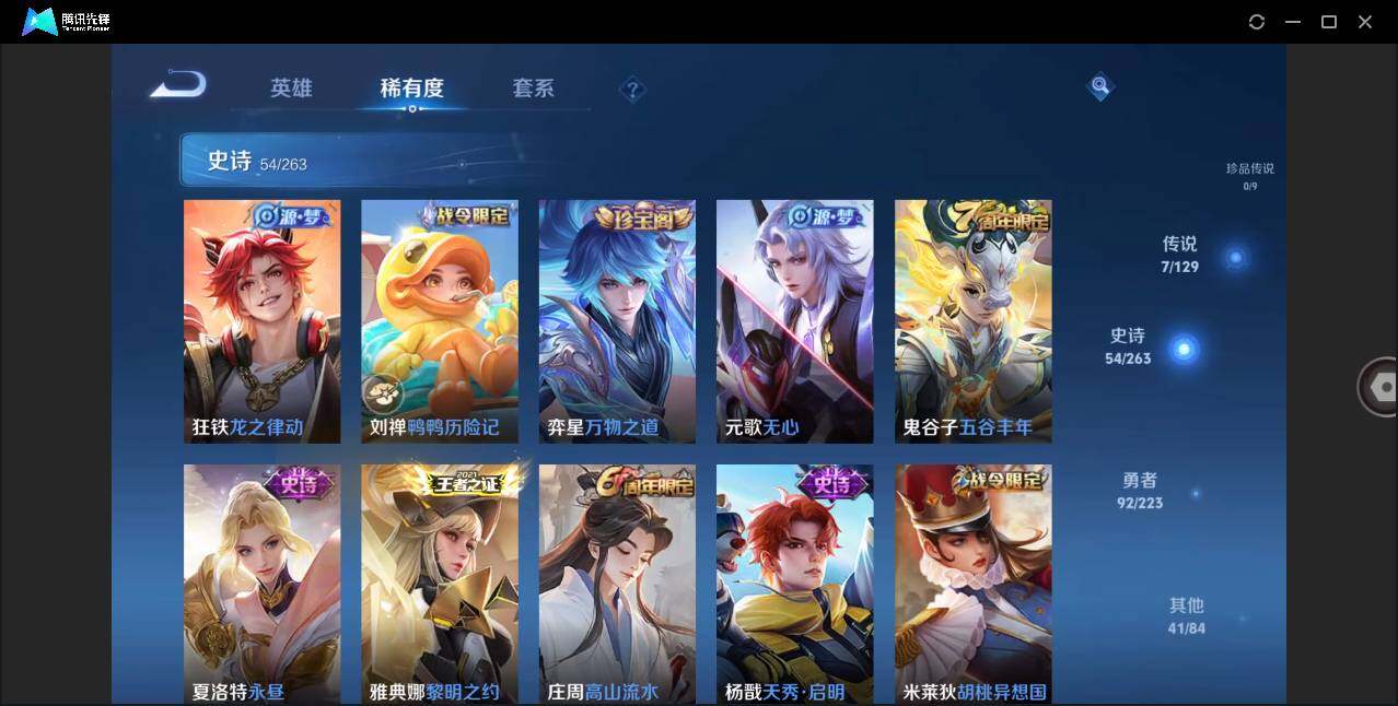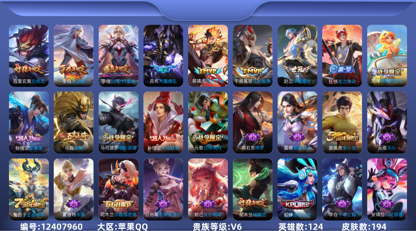 - [12296394]V8 2无双 1珍品传说 24传说 123英雄 255皮肤 可修改实名 优质装备:碎月剑心(李白无双),小乔时之魔女(小乔无双),怪盗基德,冠军飞将,云鹰飞将(小将军),绛天战甲(鸡嘴战神),黄金白羊座,一念神魔,云霓雀翎,末日机甲-孙尚香(绿蚂蚱),音你心动-小乔,飞鸢探春,音你心动-周瑜,乞巧织情,时之恋人-刘备(电焊工),游龙清影(小青龙),淬星耀世,碎云,惊梅引,遇见神鼓,琥珀纪元铠,琥珀纪元马超 传说皮:典韦战鼓燎原,幻光神枪 珍宝阁皮:玩趣恶龙 限定皮:逐霄战戟,鸣野蒿,玄嵩(庄周年限),匿光决锋者,怒海麟威,五谷丰年,幽恒(沐浴露),烈魂,岱宗(典韦年限),辉光之辰,奇迹圣诞,孙行者,猪悟能 史诗皮:器灵·浮梦炉,化蝶舞,龙之律动,琥珀纪元伽罗,蔬乡物语(鲁班七号),百相守梦-黄忠,织梦人,紫霞仙子,千年之狐,末日机甲-莱西奥,魅语,百解令(蒙犽),青蛇,偶像歌手,白蛇,末日机甲-吕布,猫狗日记-孙策,乱世虎臣,节奏热浪,女仆咖啡,摇滚巨星,水果甜心,天才门将,星夜王子,心灵骇客,德古拉伯爵,暗隐猎兽者,幽灵船长,鬼剑武藏,舞动绿茵,纤云弄巧,拒霜思,缤纷独角兽,乘风破浪,箭羽风息,金属风暴,圣诞狂欢,圣诞恋歌,鹰眼统帅,魅力维加斯